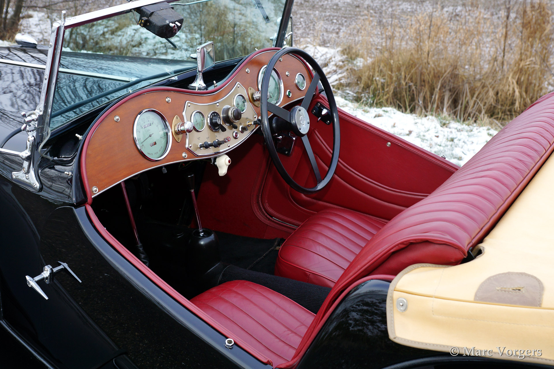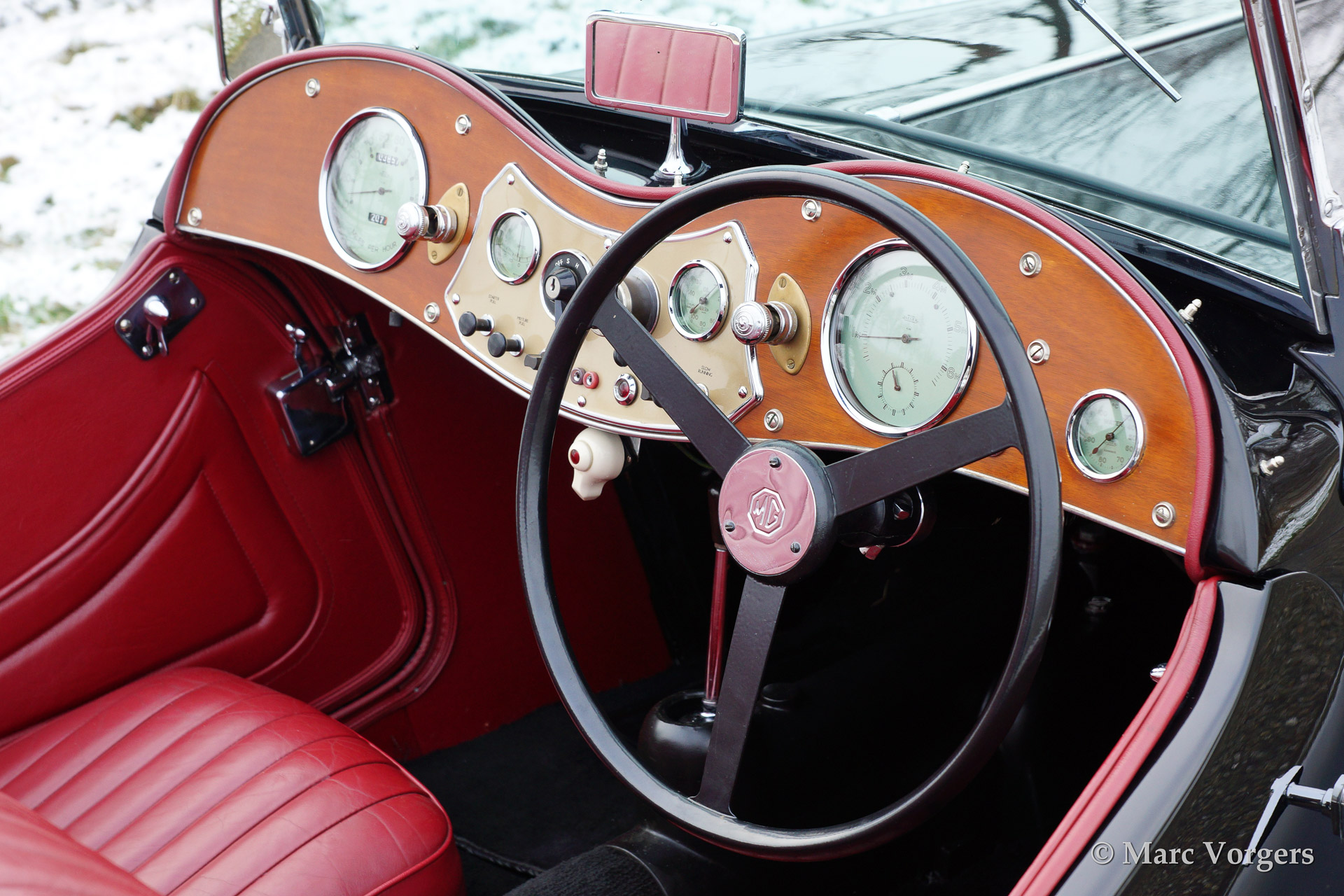 MG TC, year 1947. Colour black with a dark red leather interior. Beige hood and hood cover and tonneau cover. This beautiful MG TC was extensively restored to factory specifications. The automobile features wire wheels with Dunlop tires, original Lucas lamps and mirrors and an aluminium rocker cover.