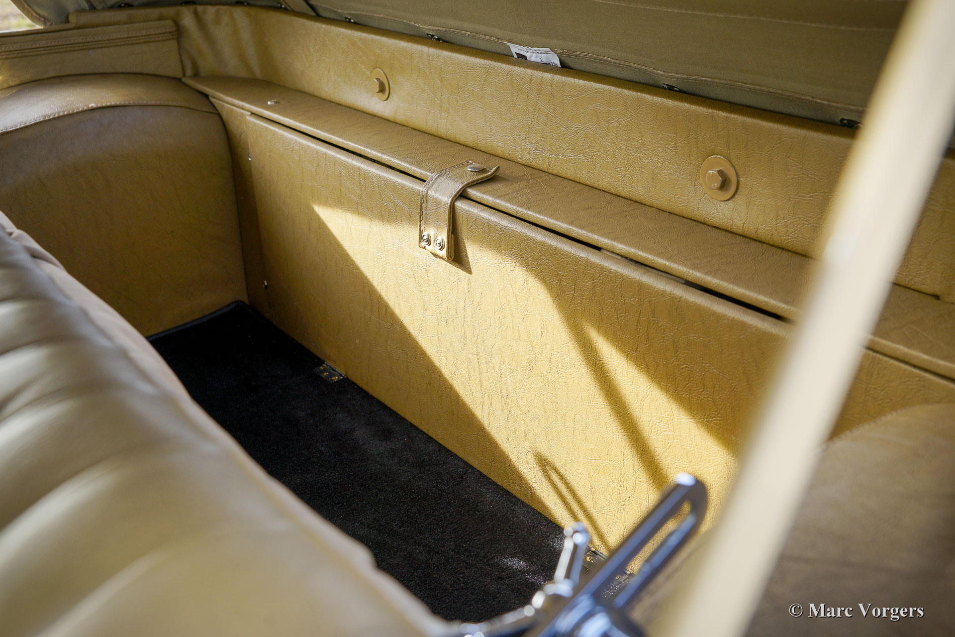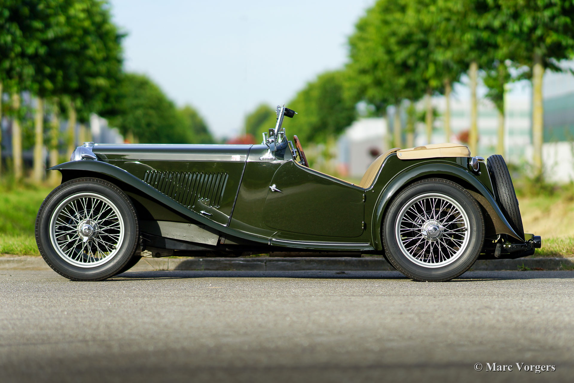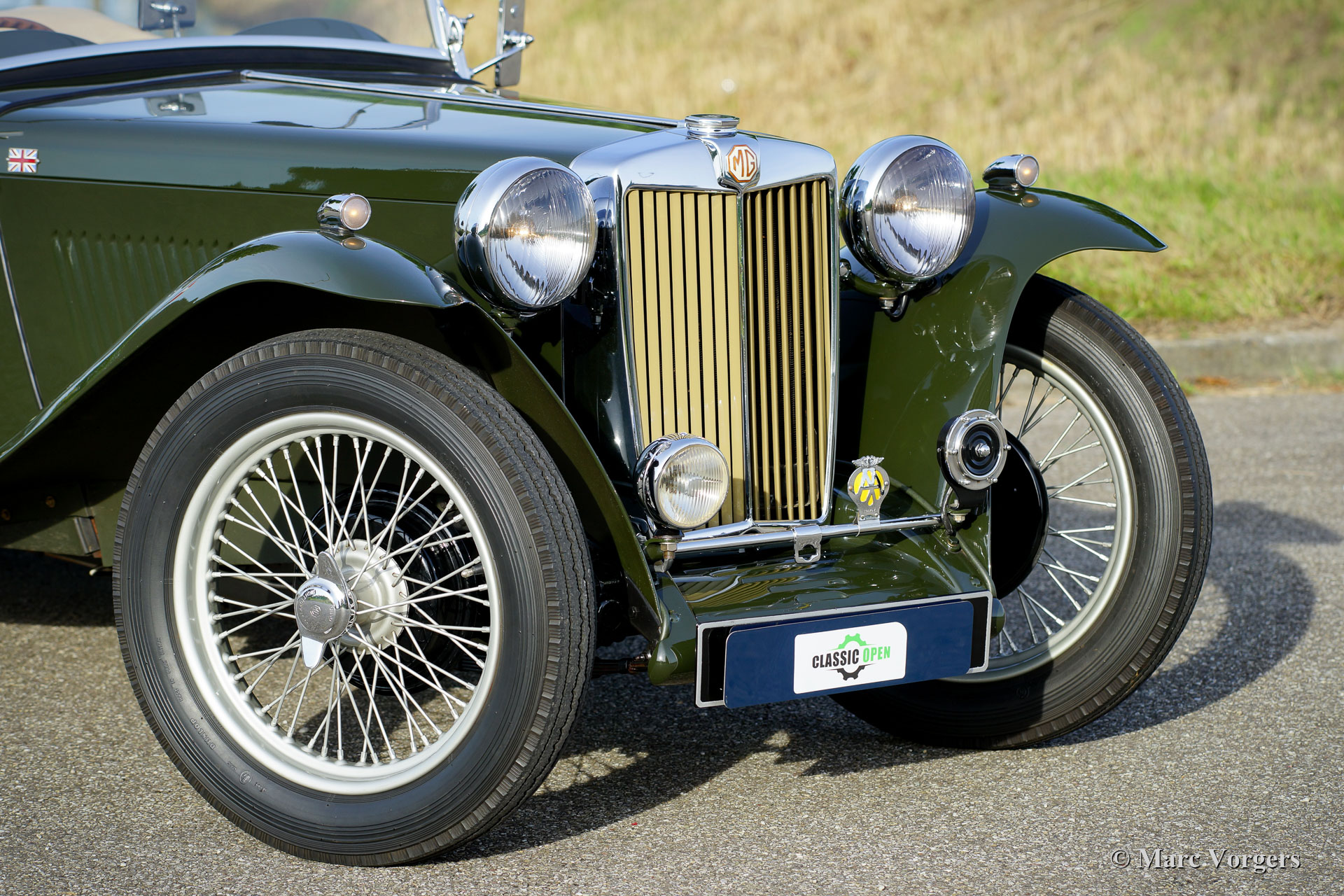 The MG TC was the first new post-war MG. The TC was introduced in 1945, and based on the pre-war TB, it was very similar. A major improvement to the TC was the larger interior, which was increased by 10 cm. The design was similar to the pre-war TB, with swept separate wings, large 19-inch wire wheels and a folding windshield. The MG TB/TC series were much admired by the American soldiers who were on the point of returning to America; this type of small sports car with its smooth handling, was not yet known in America. As a result, many TBs and TCs were shipped to America, and also the MG TC was in great demand at the other side of the pond. All TCs had right-hand steering, leaf springs all around and a 54 bhp four-cylinder engine. In 1950, the MG TC was succeeded by the MG TD.
