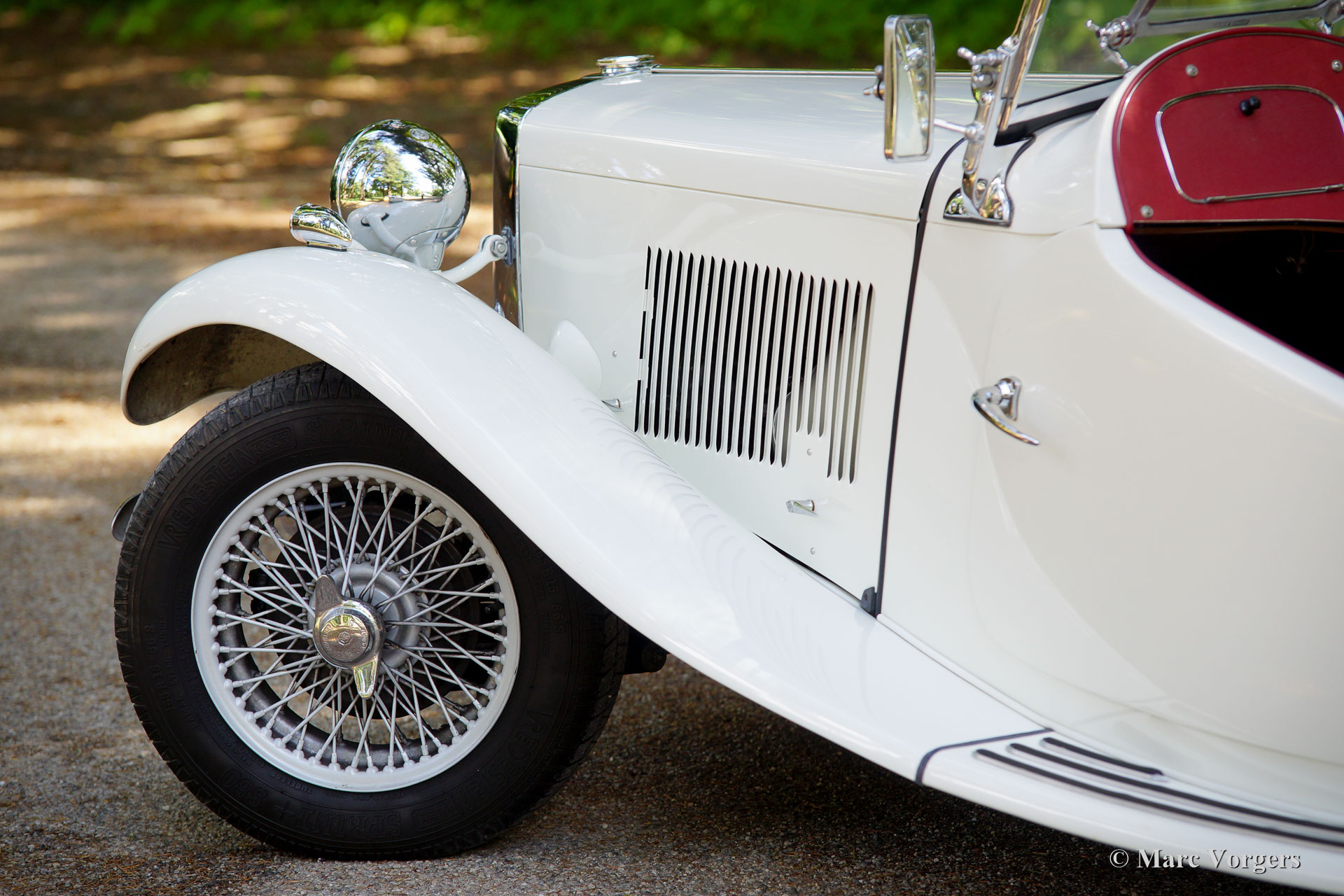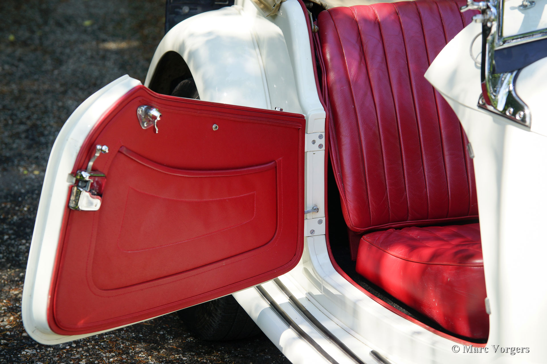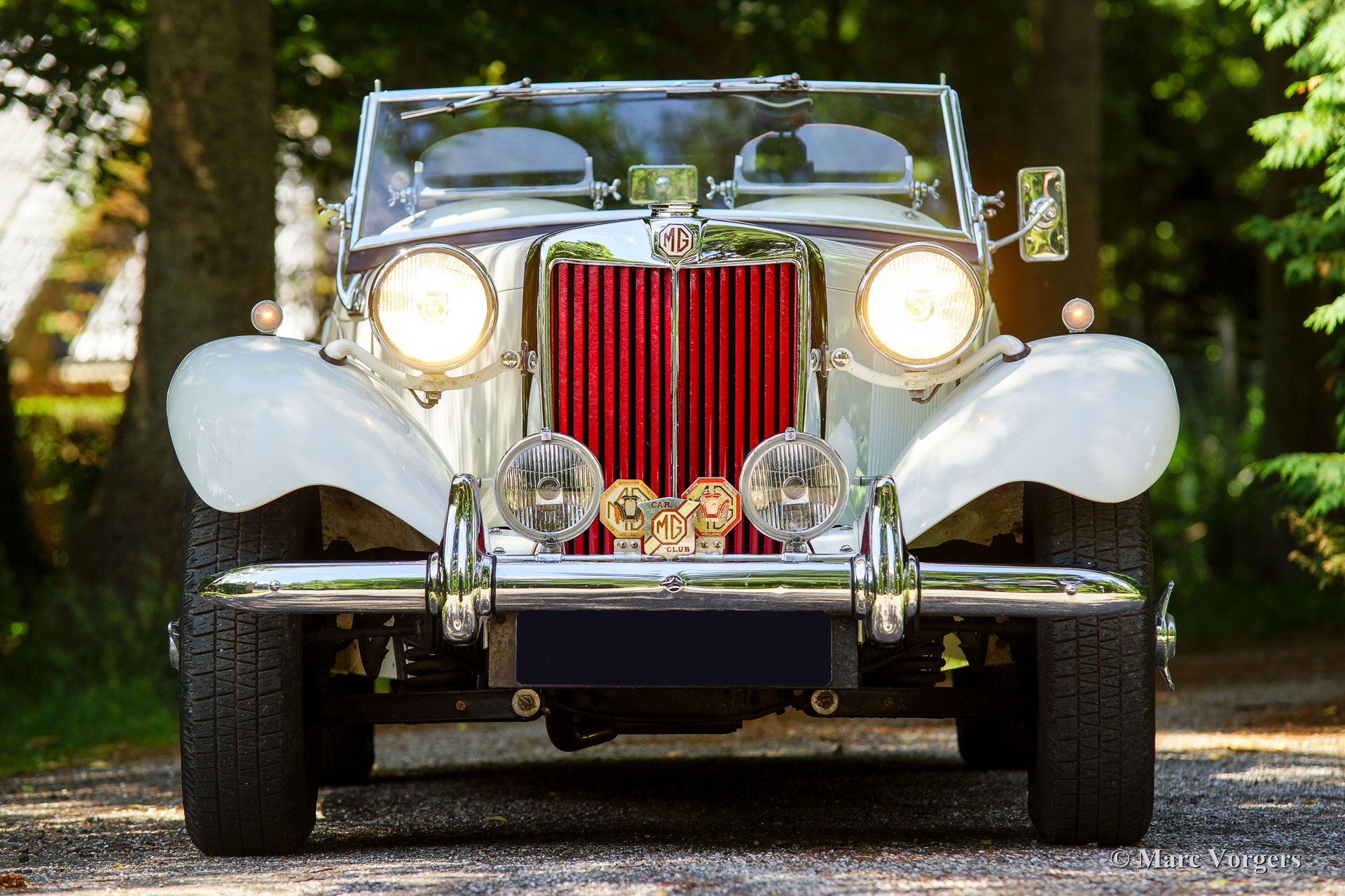 MG TD, Jahr 1950. Farbe Weiß (Old English White) mit einem roten Leder Interieur. Diese wunderschöne MG TD wurde ausgiebig ‘Nut & Bolt‘ restauriert von renommierten niederländischen MG Restauratoren Henk Oudenaar und Teun Hoogmoed einige Jahre her. Während der Restauration wurde der Aschekörperrahmen erneuert und der Motor wurde während des Überholprozesses etwas abgestimmt (‘tuned‘). Der Motor erhielt Titan-Pleuel und größere Ventile. Dies erhöht die Leistung im modernen Verkehr. Diese schöne MG TD ist in einem sehr guten Zustand und das Auto fährt perfekt. Das Auto verfügt über silber lackierte Draht Speichen Räder und einen Kilometerzähler in km / h. Das Auto kommt komplett mit seiner alten niederländischen Registrierung (Leinen) und der Original-Bedienungsanleitung.