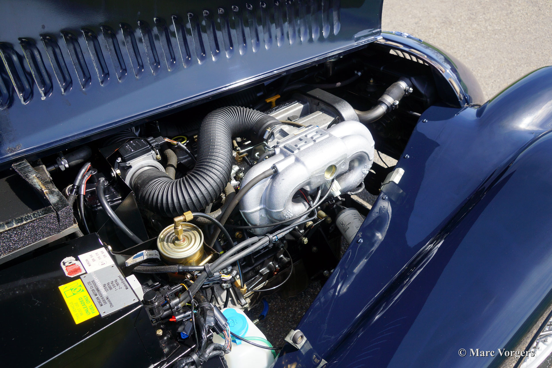 The Morgan 4/4 was built for 50 years. the first model, introduced in the year 1936 was the 4/4 with flat radiator which was built until the year 1951. After a four year break (only the Morgan plus 4 was built those years) the Morgan 4/4 was going to be rebuild. The car did not change a lot (conservative as they are at the Morgan company), only the shape of the radiator changed from flat to cowled. Morgan never built their own engine, the early flat radiator cars were powered by Standard or Ford engines. The cowled radiator models were powered by Ford engines. The Ford engine used was known as the "Kent" engine and was also used in Fords Cortina model. Morgan 4/4 1600 cars were powered by the 1599 cc. Ford Kent engine which had a standard capacity of 98 bhp. giving the light car (two seater 660 kg./ four seater 785 kg.) sporty performance. The cars were fitted with a four speed manual gearbox. The modern Morgan 4/4 models are powered by a Ford Zetec 16V engine. These cars feature petrol injection and a five speed manual gearbox. The Morgan 4/4 is a very special car to drive because it has it's own strong character. It cannot be compared with any other roadster or convertible.