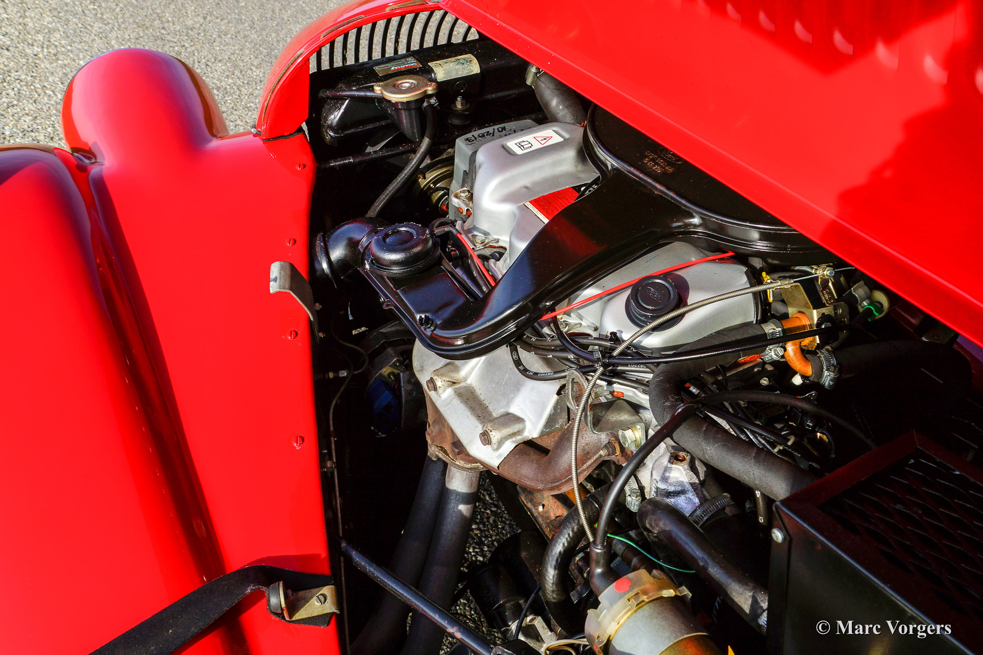 The Morgan 4/4 was built for 50 years. the first model, introduced in the year 1936 was the 4/4 with flat radiator which was built until the year 1951. After a four year break (only the Morgan plus 4 was built those years) the Morgan 4/4 was going to be rebuild. The car did not change a lot (conservative as they are at the Morgan company), only the shape of the radiator changed from flat to cowled. Morgan never built their own engine, the early flat radiator cars were powered by Standard or Ford engines. The cowled radiator models were powered by Ford engines. The Ford engine used was known as the "Kent" engine and was also used in Fords Cortina model. Morgan 4/4 1600 cars were powered by the 1599 cc. Ford Kent engine which had a standard capacity of 98 bhp. giving the light car (two seater 660 kg./ four seater 785 kg.) sporty performance. The cars were fitted with a four speed manual gearbox. The modern Morgan 4/4 models are powered by a Ford Zetec 16V engine. These cars feature petrol injection and a five speed manual gearbox. The Morgan 4/4 is a very special car to drive because it has it's own strong character. It cannot be compared with any other roadster or convertible.