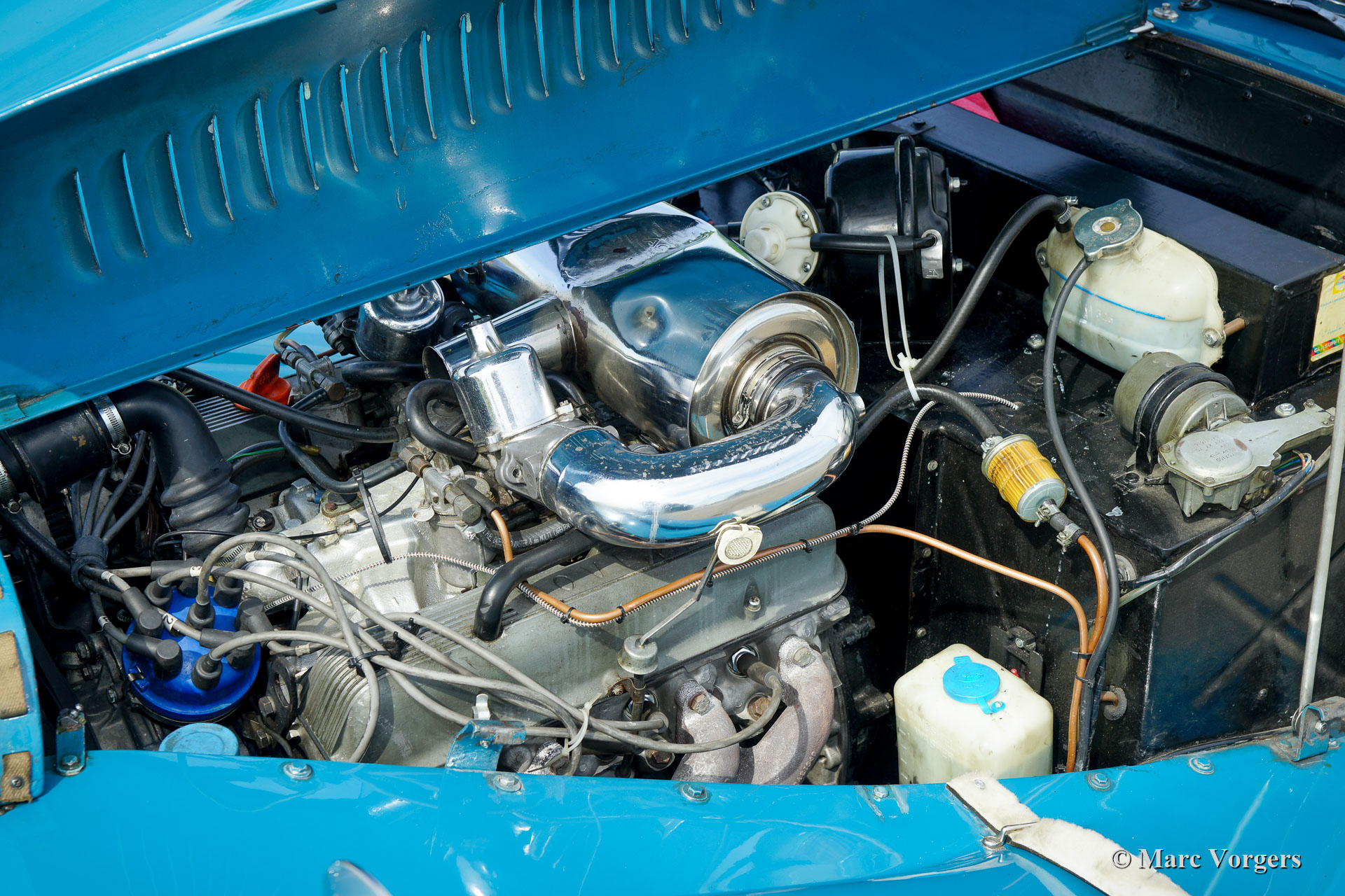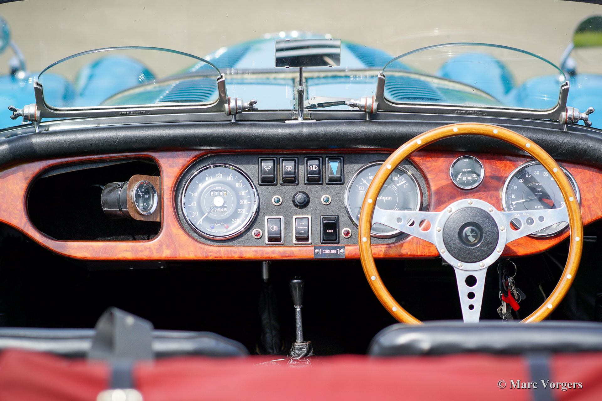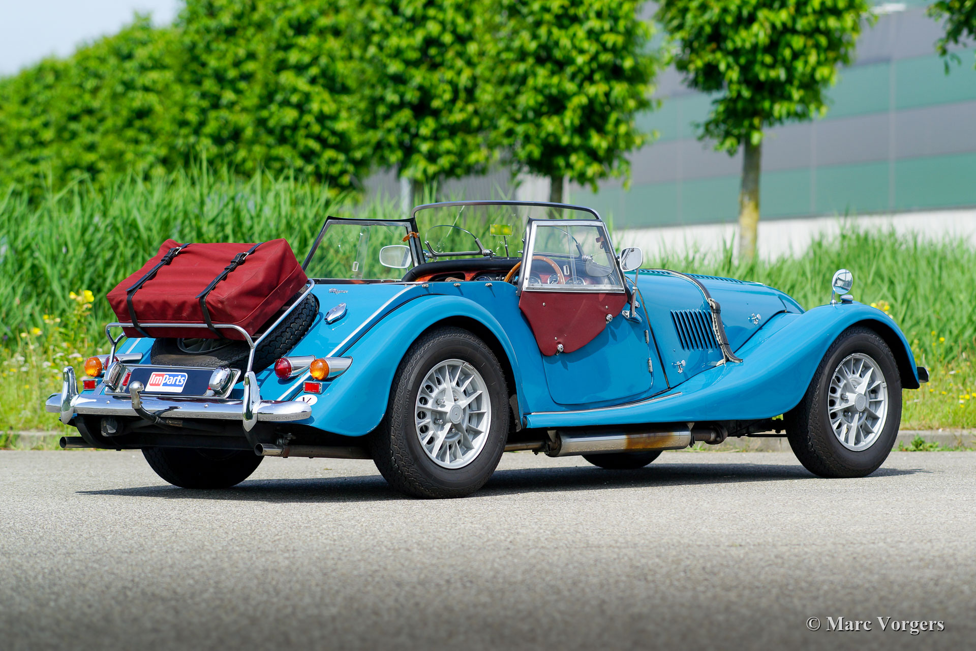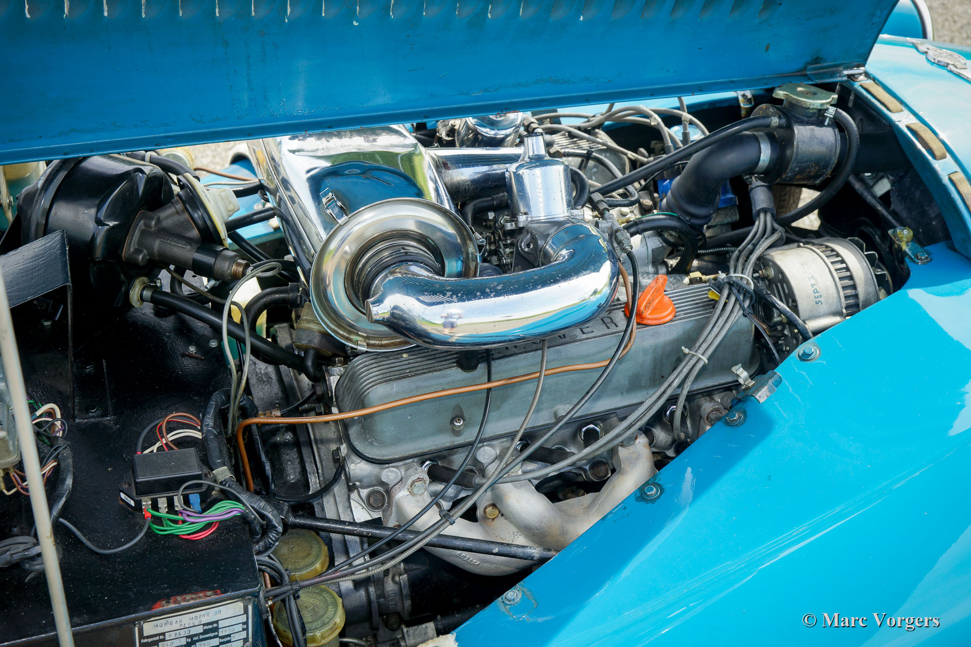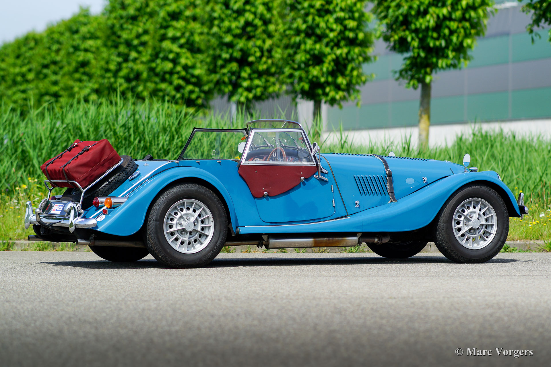 Morgan +8, Jahr 1972. Farbe blau, kombiniert mit einer schwarzen Lederausstattung und burgunderfarbener Wetterausstattung (Verdeck, Seitenfenster und Kofferabdeckung). Dies ist ein wunderschöner und super origineller, früher, ‘narrow body‘, Morgan +8. Das Auto wird vom legendären Rover 3500 V8-Motor angetrieben. Der letzte Besitzer schätzt den Morgan seit 13 Jahren. Das Auto ist in einem sehr guten und super Originalzustand und das Auto wurde perfekt gewartet. In den letzten 13 Jahren wurden Motor und Getriebe überholt, die ‚king-pins‘ der Vorderradaufhängung erneuert und ein neuer Kabelbaum eingebaut. Die Motorkühlung wurde verbessert durch den Einbau eines zusätzlichen elektrischen Lüfters (mit Armaturenbrettschalter) und eines Ölkühlers. Der Innenraum wurde zur gleichen Zeit mit Wetterausrüstung neu gefüttert. Der größte Teil der Arbeiten und der gesamte Service wurden von Imparts ausgeführt. Dieser prächtige Morgan verfügt über eine verchromte Gepäckablage mit passendem Koffer, ein MotoLita-Sportlenkrad mit Holzkranz, zwei an den Türen angebrachte Rückspiegel, einen Edelstahlauspuff, zusätzliche breitstrahlende scheinwerfer an der Vorderseite, die wundervolle Original 15 Zoll-Leichtmetallfelgen und ein Ledergürtel über der Motorhaube. Ein Morgan +8 ist ein begehrter britischer Sportwagen, der viel Fahrspaß bringt. Der kraftvolle V8-Motor ist eine Freude und der Motorsound macht süchtig!
