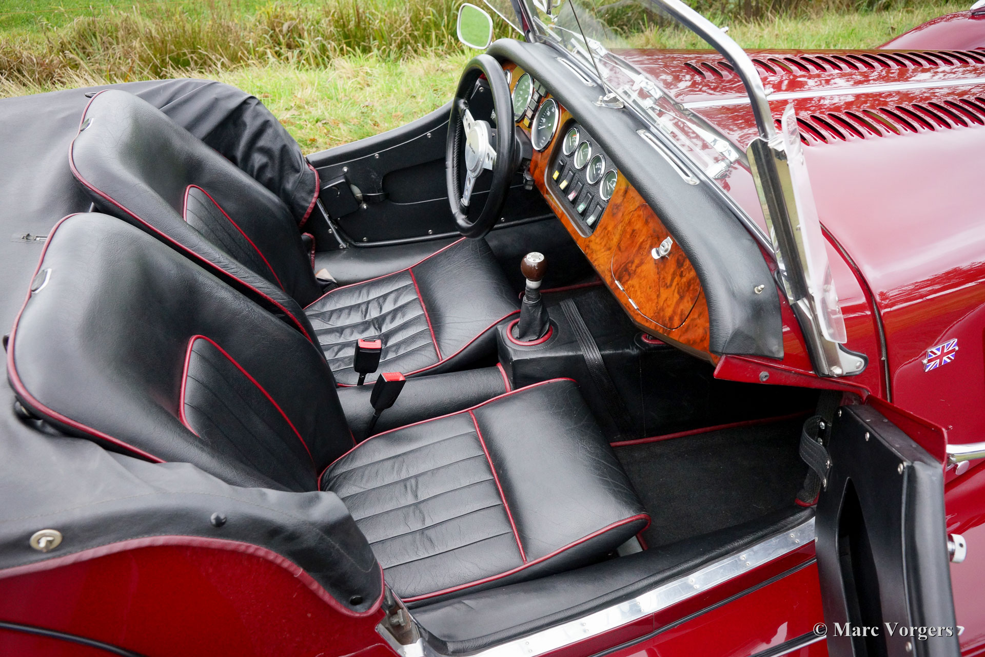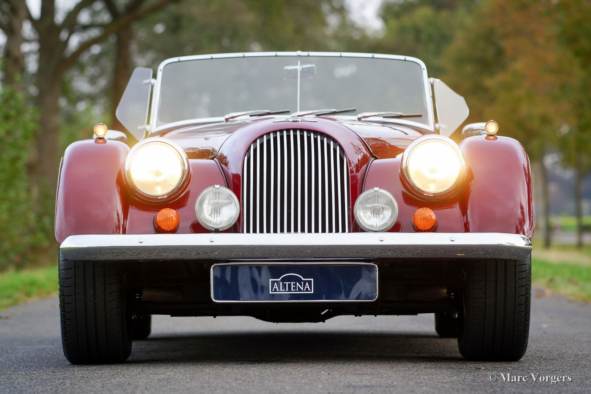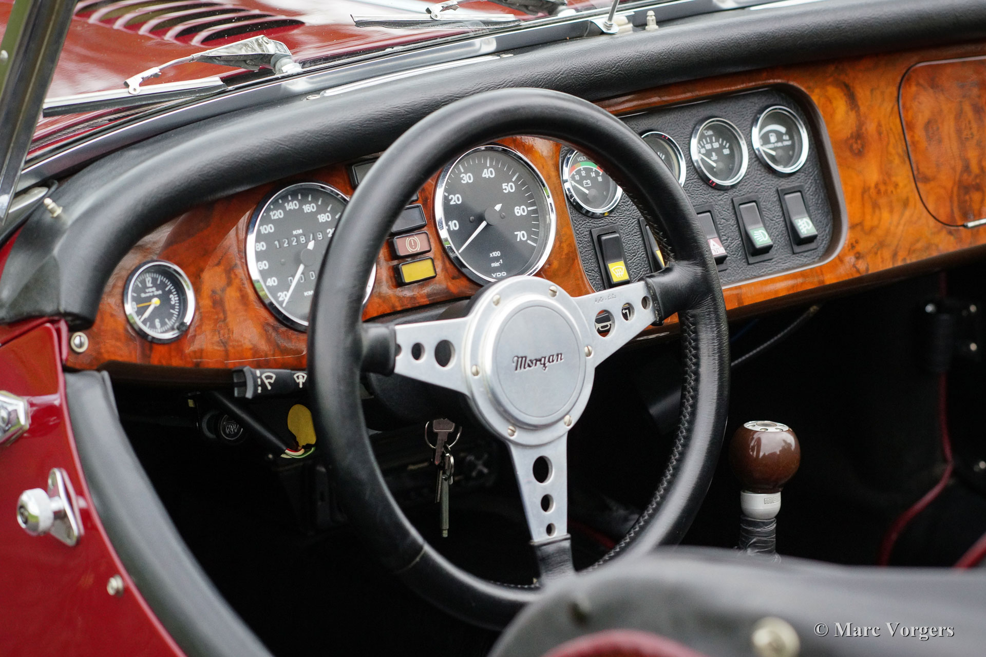Morgan +8 'wide body', Jahr 1995. Fahrgestellnummer R1132X. Farbe dunkelrot mit einem schwarzen Lederinterieur. Dieser sehr beeindruckende Morgan +8 'wide body' ist in einem hervorragenden Zustand und das Auto fährt perfekt! Das geringe Gewicht (ca. 1000 kg) kombiniert mit dem leistungsstarken Rover V8-Motor (ca. 200 PS) ist ein großartiges Rezept für viel Fahrspaß! Diese Morgan +8 'wide body' verfügt über die originalen breiten Chrom Speichen Räder, einen Auspuffkrümmer aus rostfreiem Edelstahl, zusätzliche Lampen an der Vorderseite, eine verchromte Gepäckablage und eine spezielle Regenschirmhalterung über der hinteren Stoßstange. Die Morgan +8 'wide body' ist ein seltenes Auto, knapp über 350 Exemplare wurden gebaut. Ein Morgan ist nicht nur ein klassisches Auto oder ein moderner Klassiker; Morgan ist eine Lebensart!