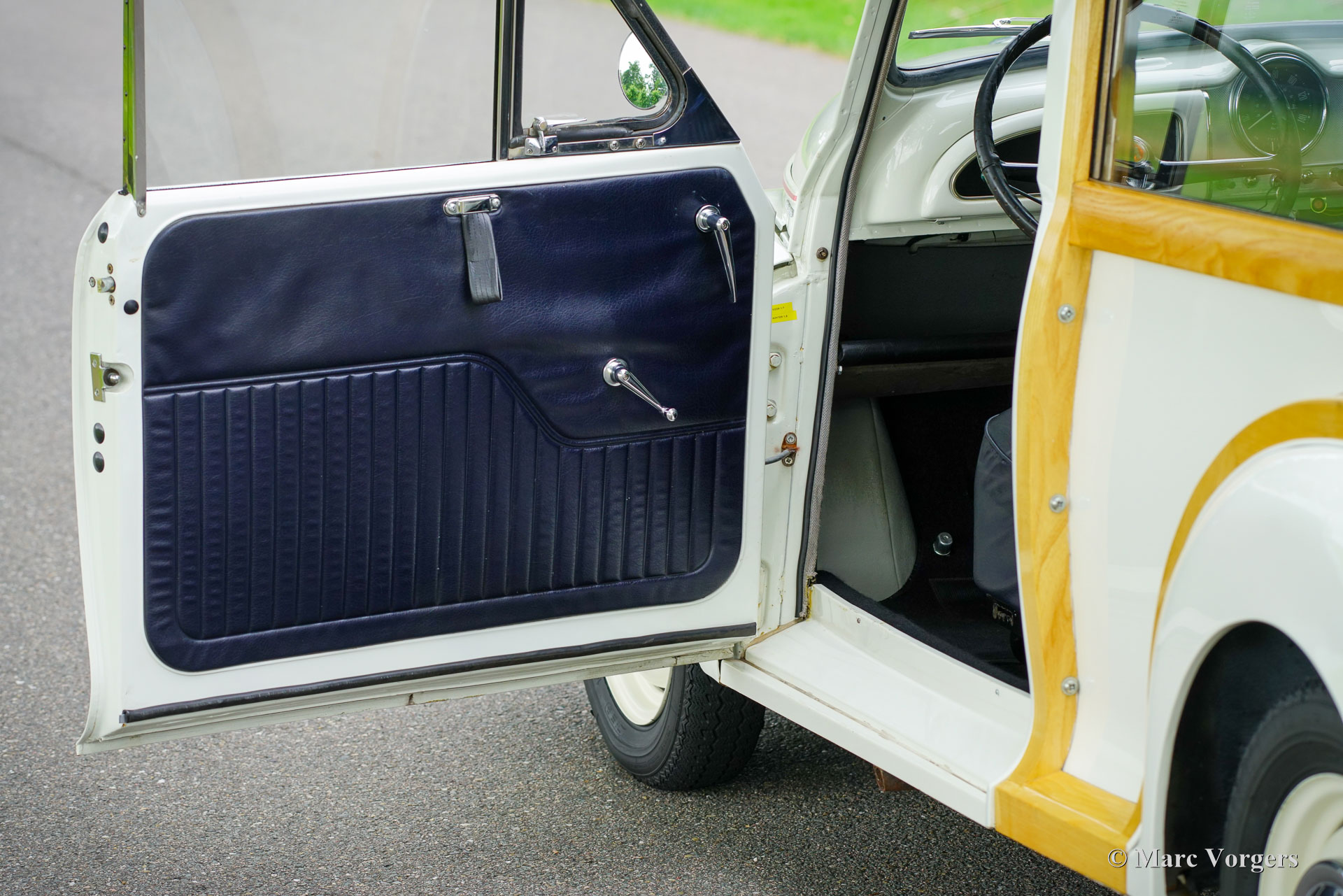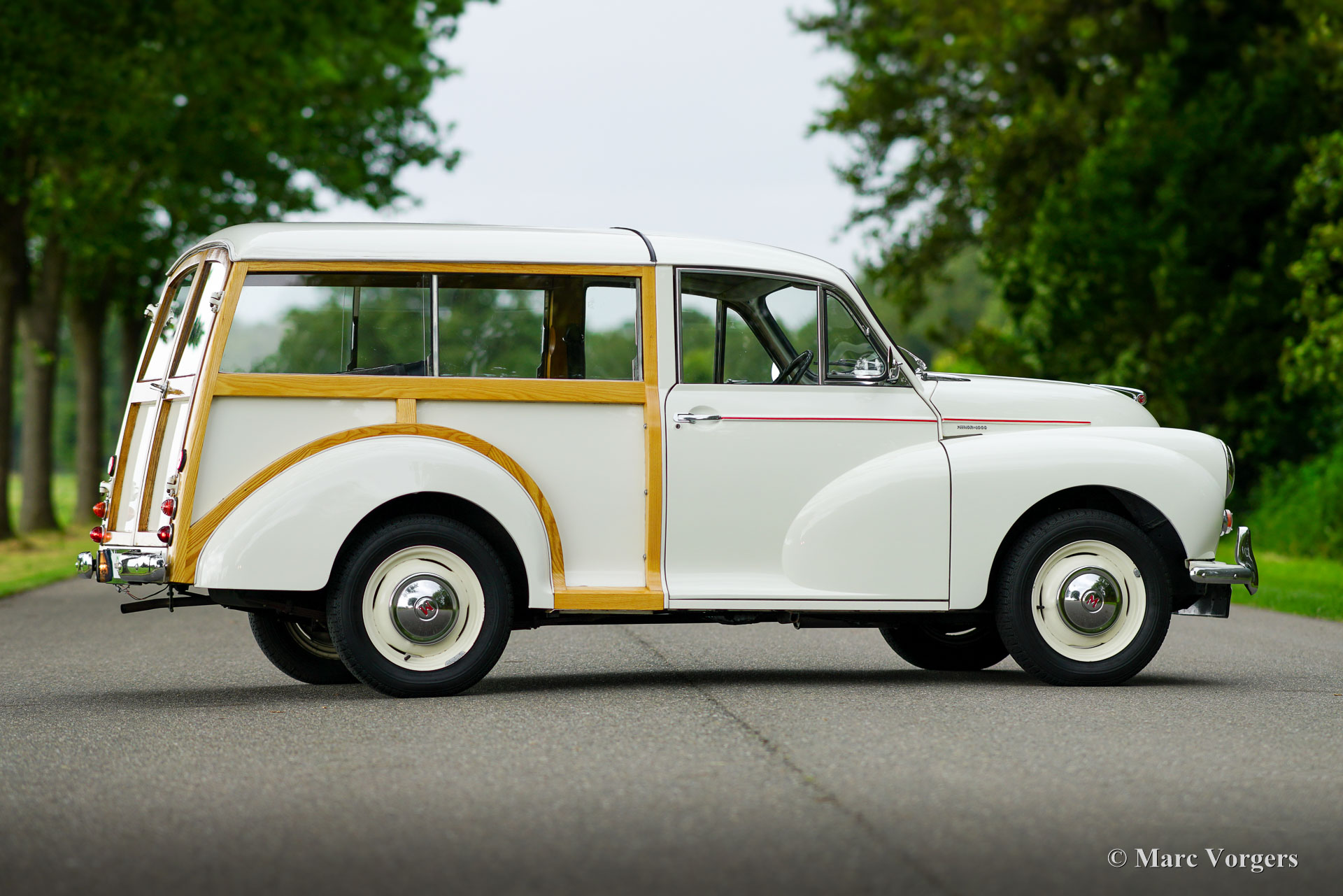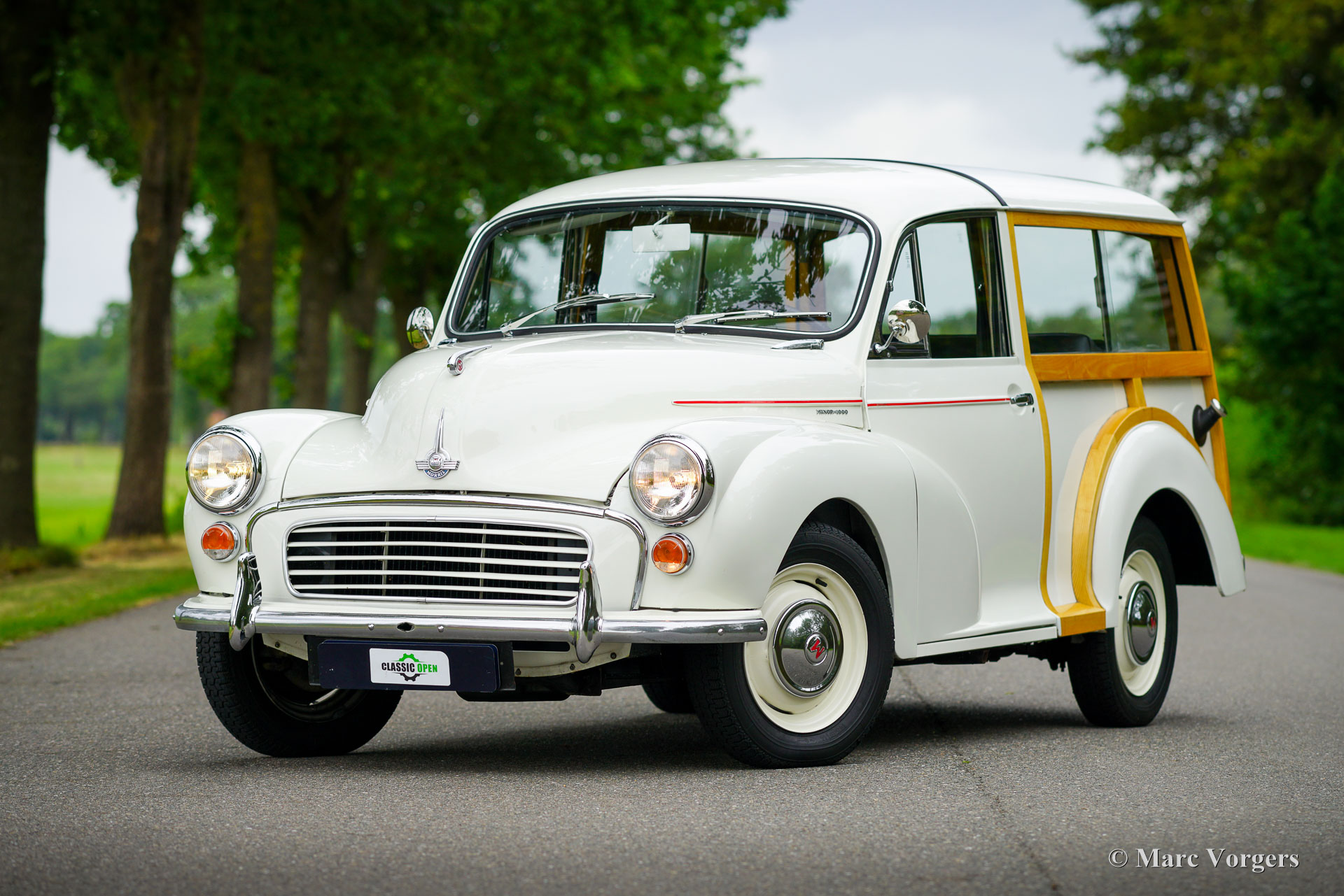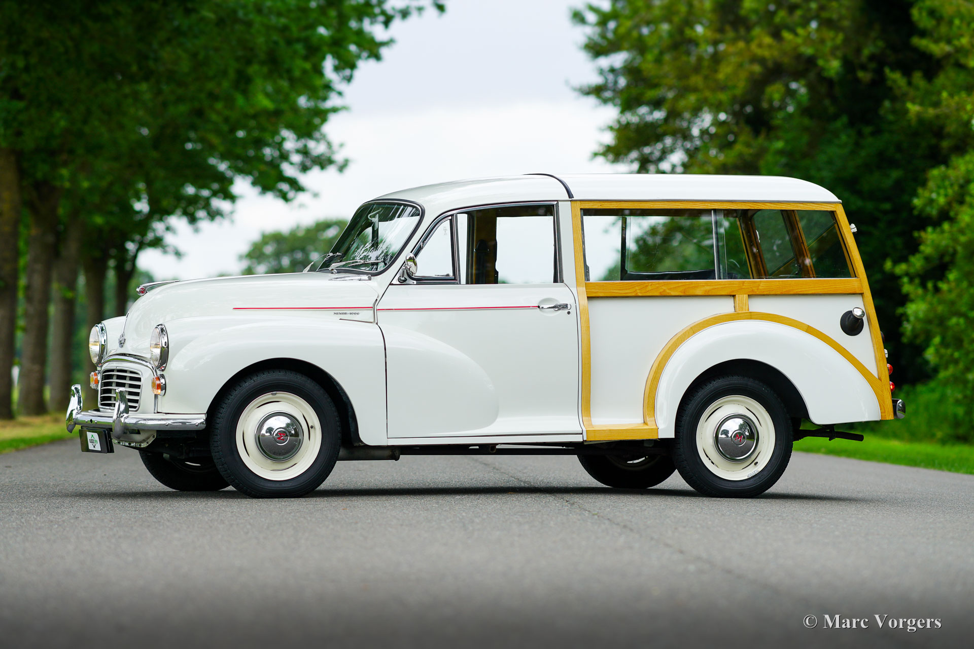 Morris Minor Traveller, Jahr 1971. Farbe Weiß kombiniert mit einer blauen Kunstlederausstattung. Ein roter Nadelstreifen ist ein schönes Detail auf dem weißen Lack. Dieser entzückende Morris Minor 1000 Traveller stammt aus dem letzten Produktionsjahr. Dieser Morris Minor wurde umfassend restauriert und ist in einem sehr guten Zustand! Die Karosserie ist perfekt, ebenso die Holzstruktur, die bei der Restaurierung teilweise erneuert wurde. Die originale Innenausstattung wurde übernommen und ist in einem schönen Zustand, der Teppich wurde erneuert. Der Motorraum ist sauber und zeigt alle originalen Werksdetails. Das Auto wurde sehr gut gewartet und wird künftigen Besitzern und Zuschauern viel Freude und Spaß bereiten! Der 1098-cm³-Vierzylindermotor läuft hervorragend und leistet 50 PS, was für eine schnelle Fortbewegung im modernen Verkehr ausreicht. Zukünftige Besitzer müssen damit rechnen, viele Daumen nach oben und begeisterte Bemerkungen zu bekommen, wo und wann immer sie diesen charakteristischen britischen Klassiker parken!