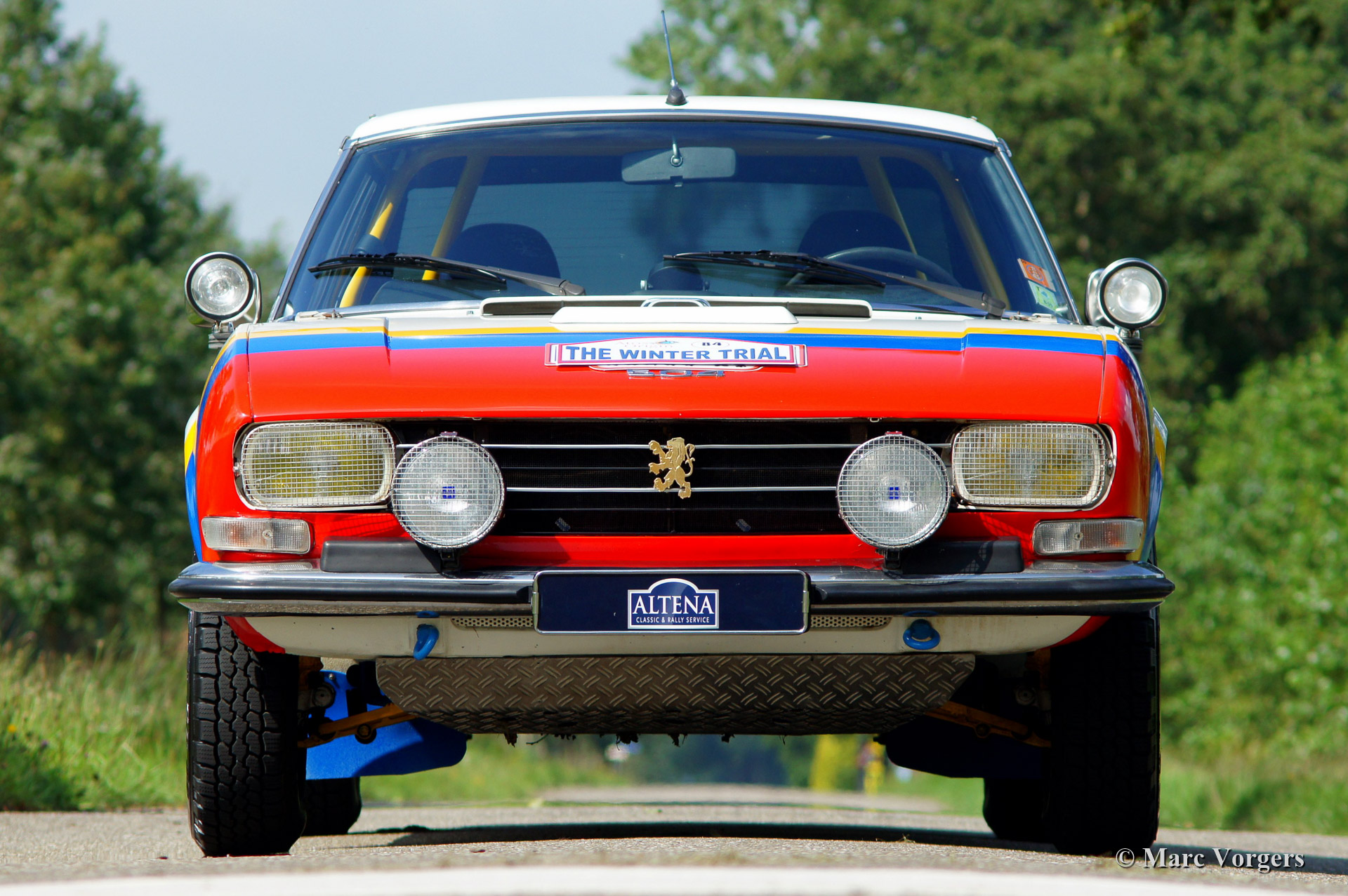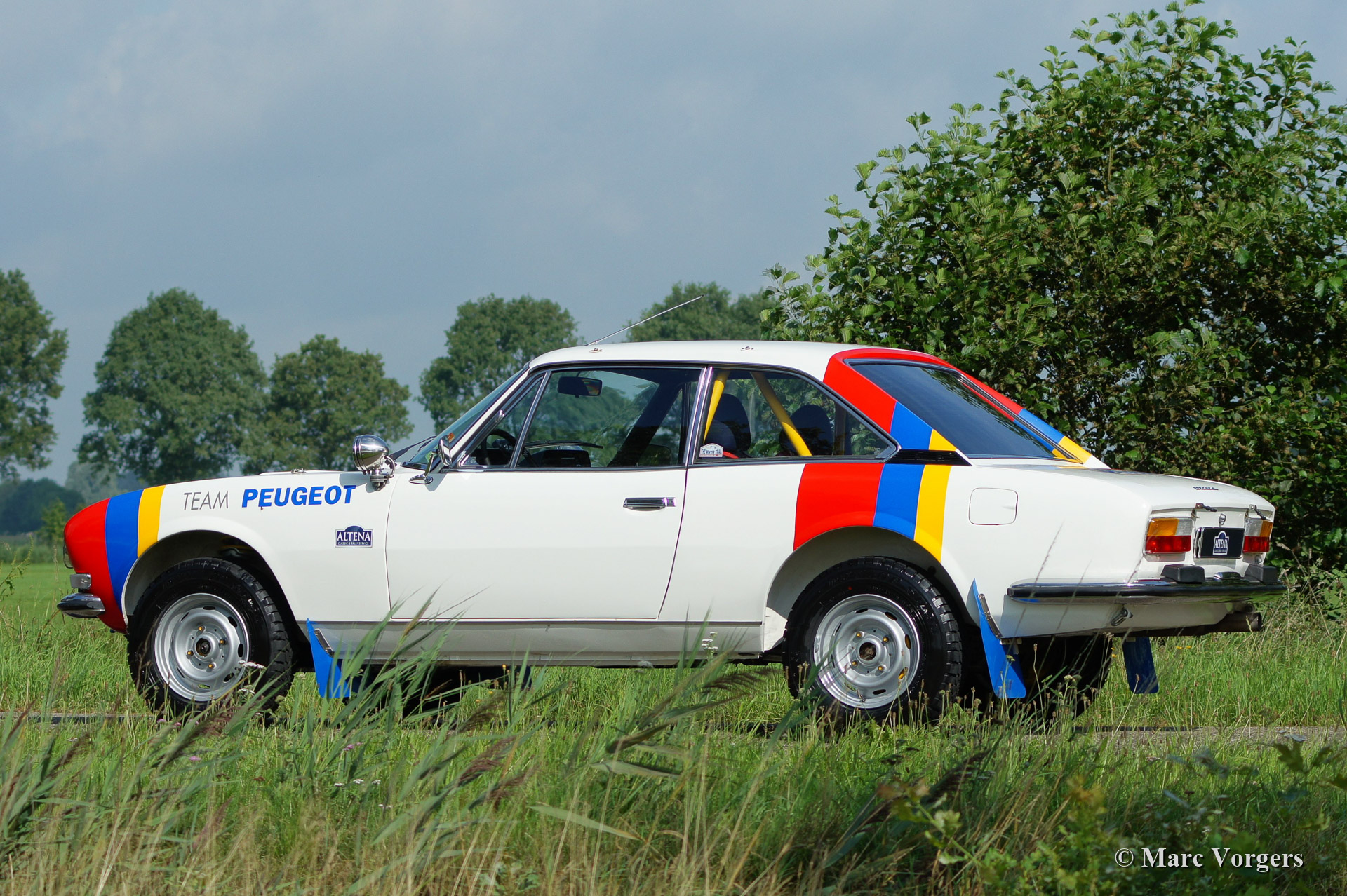 Peugeot 504 Coupe (C12) rally car, year 1976. Colour white trimmed with 'Team Peugeot' rally striping, black rally interior with blue rally seats. The car was inspired upon the successful Peugeot 504 'works' rally cars of the 1970'ies. Next to all rally gear the car features a built in electric cooling box and air conditioning in the rear.