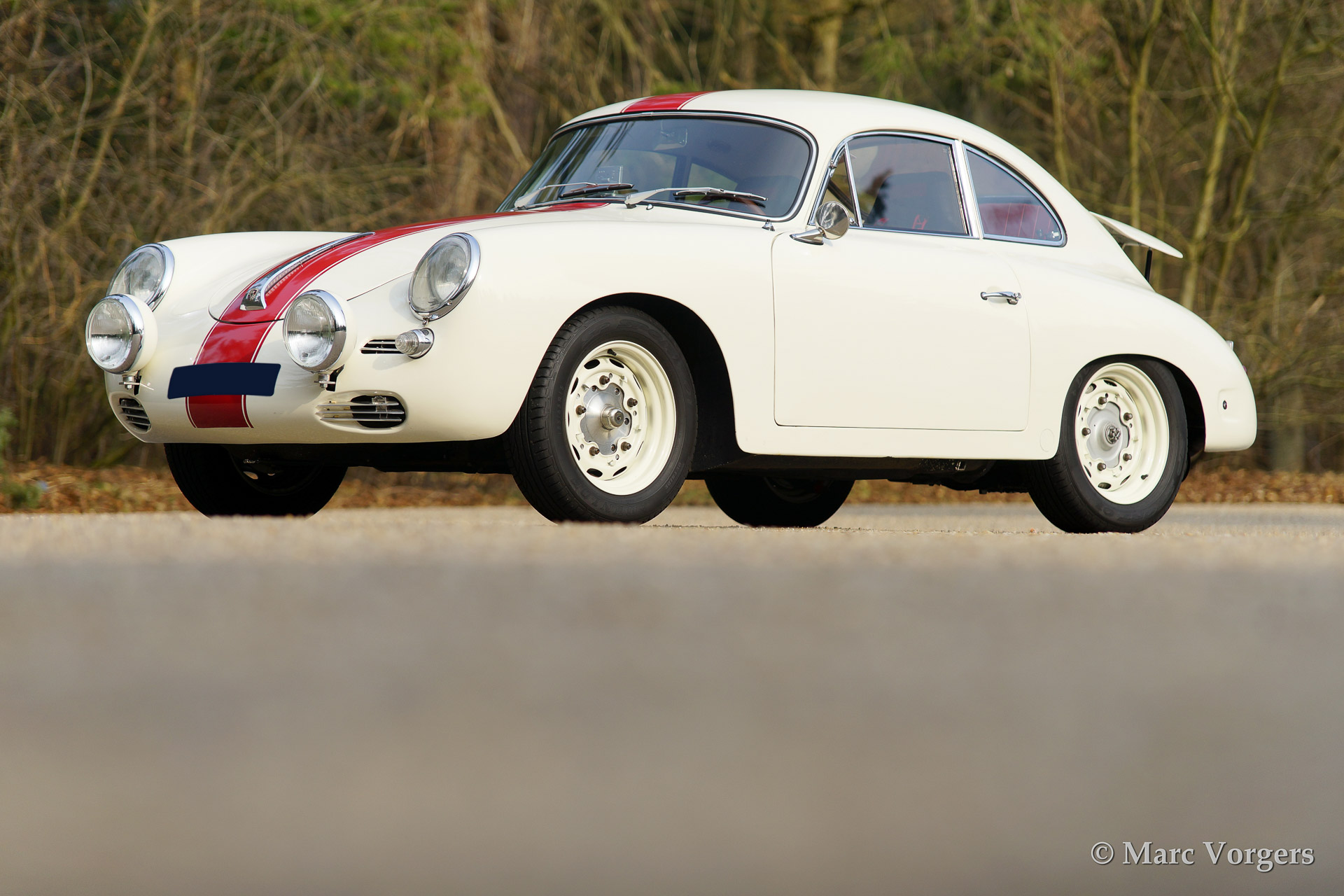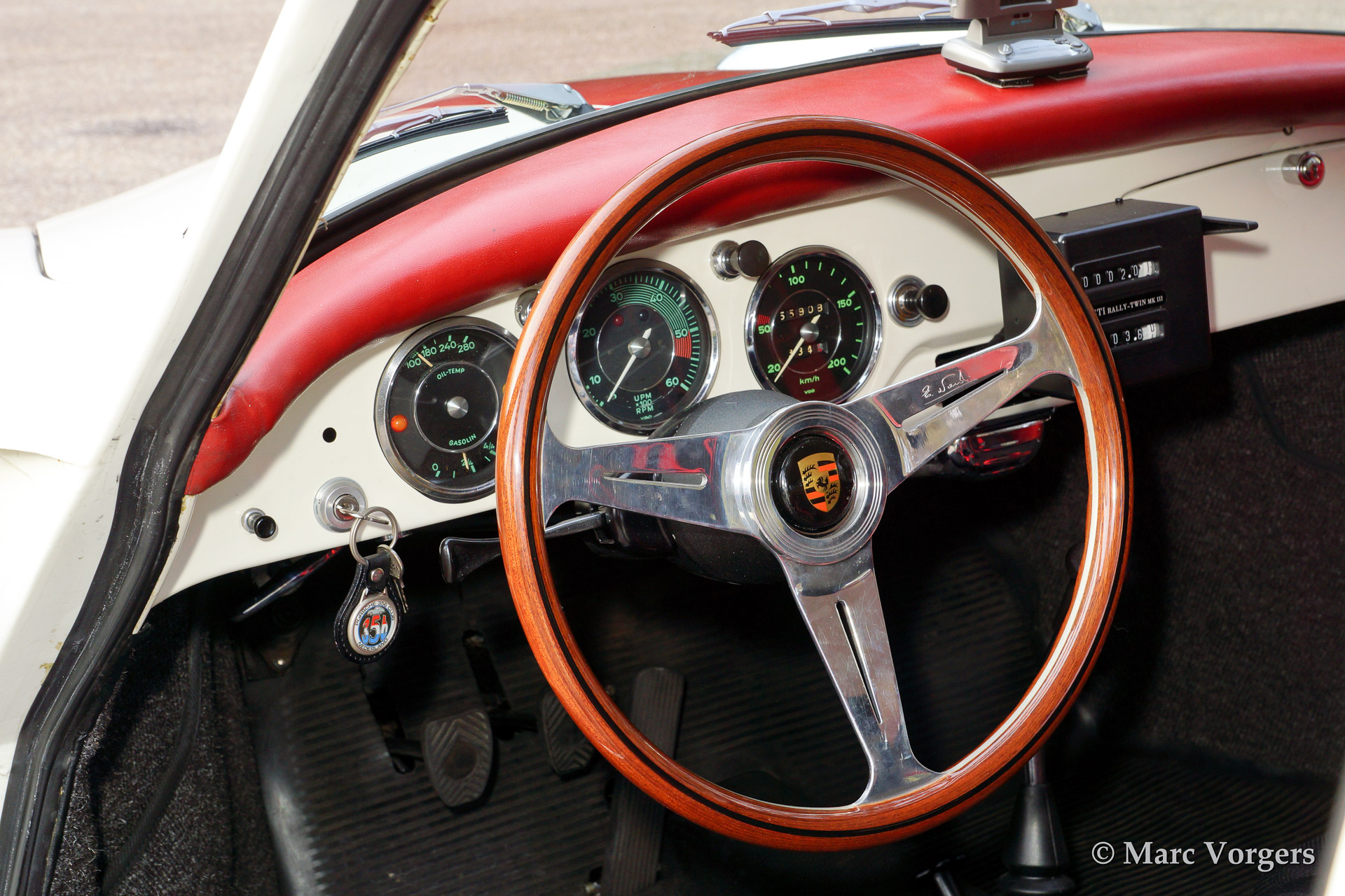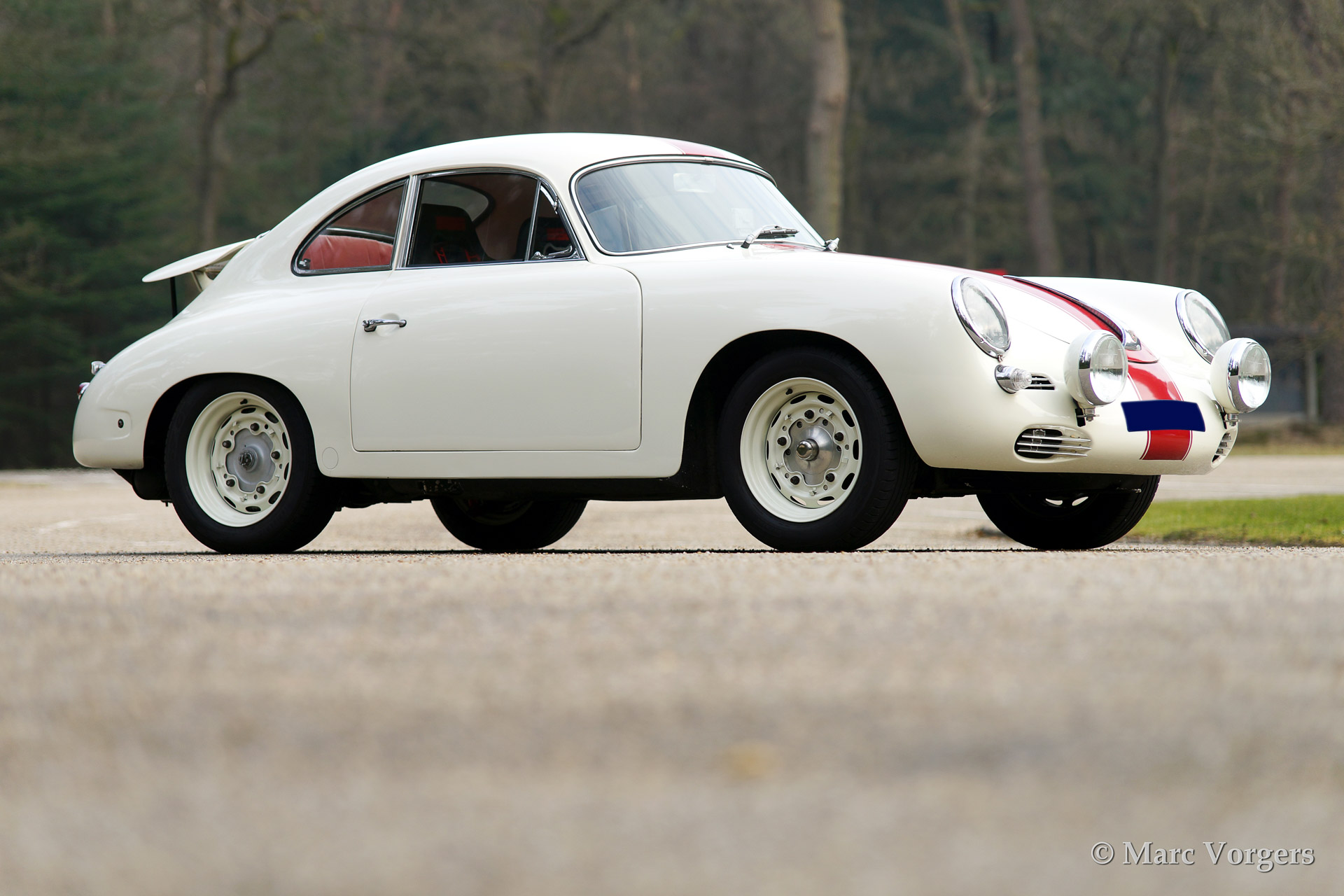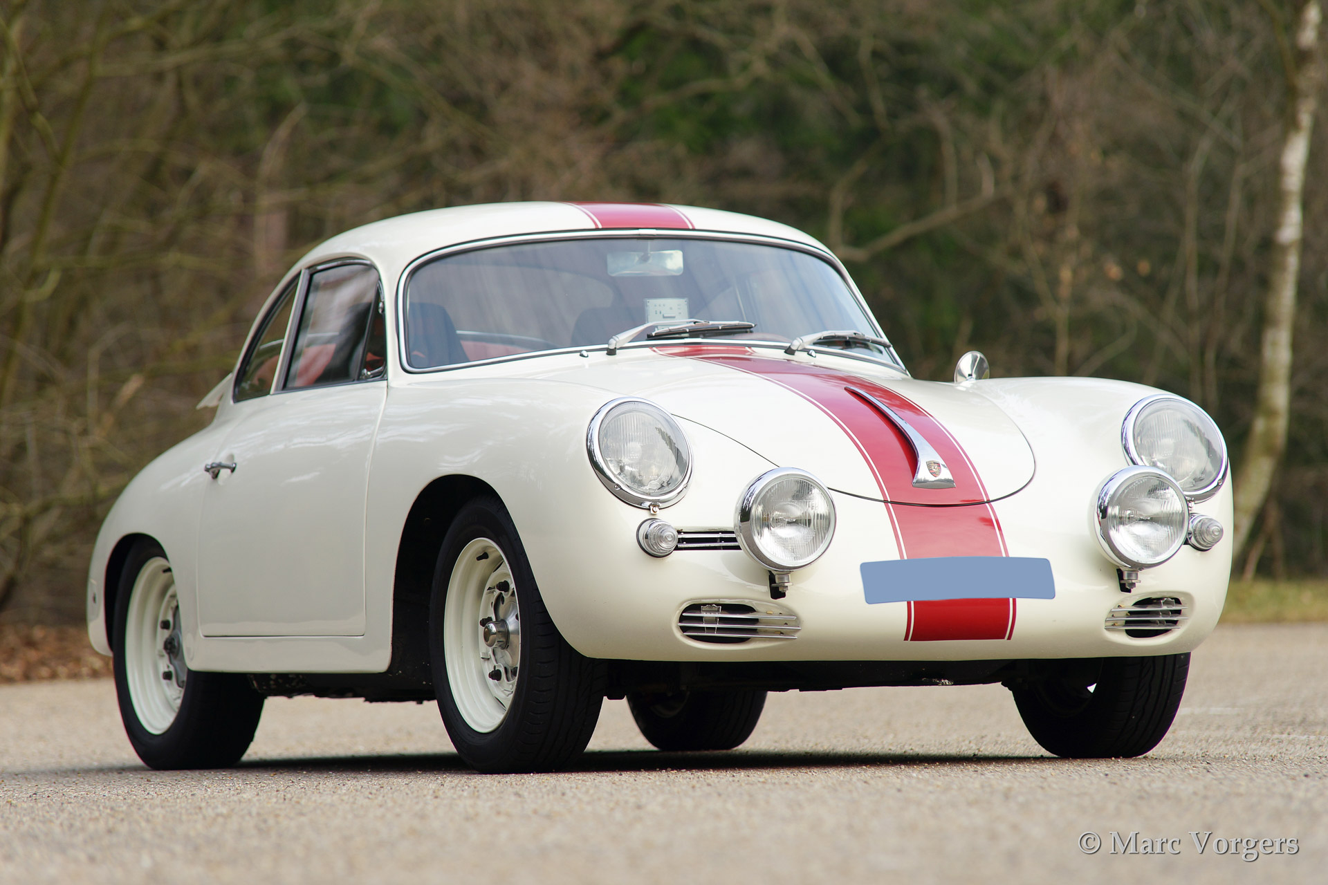 Porsche 356 B 1600 Super coupe, year 1961. Colour white with red stripe. Interior with black rally seats, black carpet and red door-panels. This fantastic Porsche 356 B 1600 Super was sold new in the USA. In the 1990'ies the automobile was extensively restored by Bob Hahn, invoices and photo's of the restoration are present. The 356 was prepared to participate in historic (touring) rallies. The bumpers were deleted, special sports seats were fitted and disc brakes were fitted to the front wheels. Further more a Trip Master, stopwatch, additional driving lamps and a Nardi steering wheel were fitted.