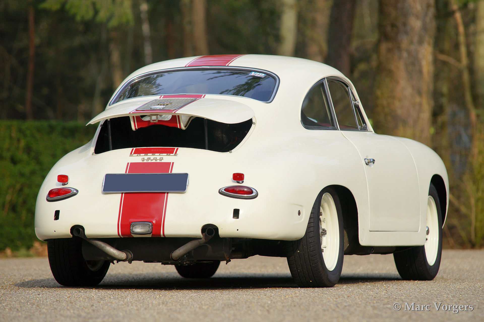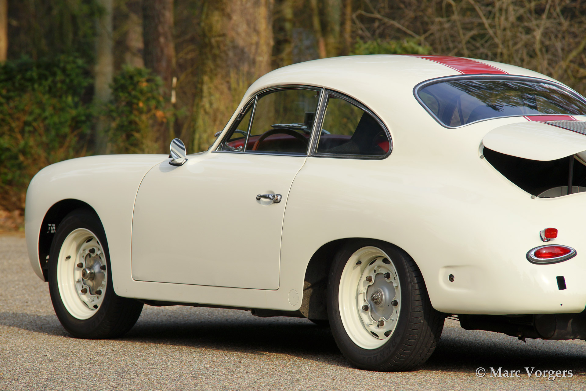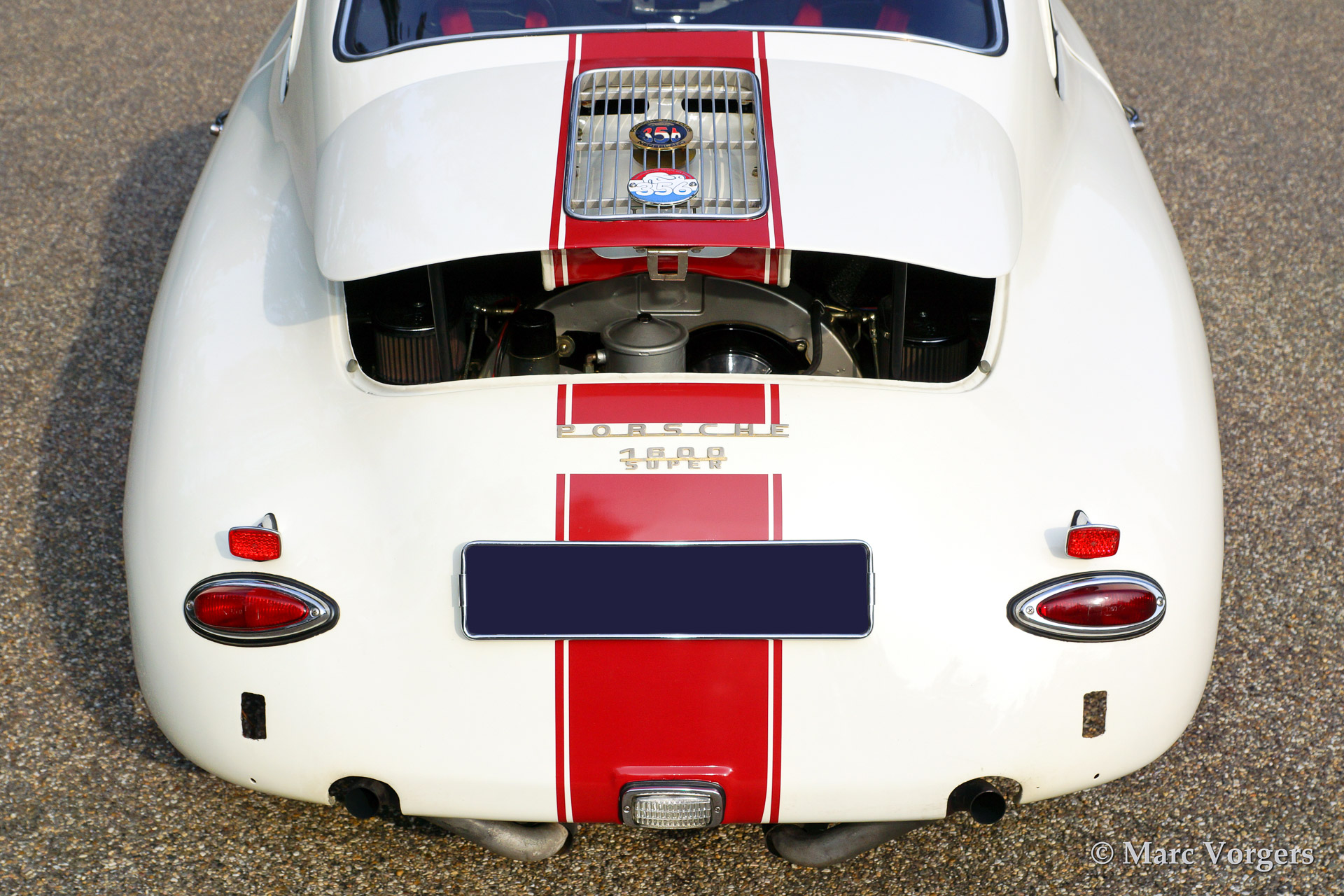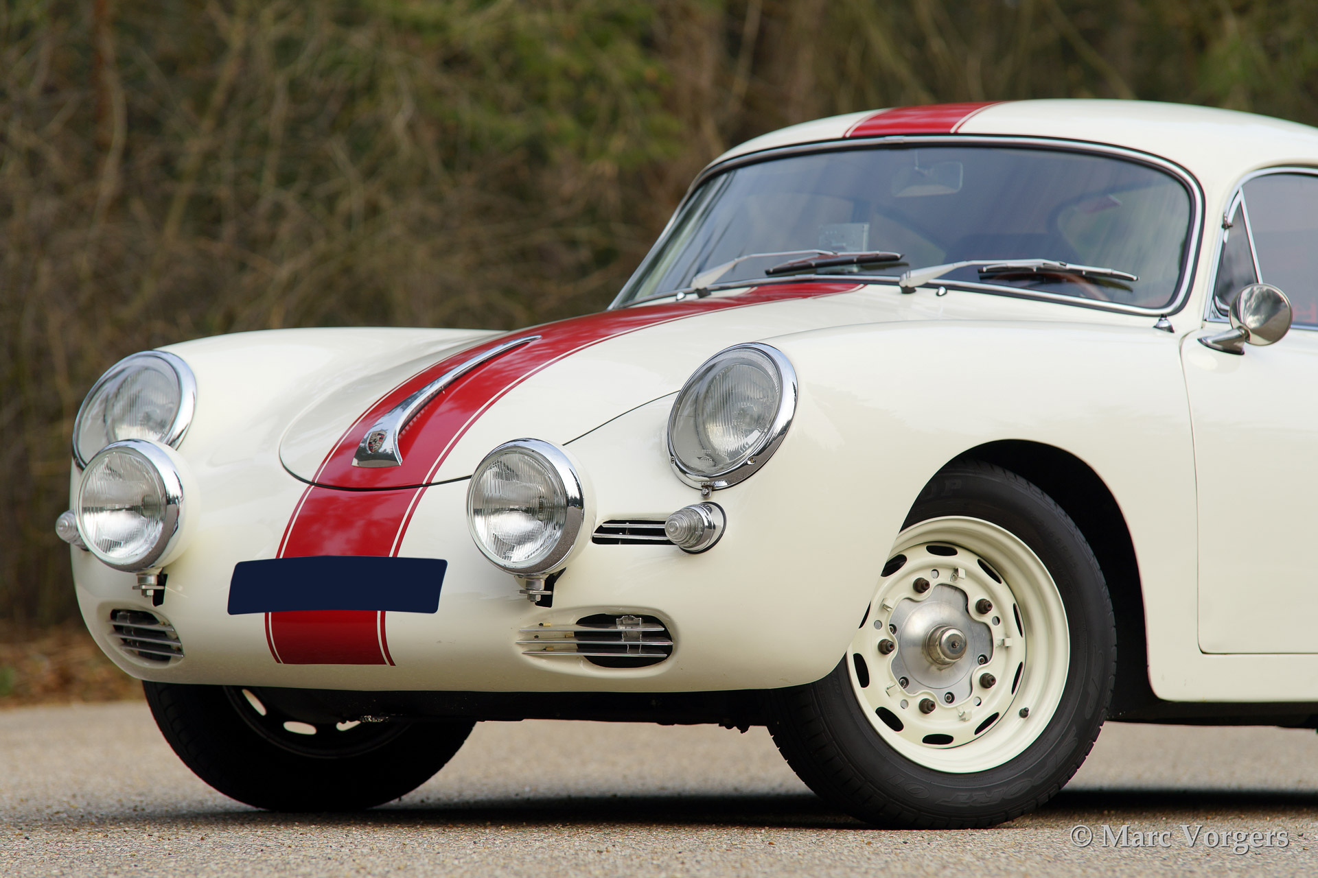 Porsche 356 B 1600 Super coupe, year 1961. Colour white with red stripe. Interior with black rally seats, black carpet and red door-panels. This fantastic Porsche 356 B 1600 Super was sold new in the USA. In the 1990'ies the automobile was extensively restored by Bob Hahn, invoices and photo's of the restoration are present. The 356 was prepared to participate in historic (touring) rallies. The bumpers were deleted, special sports seats were fitted and disc brakes were fitted to the front wheels. Further more a Trip Master, stopwatch, additional driving lamps and a Nardi steering wheel were fitted.