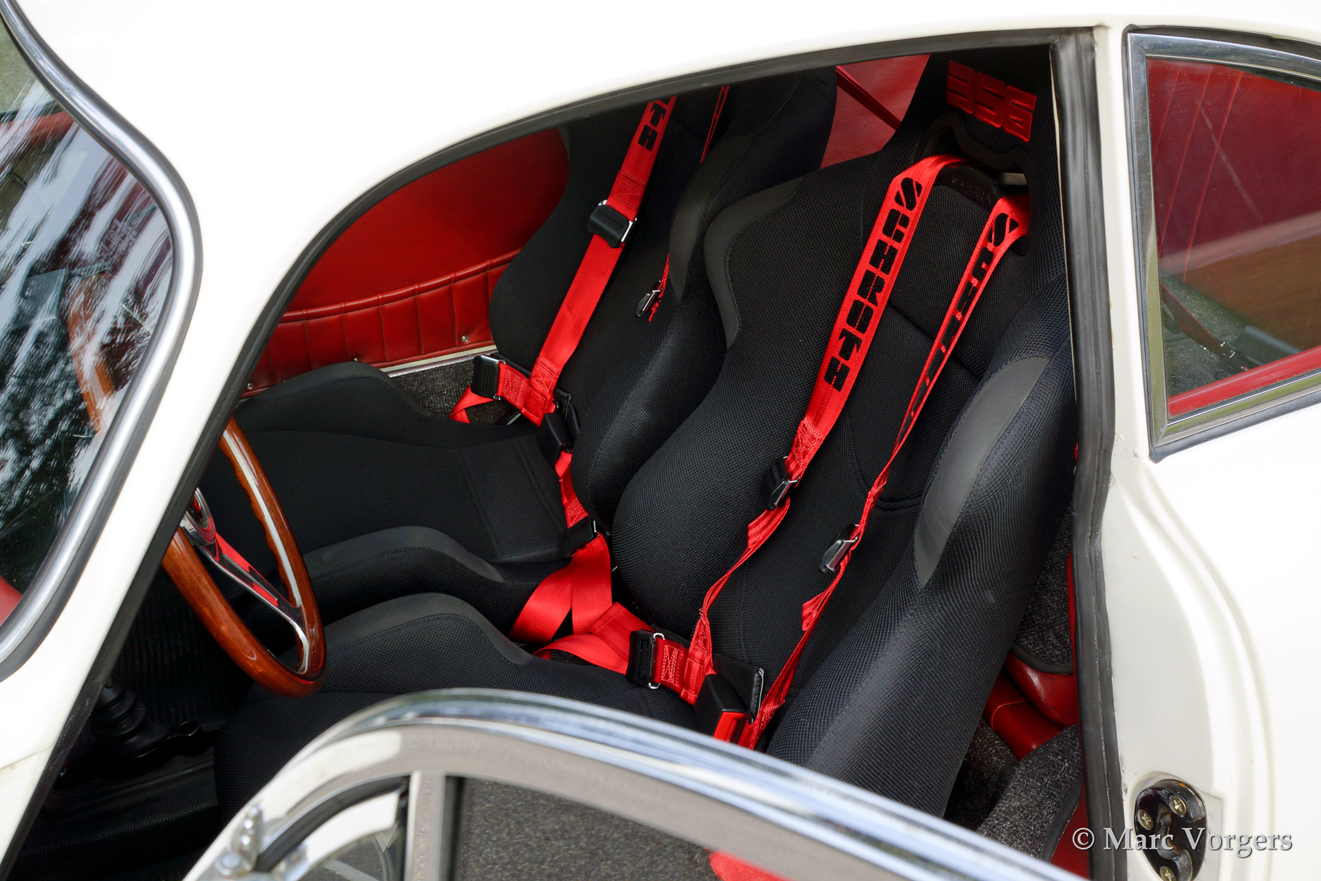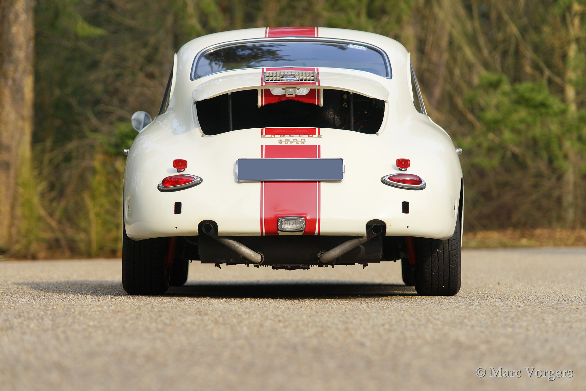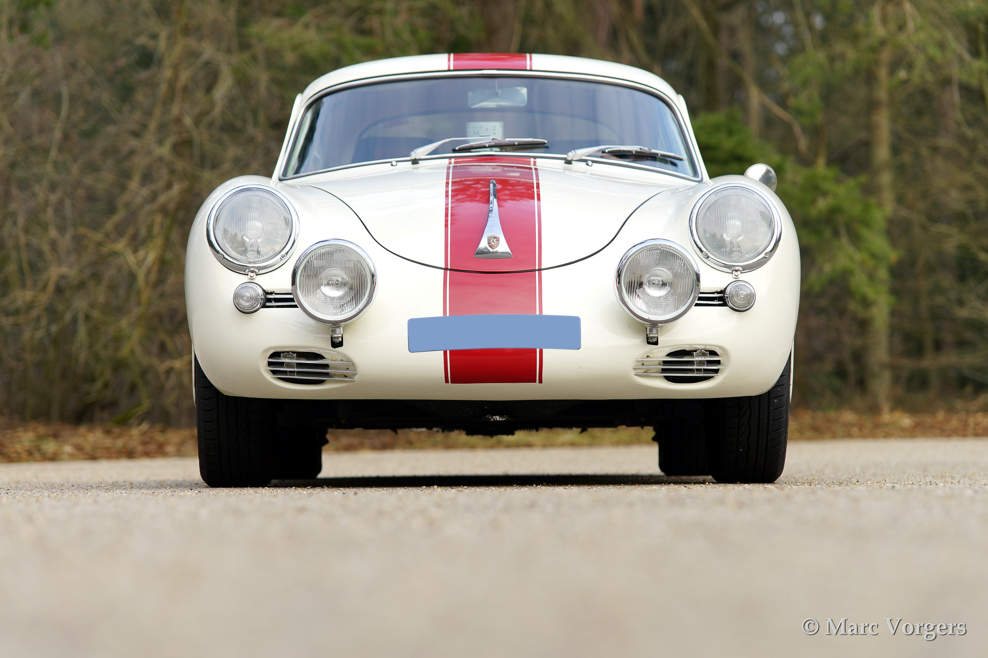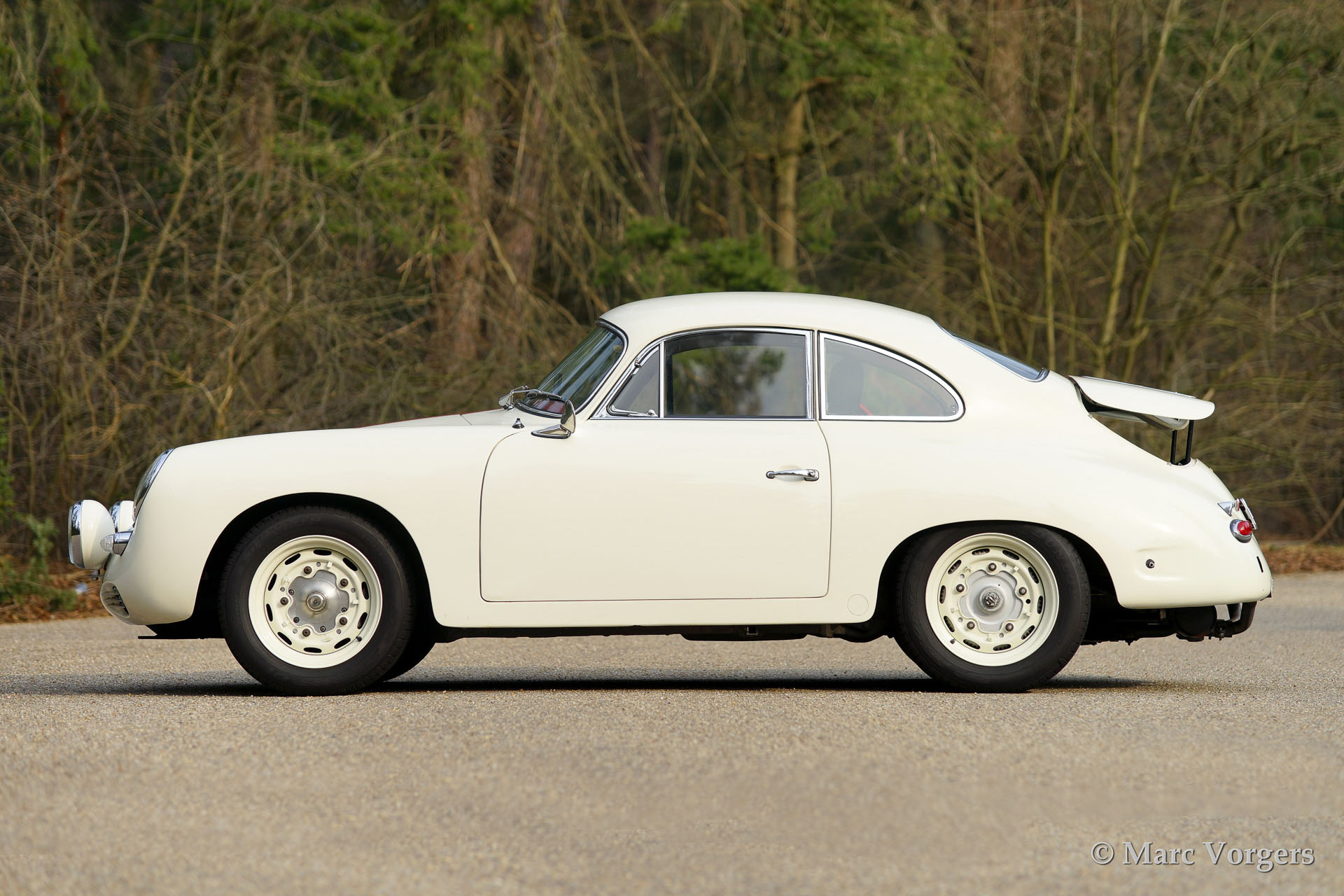 Porsche 356 B 1600 Super coupe, year 1961. Colour white with red stripe. Interior with black rally seats, black carpet and red door-panels. This fantastic Porsche 356 B 1600 Super was sold new in the USA. In the 1990'ies the automobile was extensively restored by Bob Hahn, invoices and photo's of the restoration are present. The 356 was prepared to participate in historic (touring) rallies. The bumpers were deleted, special sports seats were fitted and disc brakes were fitted to the front wheels. Further more a Trip Master, stopwatch, additional driving lamps and a Nardi steering wheel were fitted.