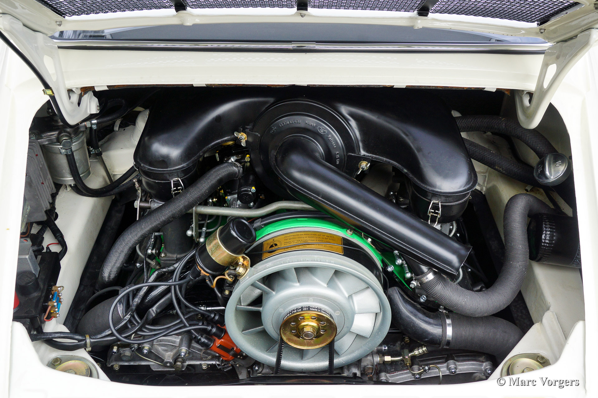 The Porsche 911 was designed with a steel unitary bodywork construction in which the engine was located behind the rear axle. The 911 engine is a air-cooled six cylinder "boxer" engine. The suspension of the Porsche 911 was independent from the start as was a five speed gearbox with floor shift.