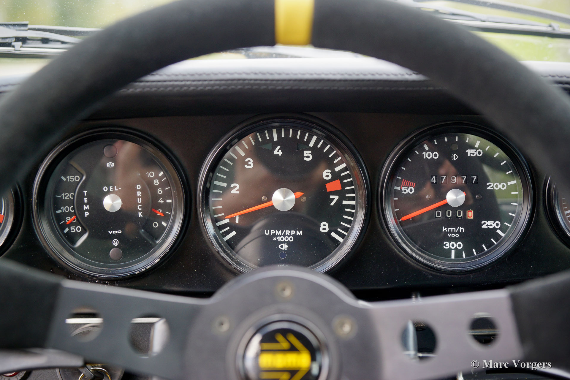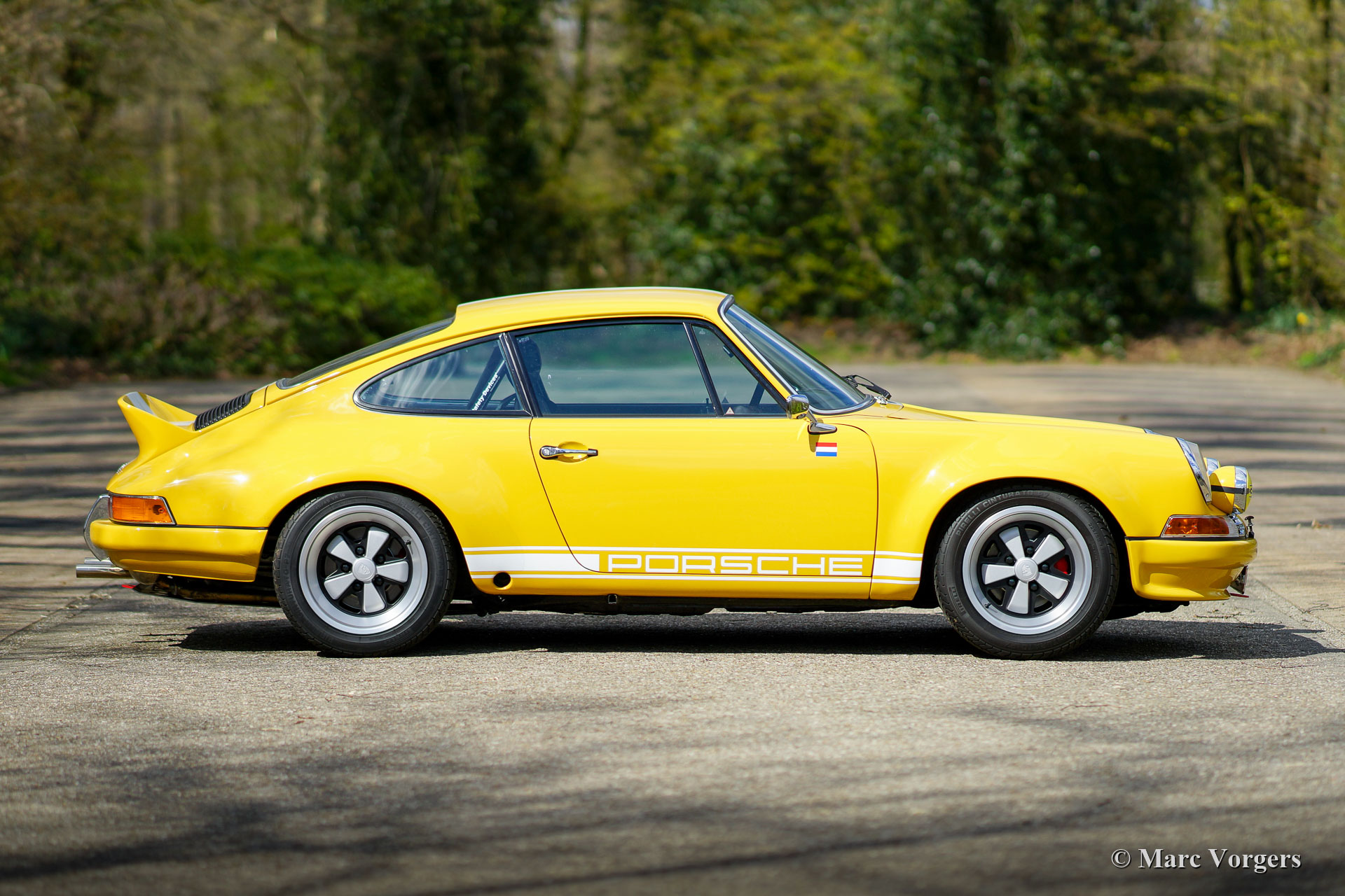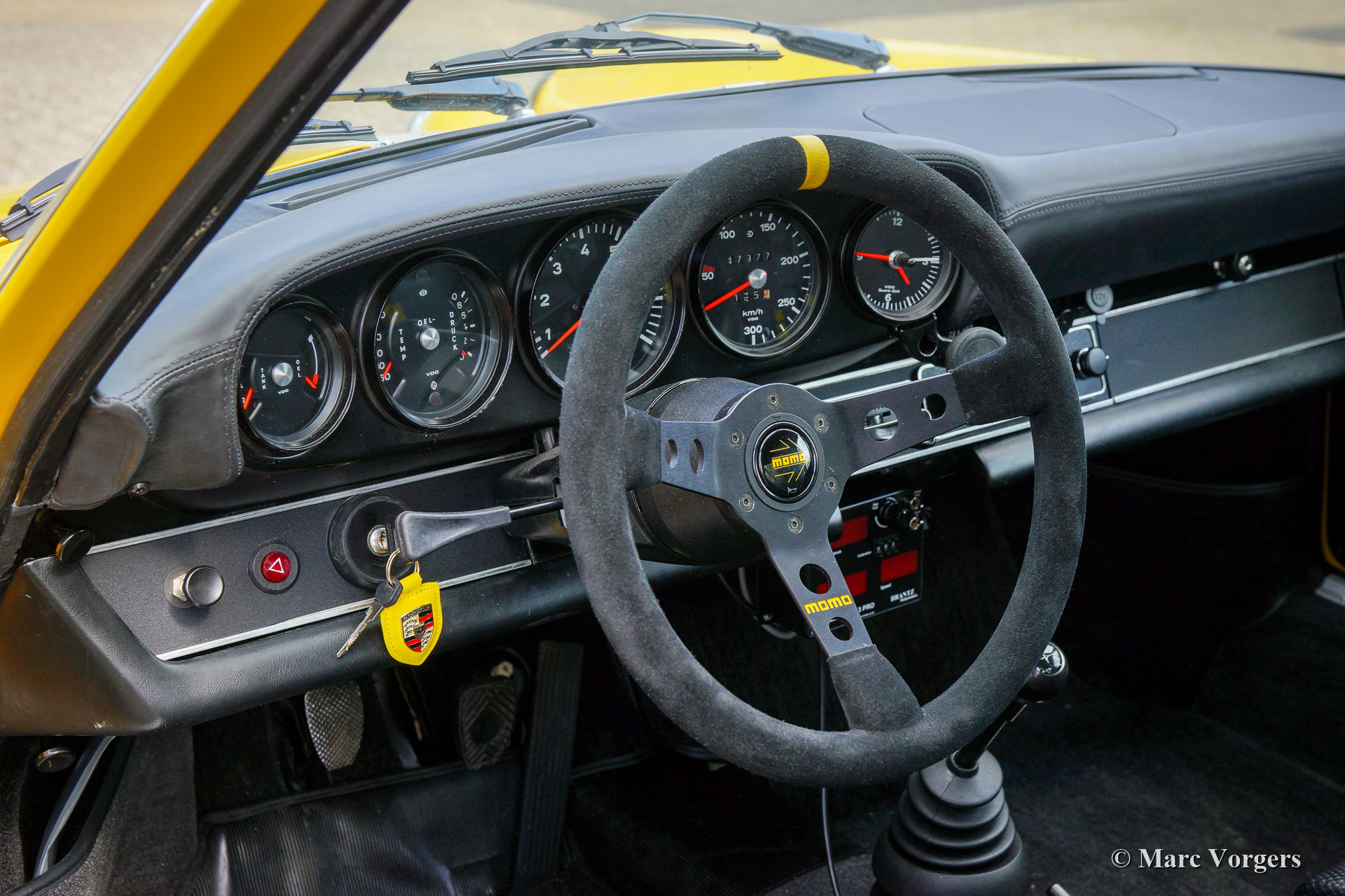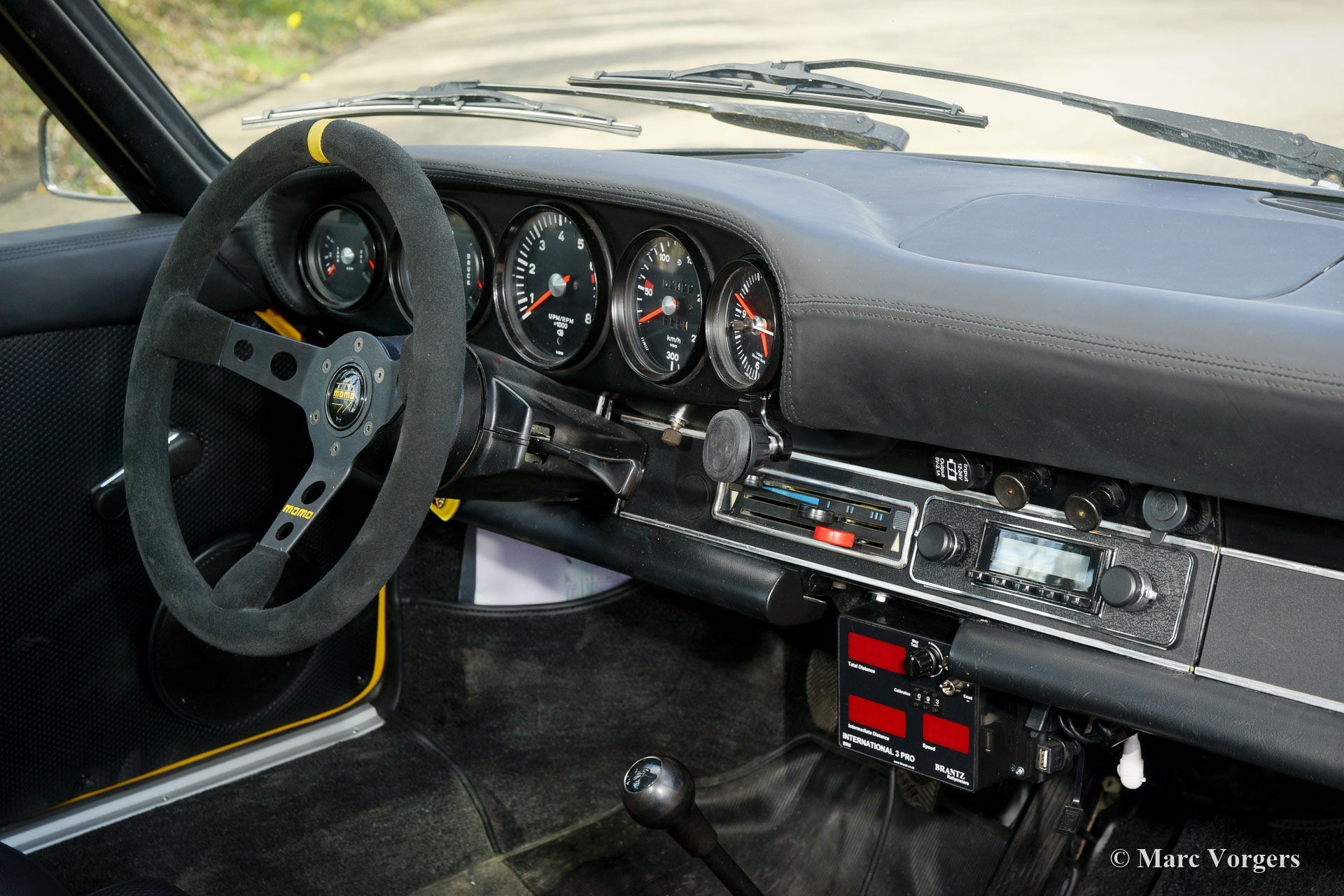 Porsche 911 2.4 „ST“, Jahr 1973. Erstzulassung am 8. Mai 1974. Farbe Porsche Speedgelb kombiniert mit einer Innenausstattung aus schwarzem Leder / Kunstleder. Dieser prächtige Porsche 911 2.4 T („long nose“ F-Serie) wurde von Classic Job umfassend restauriert und auf den 911 „ST“ -Look umgestellt. Die Restaurierung wurde im August 2020 abgeschlossen. Die Restaurierung umfasste eine vollständige Karosserieblechrestaurierung mit der Implementierung breiterer Kotflügel im ST-Stil und neuer Lackierung in Minardi-Gelb. Der 2,4-Liter-Sechszylinder-Boxermotor wurde komplett zerlegt und komplett überholt, ebenso die beiden Dreifach-Weber-Vergaser. Der Motor wurde mit MSD-Digitalzündung und Sportluftfiltern ausgestattet. Der Motor leistet 200 PS und läuft und klingt hervorragend. Der Innenraum wurde komplett neu mit schwarzem Leder / Kunstleder gepolstert und es wurden spezielle Schalensitze eingebaut. Fotoberichte der Restaurierung und von der Motor Überholung sind anwesend. Schauen Sie sich den Fotobericht der Restaurierung HIER an, um alle Details zu sehen. Der Motorumbau wurde ebenfalls fotografiert, anschauen Sie den Fotobericht HIER. Dieser fantastische Porsche 911 2.4 ST ist in einem hervorragenden Top-Zustand und das Auto fährt und handhabt sich perfekt. Motor und Getriebe sind Werksoriginal (Matching Numbers). Das Fahrerlebnis ist fantastisch und dieser wundervolle Porsche 911 „ST“ ist ein echter Hingucker. Das Auto ist ausgestattet mit einem 5-Gang-Getriebe (915), weißen Sportstreifen und Porsche-Schriftzug an den Türen, einem speziellen Momo-Sportlenkrad, einem modernen „klassischen“ Bluetooth-Autoradio, 4-Punkt-Sicherheitsgurten, einem Überrollbügel und breiten Leichtmetallräder im Fuchs Stil, einem „Duck-Tail“ Motorhaube, eine Auspuffanlage aus Edelstahl, ein digitaler Brantz International 3 Pro Tripmaster und Cibië Oscar Zusatzscheinwerfer mit Cibië-Abdeckungen.