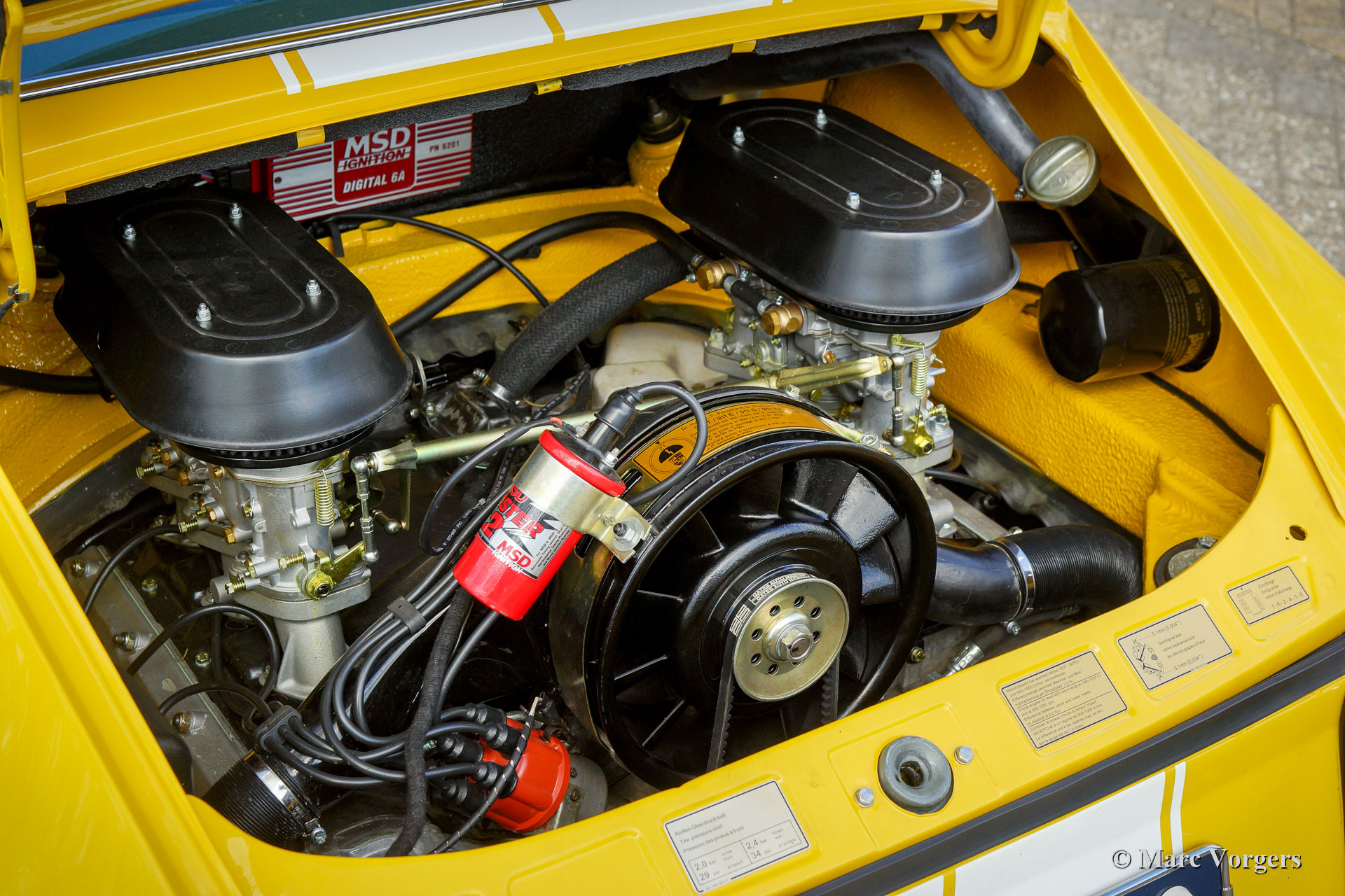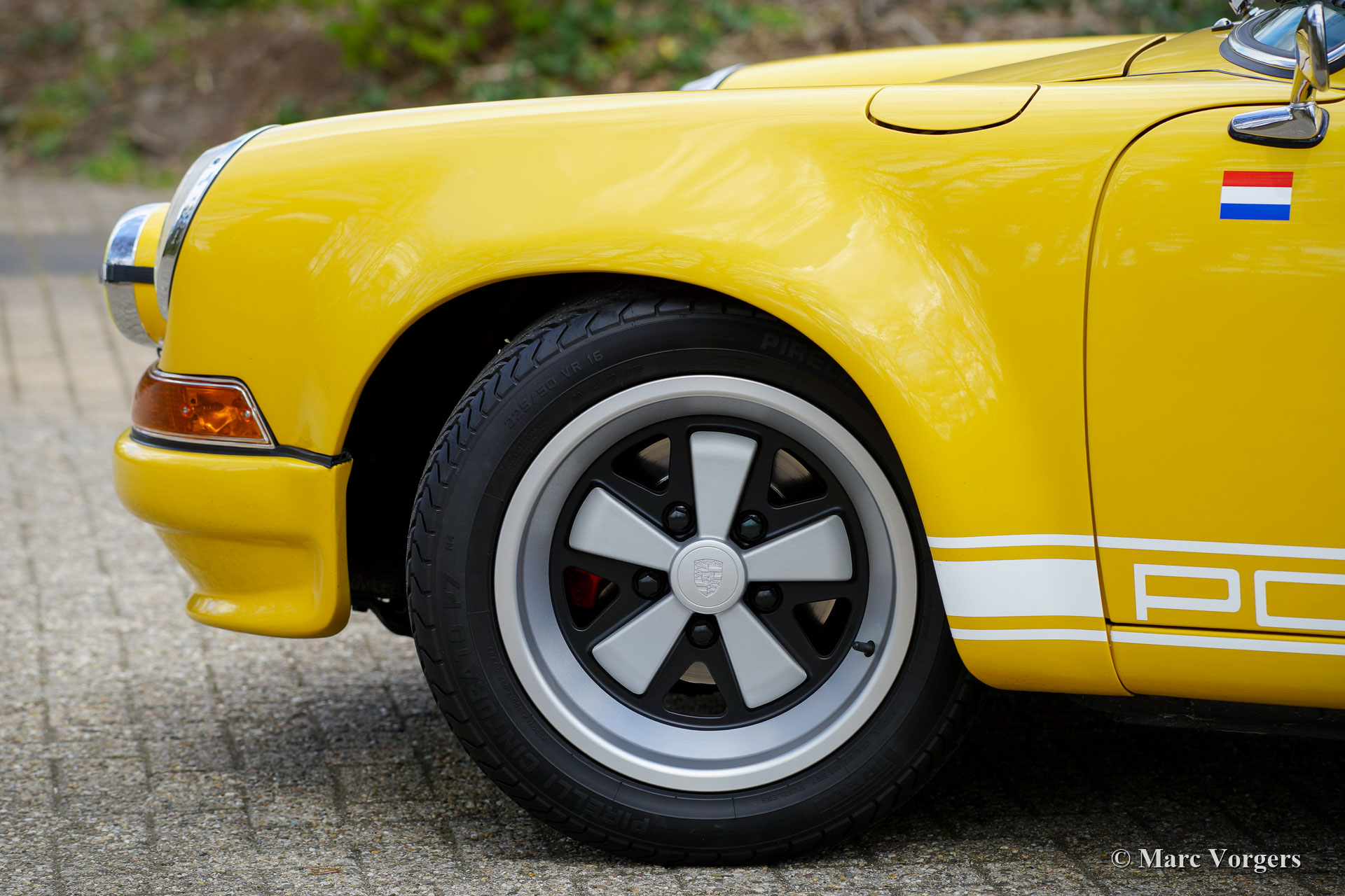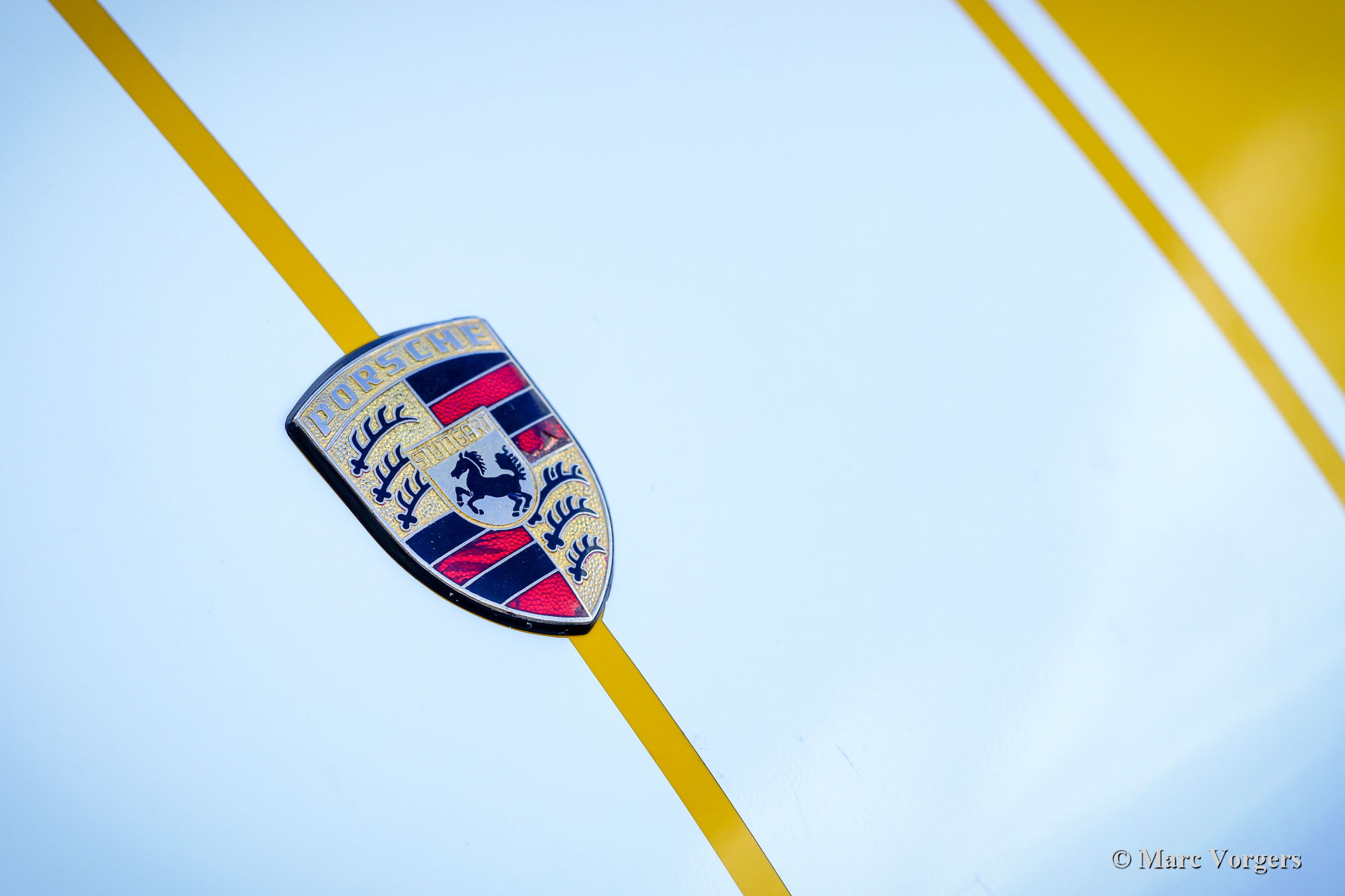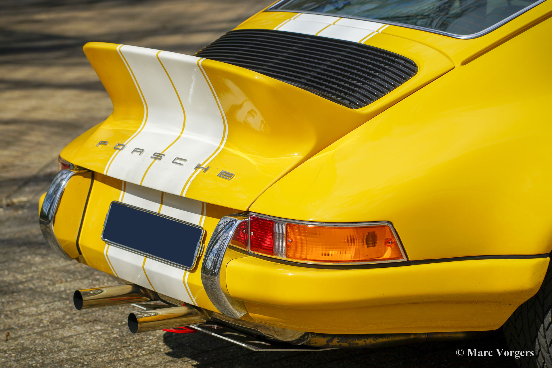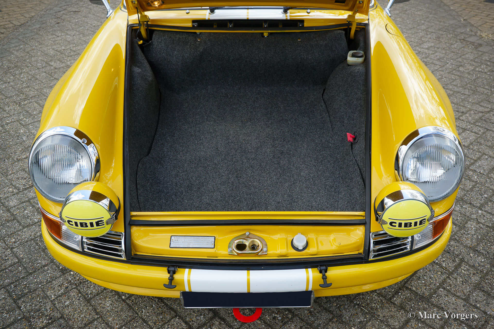 Porsche 911 2.4 „ST“, Jahr 1973. Erstzulassung am 8. Mai 1974. Farbe Porsche Speedgelb kombiniert mit einer Innenausstattung aus schwarzem Leder / Kunstleder. Dieser prächtige Porsche 911 2.4 T („long nose“ F-Serie) wurde von Classic Job umfassend restauriert und auf den 911 „ST“ -Look umgestellt. Die Restaurierung wurde im August 2020 abgeschlossen. Die Restaurierung umfasste eine vollständige Karosserieblechrestaurierung mit der Implementierung breiterer Kotflügel im ST-Stil und neuer Lackierung in Minardi-Gelb. Der 2,4-Liter-Sechszylinder-Boxermotor wurde komplett zerlegt und komplett überholt, ebenso die beiden Dreifach-Weber-Vergaser. Der Motor wurde mit MSD-Digitalzündung und Sportluftfiltern ausgestattet. Der Motor leistet 200 PS und läuft und klingt hervorragend. Der Innenraum wurde komplett neu mit schwarzem Leder / Kunstleder gepolstert und es wurden spezielle Schalensitze eingebaut. Fotoberichte der Restaurierung und von der Motor Überholung sind anwesend. Schauen Sie sich den Fotobericht der Restaurierung HIER an, um alle Details zu sehen. Der Motorumbau wurde ebenfalls fotografiert, anschauen Sie den Fotobericht HIER. Dieser fantastische Porsche 911 2.4 ST ist in einem hervorragenden Top-Zustand und das Auto fährt und handhabt sich perfekt. Motor und Getriebe sind Werksoriginal (Matching Numbers). Das Fahrerlebnis ist fantastisch und dieser wundervolle Porsche 911 „ST“ ist ein echter Hingucker. Das Auto ist ausgestattet mit einem 5-Gang-Getriebe (915), weißen Sportstreifen und Porsche-Schriftzug an den Türen, einem speziellen Momo-Sportlenkrad, einem modernen „klassischen“ Bluetooth-Autoradio, 4-Punkt-Sicherheitsgurten, einem Überrollbügel und breiten Leichtmetallräder im Fuchs Stil, einem „Duck-Tail“ Motorhaube, eine Auspuffanlage aus Edelstahl, ein digitaler Brantz International 3 Pro Tripmaster und Cibië Oscar Zusatzscheinwerfer mit Cibië-Abdeckungen.