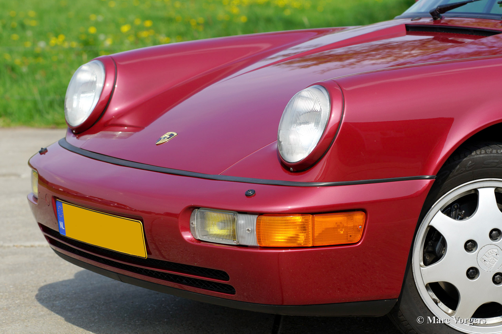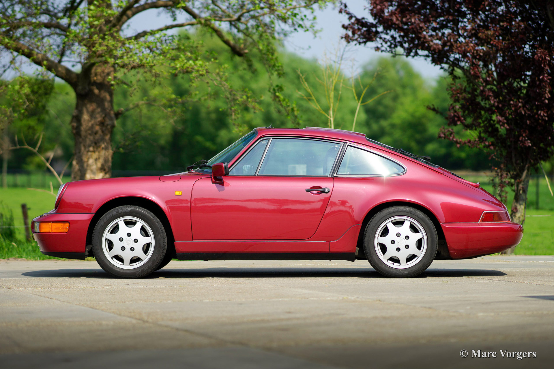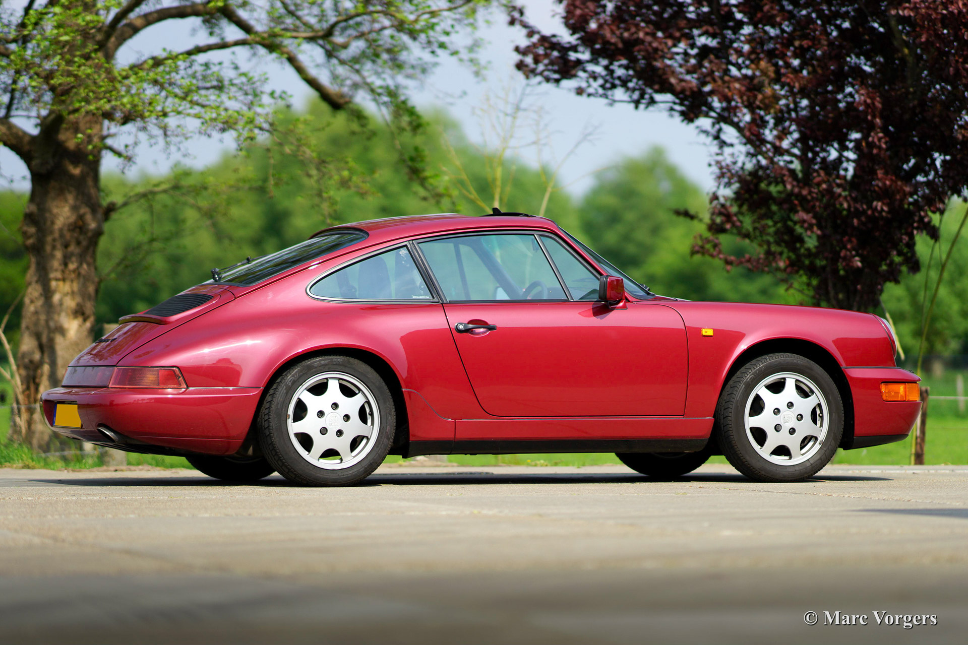 Porsche 911 (964) Carrera 4, year 1990. Colour Raspberry red metallic with a grey leather interior. This beautiful Porsche 911 is in very good to excellent condition. The automobile sold new in the Netherlands, the car comes from the second owner and it has driven 124.000 km from new. This 911 is well serviced and maintained and the car drives perfect. The car was recently given brilliant new paintwork in the original colour and a new windscreen. The 911 Carrera 4 is four wheel driven. The car sports options like the original alloy wheels, air-conditioning, sliding roof and a wiper on the rear window.