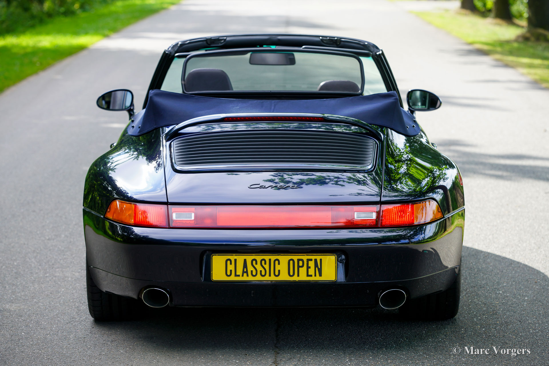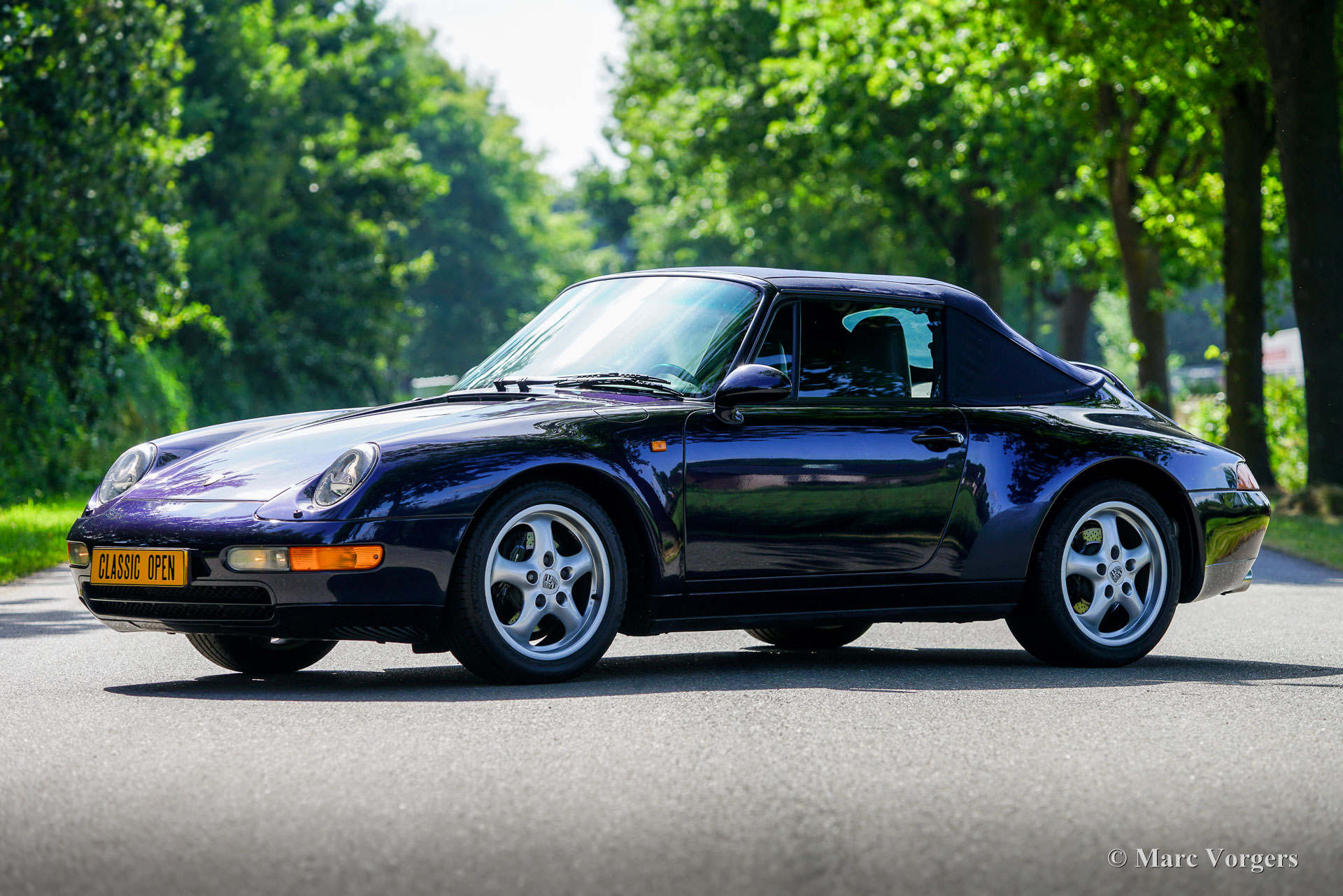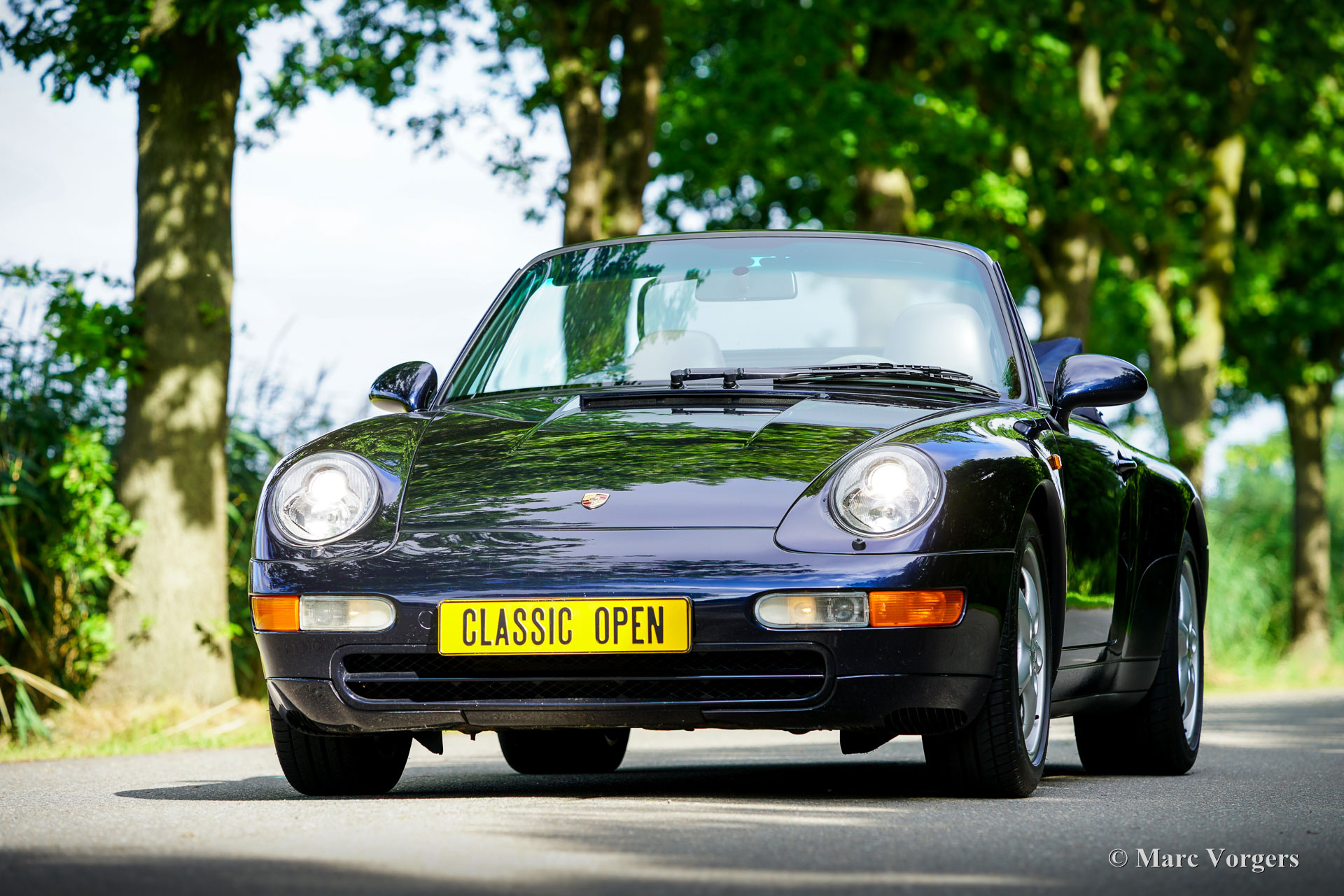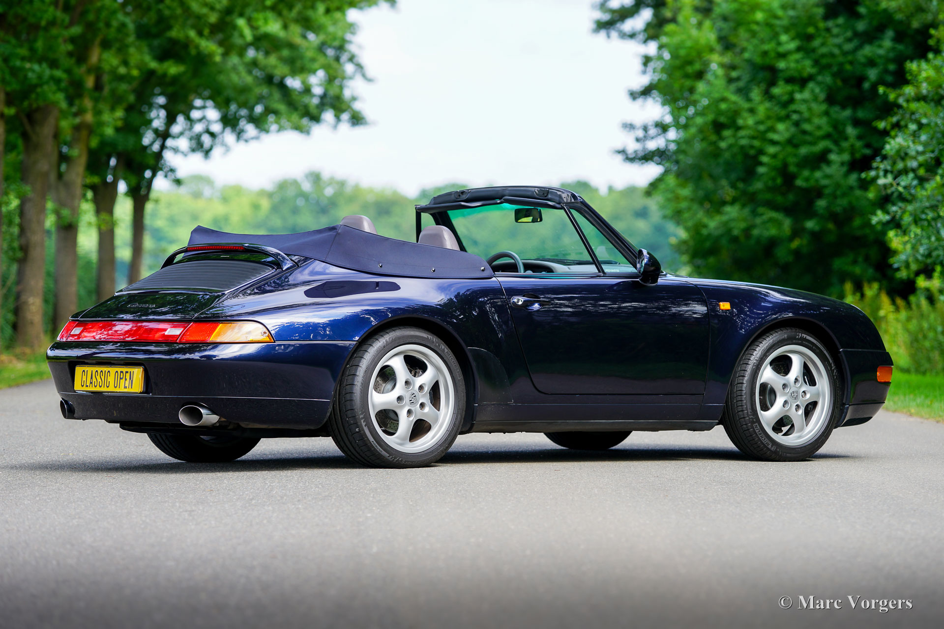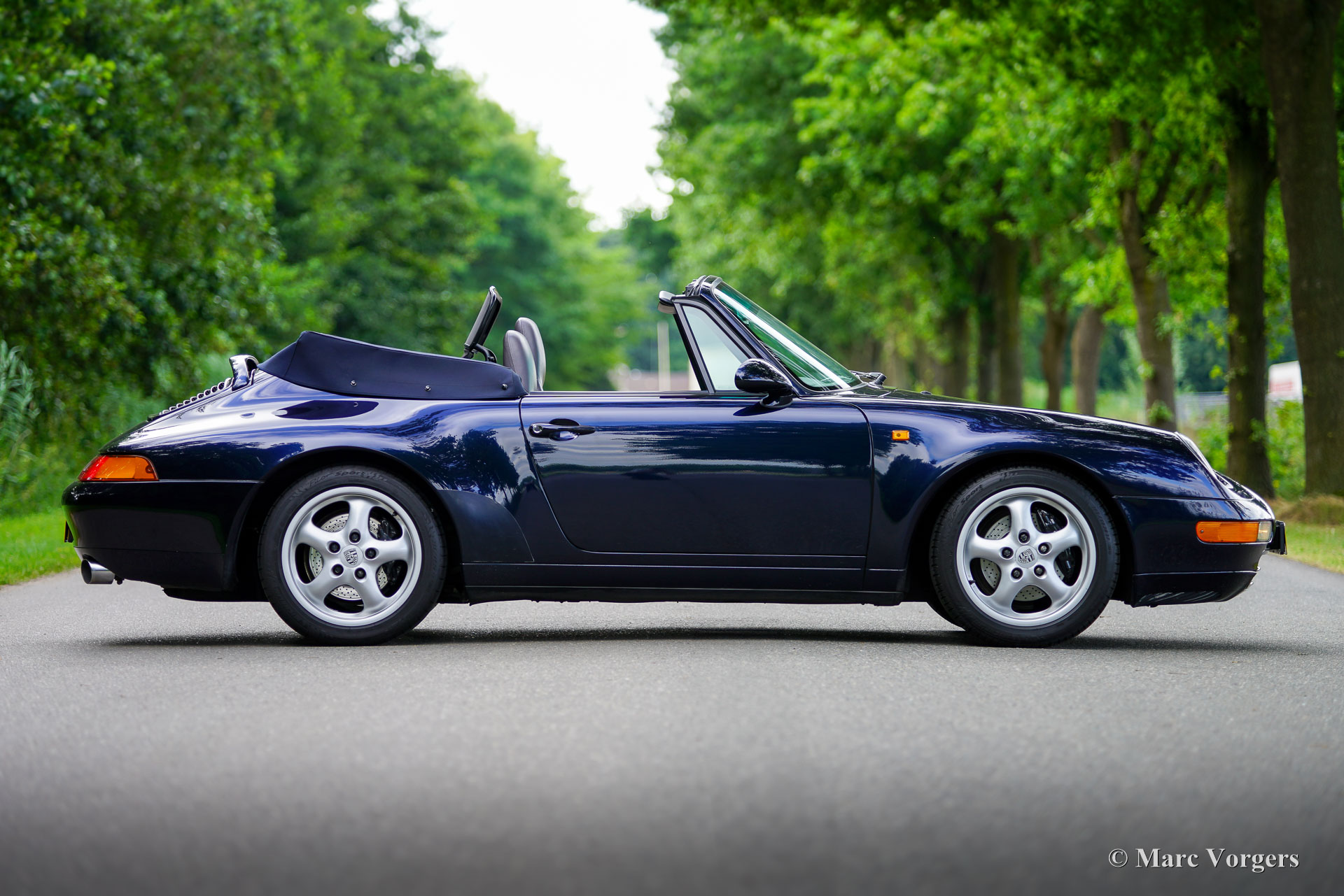 Porsche 911 (993) Carrera 2 Cabriolet, Baujahr 1994. Lackierung in Nachtblau-Metallic mit grauer Raff-Lederausstattung und passenden grauen Teppich. Dunkelblaues Mohair-Verdeck und Persenning. Das Auto wurde neu in die Niederlande vom Importeur Pon geliefert und zunächst von Pon in Amersfoort, dann vom Porsche-Spezialisten Theo Jansen und dem Porsche/Ferrari-Spezialisten Fred Huisman sorgfältig gewartet. Die (Wartungs-)Historie ist vollständig dokumentiert. Der Tachostand beträgt 133.150 km. Das Auto ist in ausgezeichnetem Zustand, mit nur leichten Gebrauchsspuren im Innenraum. Dieser wunderbare Porsche 911 ist unfallfrei und wurde immer drinnen gelagert. Dieser 911 der Baureihe 993 wird seit November 2004 von seinem aktuellen Besitzer geschätzt und gilt als eines der begehrtesten luftgekühlten Modelle. Er stellt die letzte Evolutionsstufe des legendären 911 dar. Dieser edle Porsche 911 wird von einem 272 PS starken Sechszylinder-Boxermotor angetrieben, der die Hinterräder über ein Tiptronic-Automatikgetriebe antreibt.