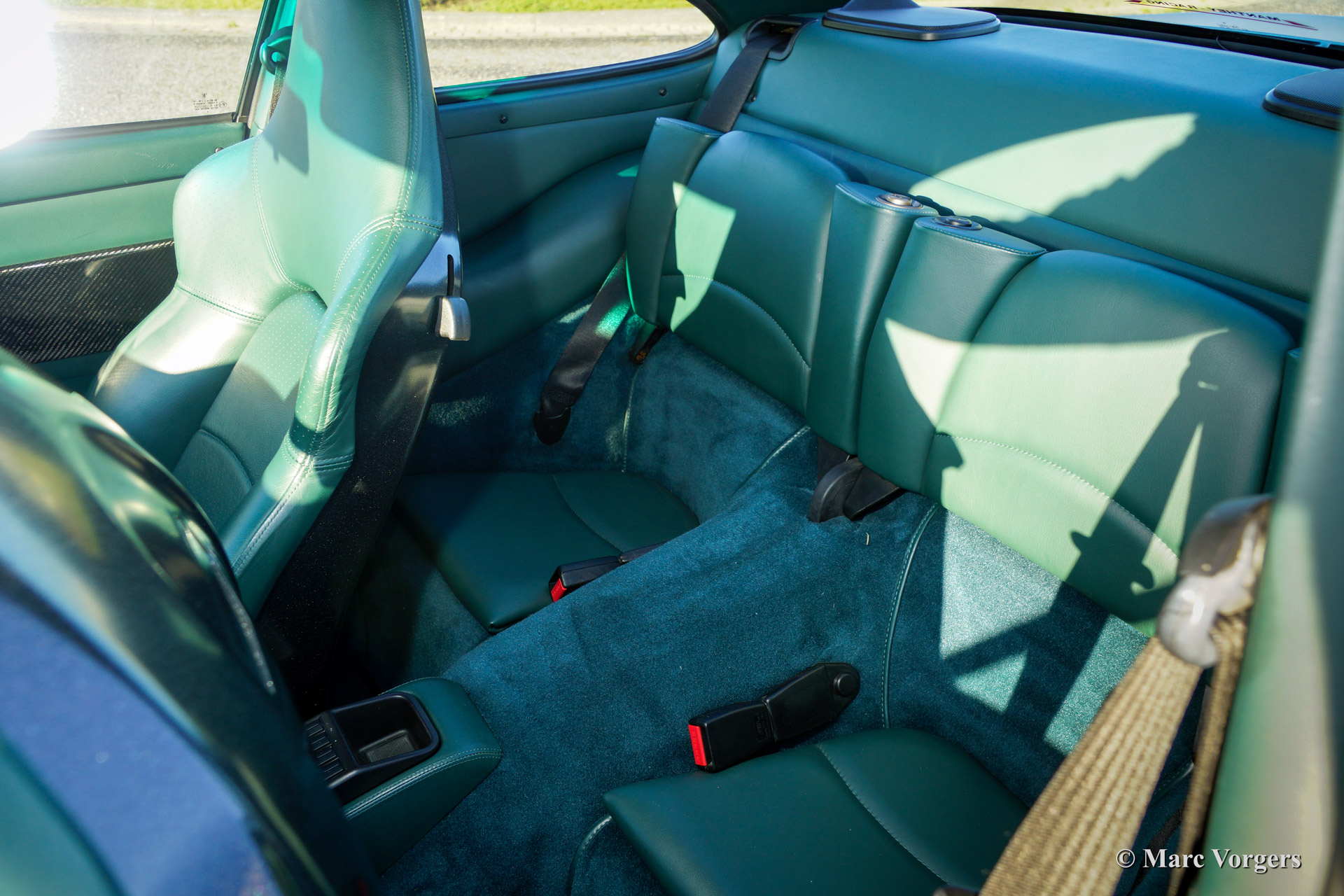 Porsche 911 (993) Turbo, year 1996. Colour Polar silver metallic with a Cedar green leather 'sport' interior. This 911 Turbo features many visible options like: original power sliding roof, gear lever and handbrake lever in carbon and leather trim, carbon accents on dashboard and door panels.