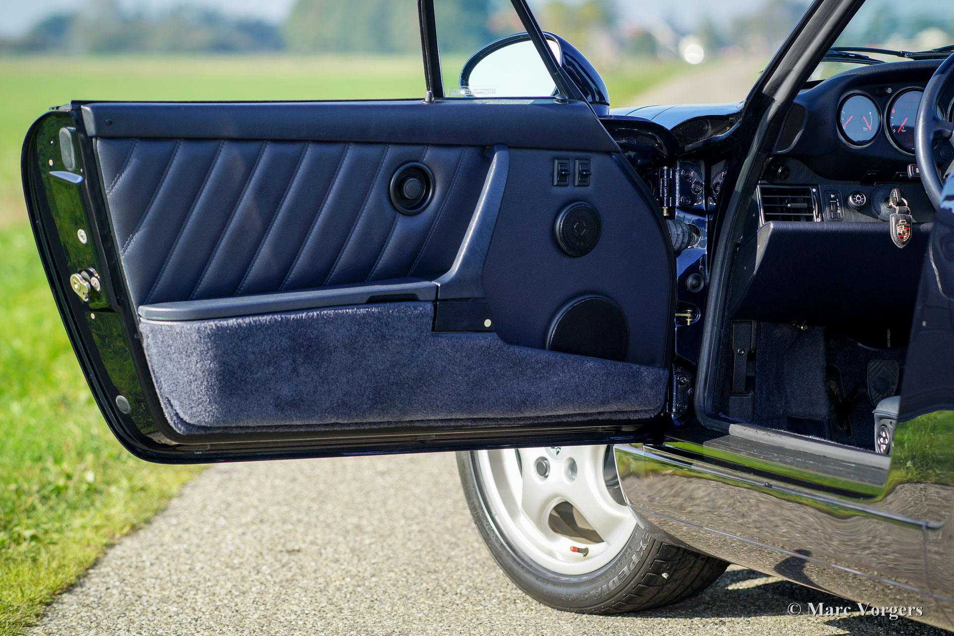Porsche 911 (964) Carrera 4 Cabriolet, Jahr 1992. Farbe 'Midnight blue' metallic mit einem blauen Leder-Interieur und ein schwarzes Verdeck. Diese fantastische Porsche 911 Carrera 4 ist in einem hervorragenden Originale TOP Zustand, wie neu! Von neu hat das Auto 49,524 Kilometer gefahren. Die Farbe ist noch voll Original und in tadellosem Zustand! Es wird schwer sein, ein besser erhaltenes Exemplar zu finden! Dieser Porsche kommt sehr schön dokumentiert, die Original-Bücher und Wartungs-Rechnungen sind anwesend. Der 964 Carrera 4 verfügt über permanenten Allradantrieb, ein System, das von der legendären Porsche 959 entwickelt wurde. Dies ist ein sehr hochwertiger Porsche 911.