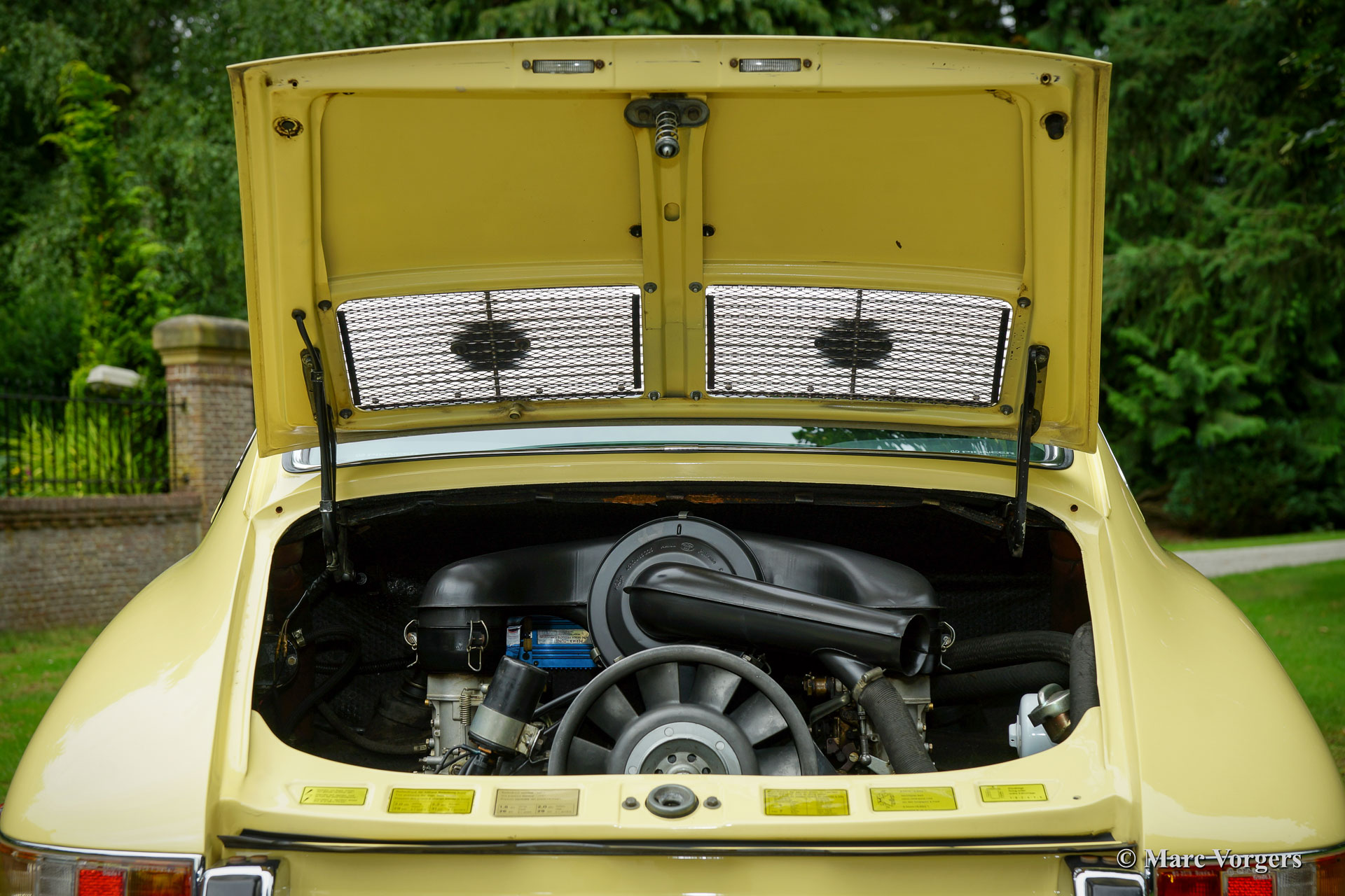 The Porsche 911 was designed with a steel unitary bodywork construction in which the engine was located behind the rear axle. The 911 engine is a air-cooled six cylinder "boxer" engine. The suspension of the Porsche 911 was independent from the start as was a five speed gearbox with floor shift.
