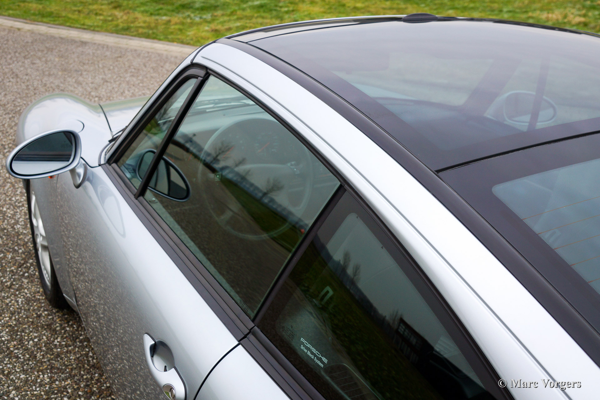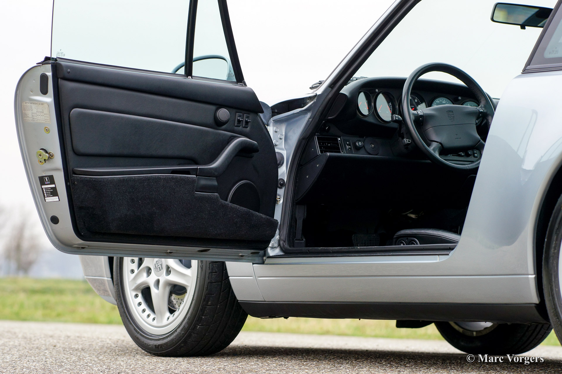 Three bodywork variants were available of the Porsche 911/ 993; buyers could choose a coupe, a Targa and a cabriolet. The Targa was the most intriguing variant. Porsche had created a very special open top construction for the Targa. The roof top was no longer a separate and detachable part. The 993 Targa roof was made of glass and it slides back completely parallel to the rear window! Very sophisticated and electrically operated. The rear view was not compromised, nor were the sleek looks of the car! Like the 911/964 the 993 was available with rear wheel drive or four wheel drive. The 911/ 993 models were however fitted with a six speed manual or Tiptronic gearbox. The cylinder capacity of the famous Porsche boxer engine was enlarged from 3.2 up to 3.6 Litre and it featured two sparking plugs per cylinder. Next to the Carrera (272 bhp.) we distinguish the following models: the Carrera S (285 bhp.), the light weight Carrera RS (300 bhp.), the Turbo (408 bhp.) and the Turbo S (450 bhp.)