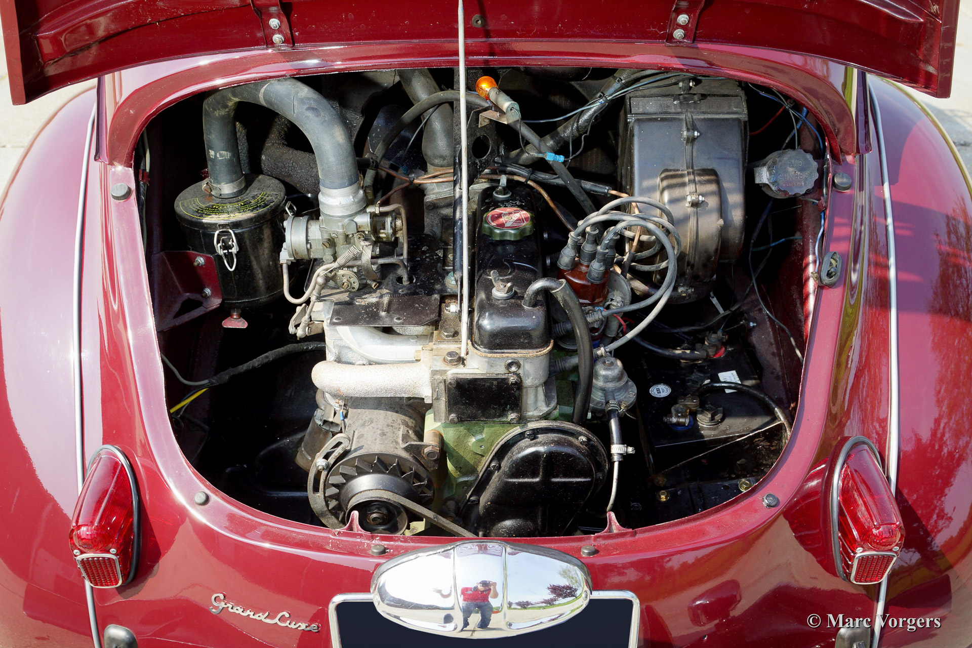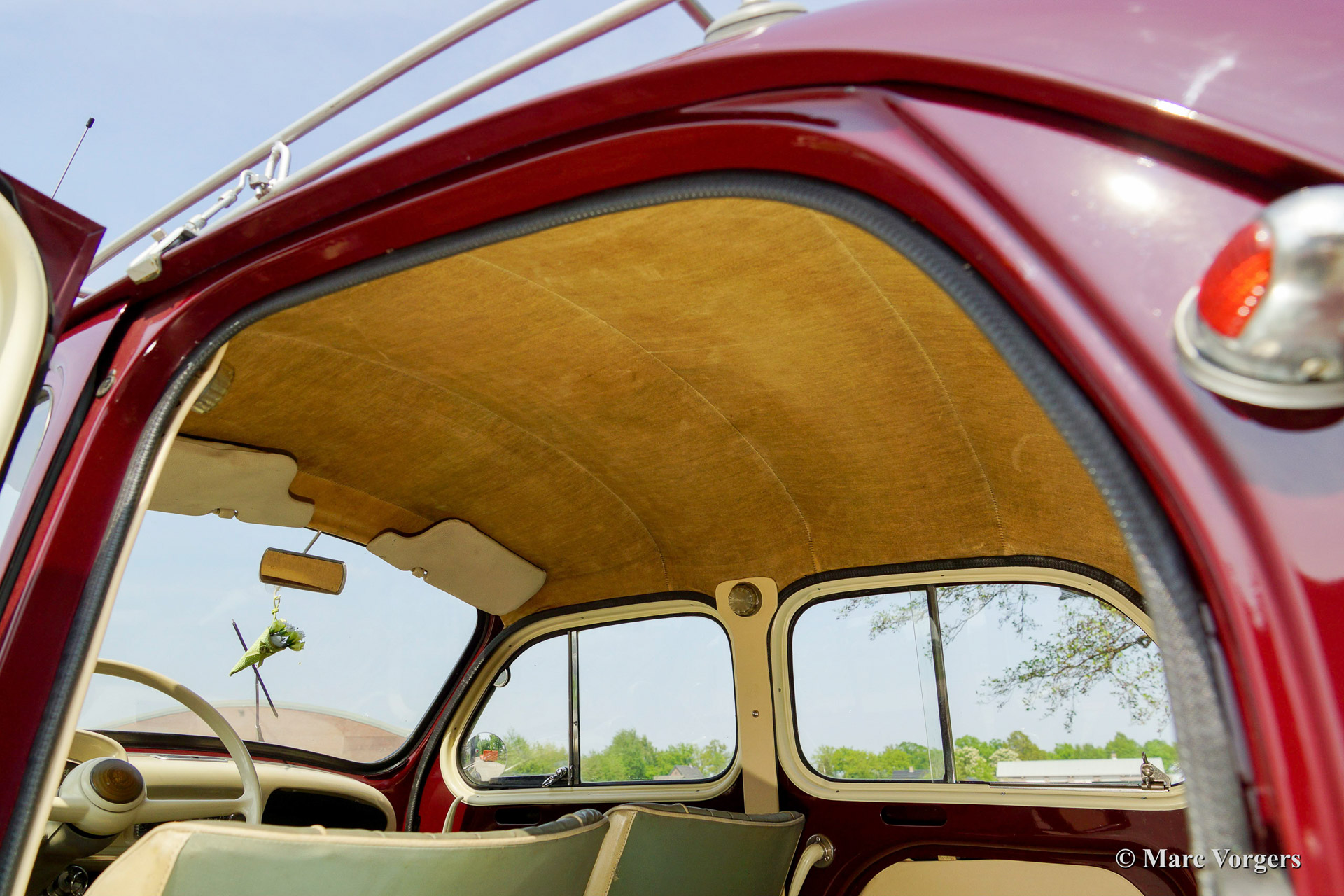 Renault 4 CV, year 1958. Colour Bordeaux red with a grey/crème vinyl interior. This delightful Renault 4 CV was restored with care for originality; all original details were retained. The automobile is in superb (excellent+) condition and the car drives perfect. This Renault comes with a fantastic original detachable roof rack and the car sports a beautiful classic radio!