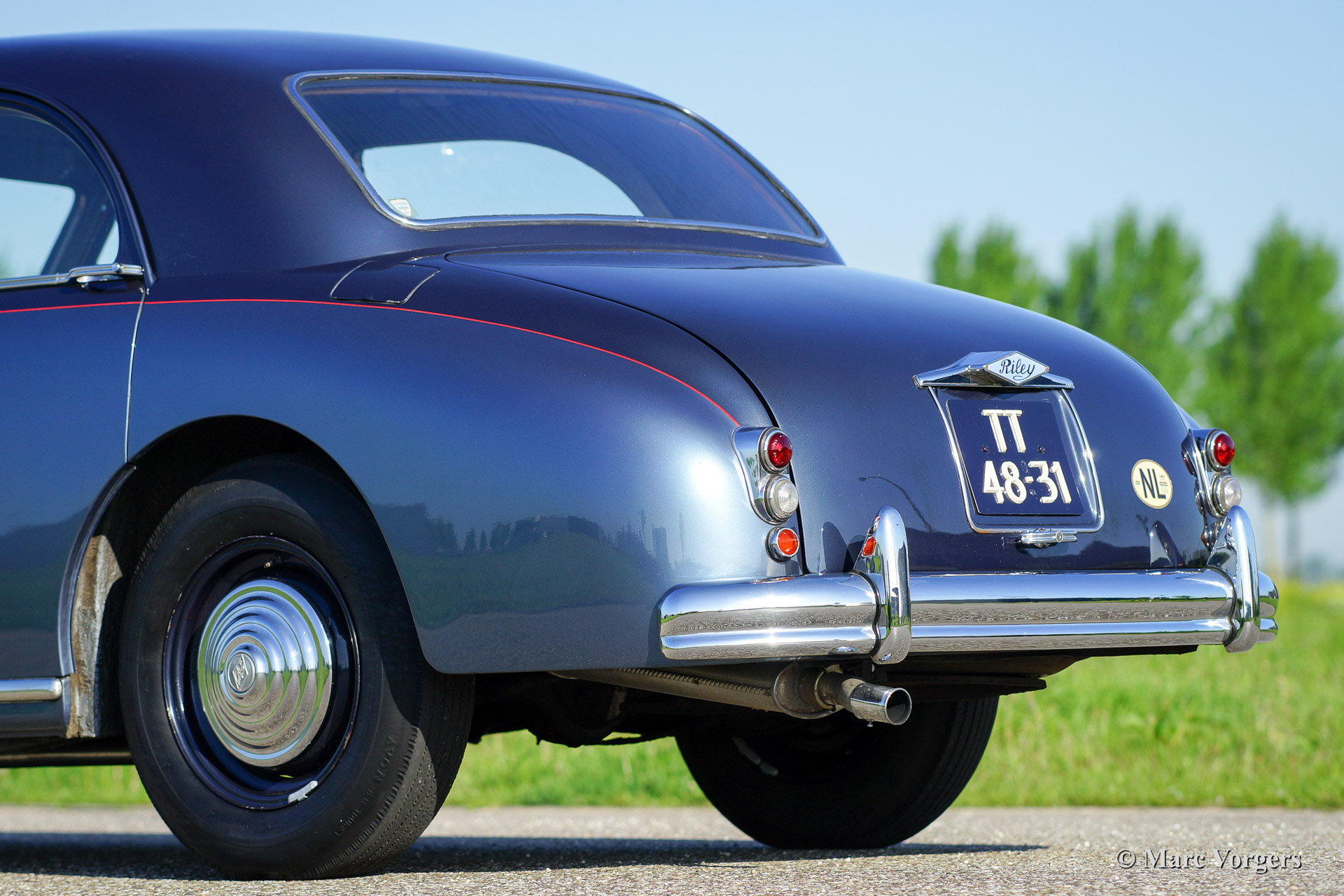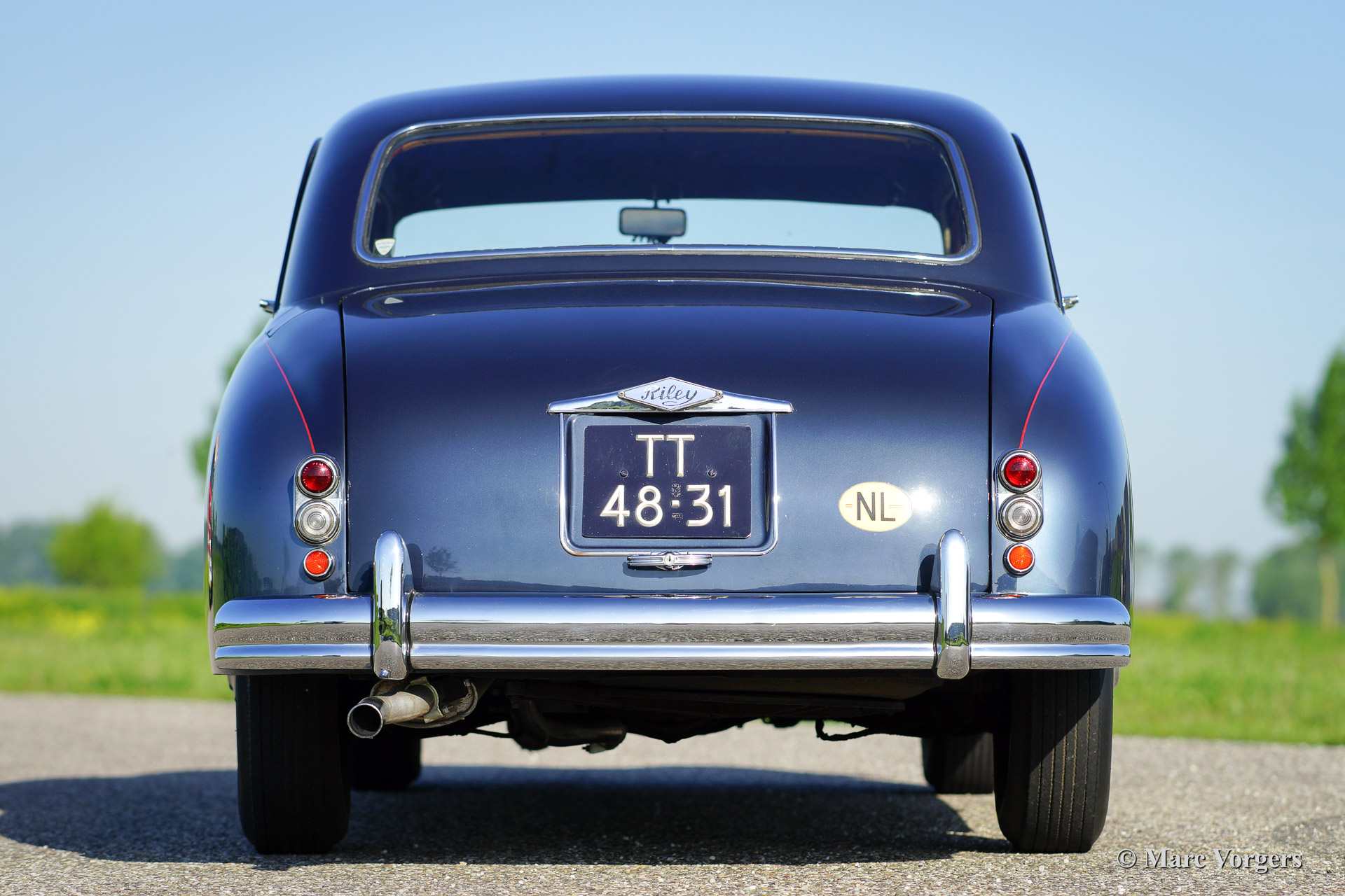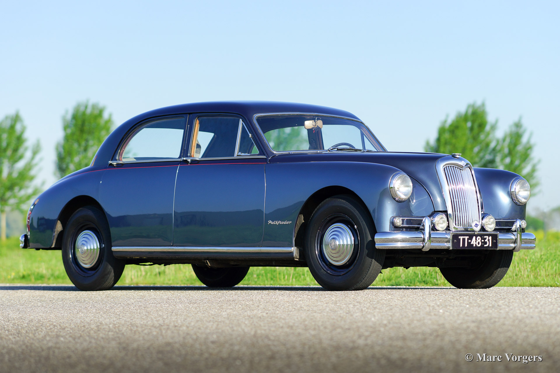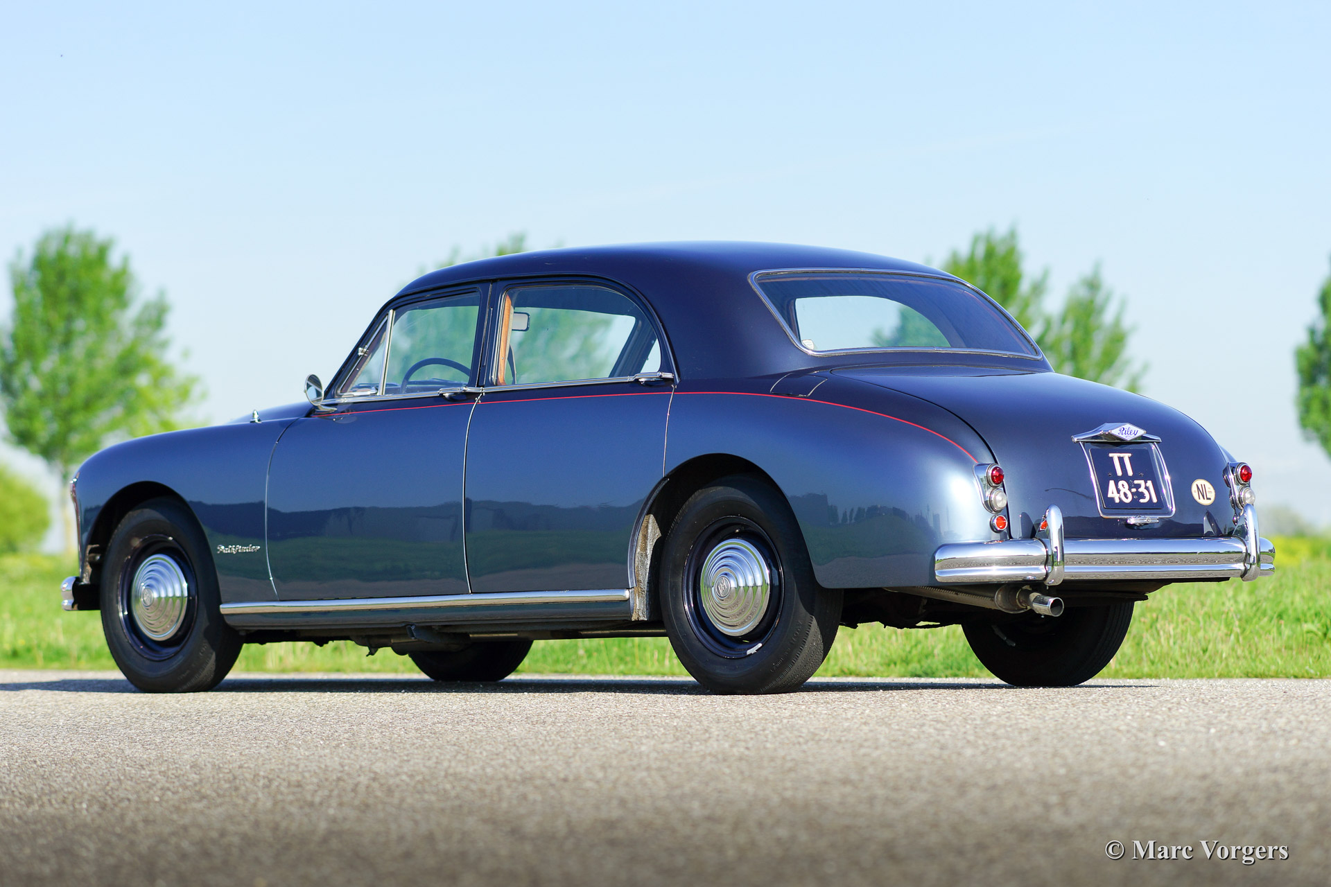 Riley Pathfinder, Jahr 1956. Fahrgestellnummer 42XX, Motornummer DP25R24XXX. Farbe zweifarbig blau metallic, geteilt durch einen roten Nadelstreifen an den Seiten. Interieur: hellgraue Ledersitze und blauen Teppich. Diese bemerkenswerte und seltene Riley Pathfinder wurde in den Niederlanden Neu verkauft. Das Auto kommt von dem dritten Besitzer. Alle Vorbesitzer und die Geschichte sind bekannt. Von 1953 bis 1957 wurden nur 5152 Fahrzeuge dieses Typs gebaut. Der Pathfinder ist mit der herrlichen "Twin-Cam" Riley Vierzylinder-Motor ausgestattet. Bemerkenswert ist die linke Position des Schalthebels in dieser Linkslenker Auto! Der Innenraum ist weitgehend mit Holz verkleidet und es gibt ausreichend Platz für 5 Erwachsene. Diese Riley ist in guten bis sehr guten Zustand. Es ist nicht wahrscheinlich das sie einem anderen Pathfinder treffen bei Oldtimerveranstaltungen oder sogar im Verkauf im internet.