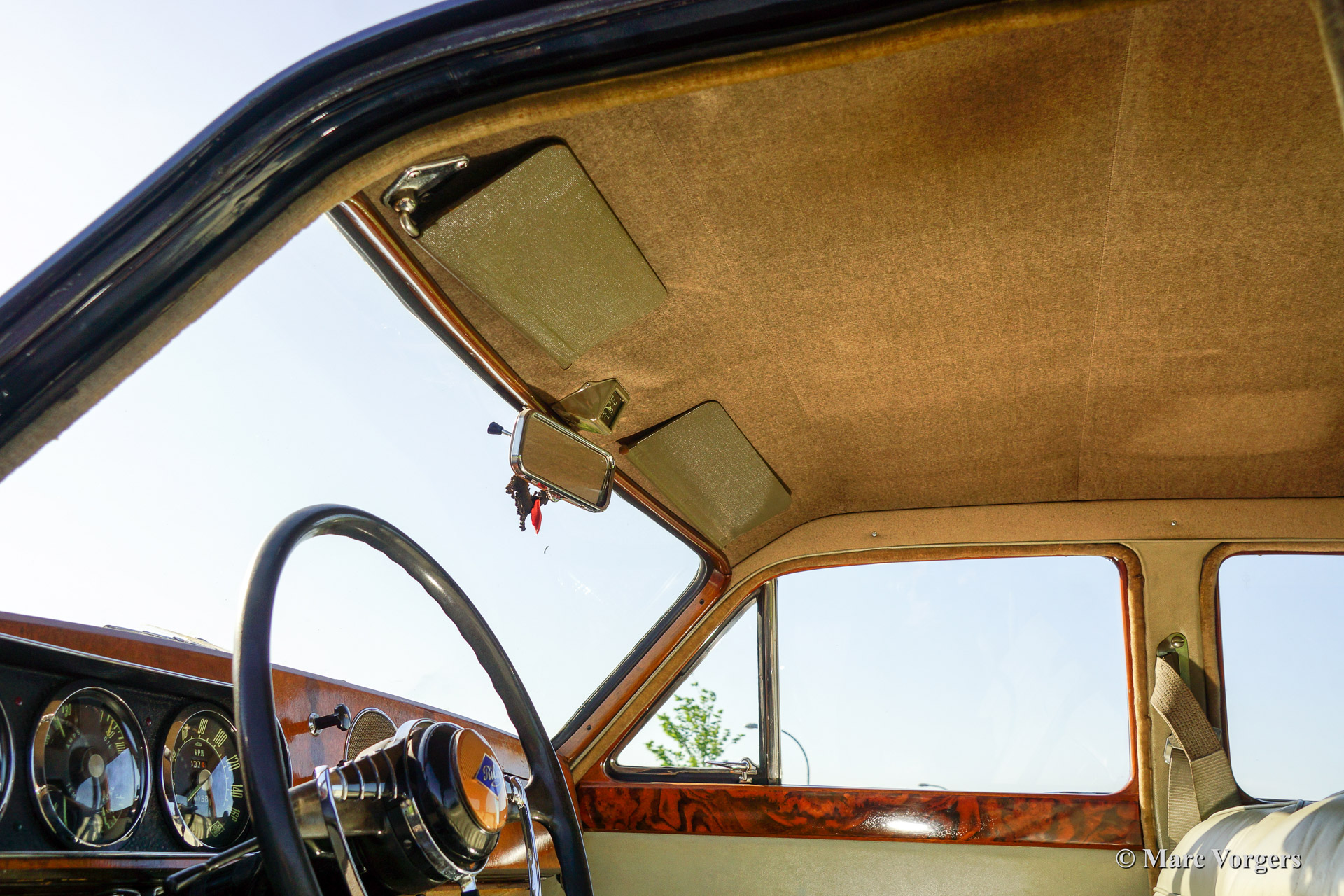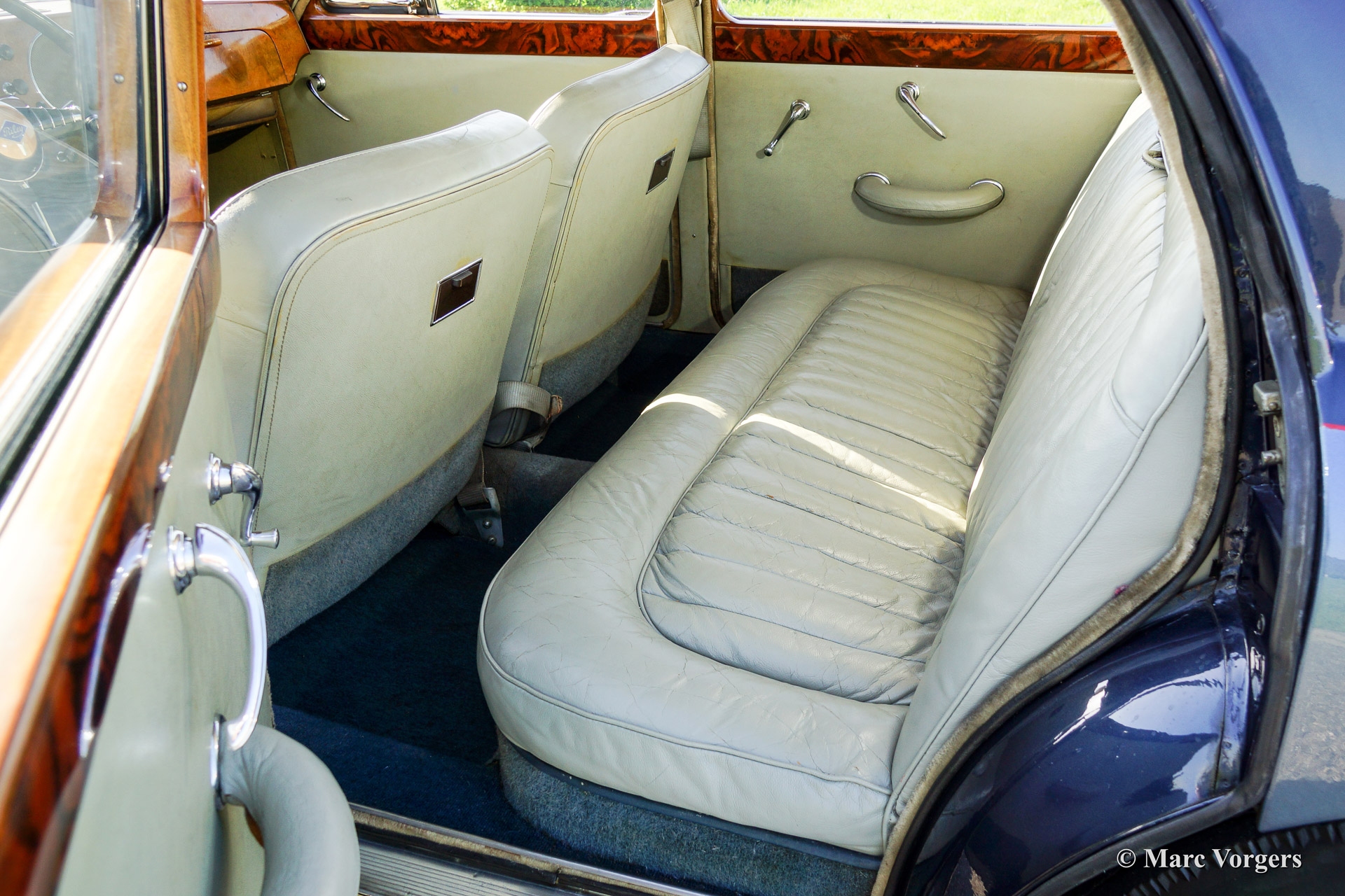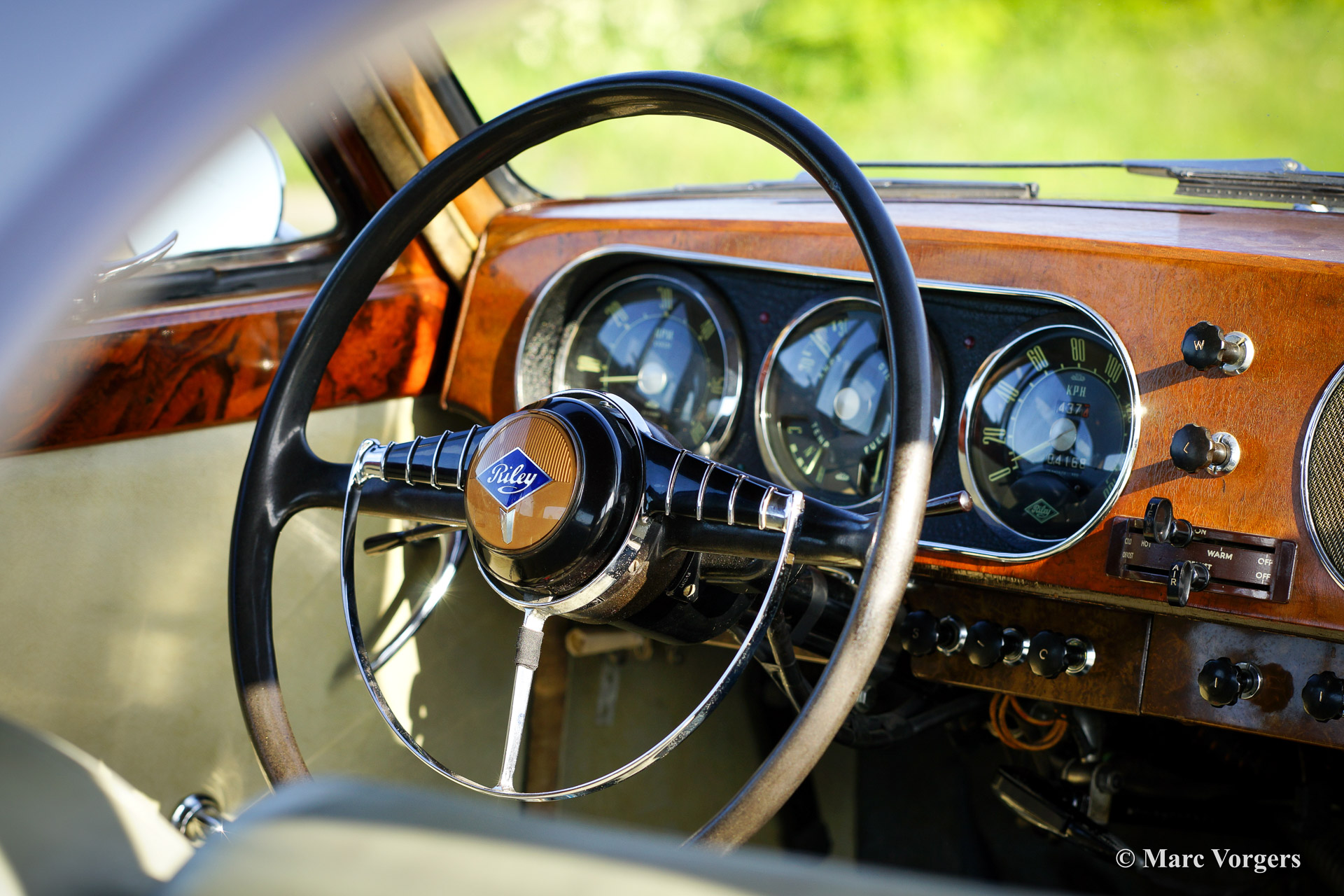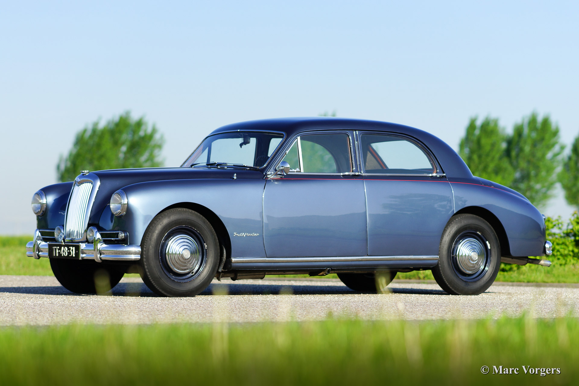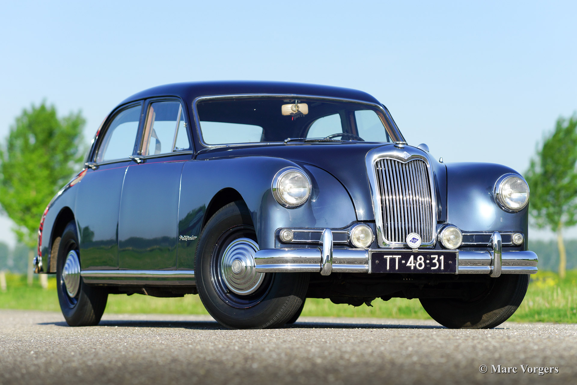Riley Pathfinder, Jahr 1956. Fahrgestellnummer 42XX, Motornummer DP25R24XXX. Farbe zweifarbig blau metallic, geteilt durch einen roten Nadelstreifen an den Seiten. Interieur: hellgraue Ledersitze und blauen Teppich. Diese bemerkenswerte und seltene Riley Pathfinder wurde in den Niederlanden Neu verkauft. Das Auto kommt von dem dritten Besitzer. Alle Vorbesitzer und die Geschichte sind bekannt. Von 1953 bis 1957 wurden nur 5152 Fahrzeuge dieses Typs gebaut. Der Pathfinder ist mit der herrlichen "Twin-Cam" Riley Vierzylinder-Motor ausgestattet. Bemerkenswert ist die linke Position des Schalthebels in dieser Linkslenker Auto! Der Innenraum ist weitgehend mit Holz verkleidet und es gibt ausreichend Platz für 5 Erwachsene. Diese Riley ist in guten bis sehr guten Zustand. Es ist nicht wahrscheinlich das sie einem anderen Pathfinder treffen bei Oldtimerveranstaltungen oder sogar im Verkauf im internet.