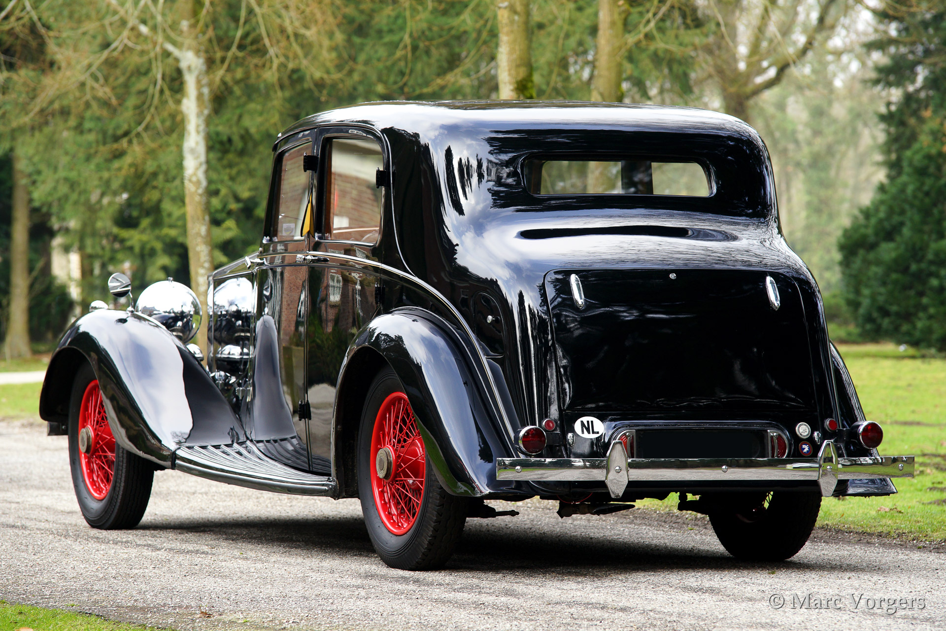 Rolls Royce 25/30 Hooper sports saloon, 1937. Colour black with a dark green leather interior. Green wool carpet. Red enameled wire wheels. This Rolls Royce with Hooper sports saloon bodywork is in very good and very original condition throughout. The automobile was sold new in the United Kingdom.