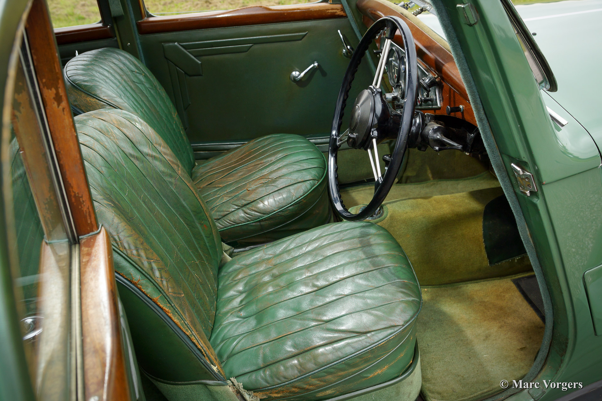 Rover 14 HP Sports Saloon, Jahr 1946. Farbe Grün mit einer grünen Lederausstattung und grünen Teppich. Dieses schöne Rover 14 Sport saloon ist in sehr gutem Originalzustand. Das Auto wurde nur mal neu lackiert in der Vergangenheit; eine echte Zeitmaschine mit schöner Patina! Das Auto ist perfekt dokumentiert. Die frühere eigner sind bekannt und ein Heritage Zertifikat, historische Papiere und Rechnungen sind vorhanden. Sogar einige Ersatzteile sind im Lieferumfang enthalten! Eine reizvolle Englische Oldtimer mit einem herrlichen Sechszylinder-Motor und ein Original-Schiebedach!