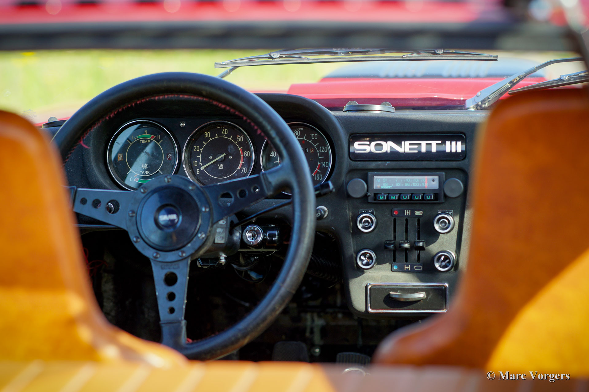 Saab Sonett III, Jahr 1971. Farbe dunkelrot kombiniert mit einer braunen Kunstlederausstattung, braunem Teppich und grauen Schutzmatten. Dieser seltene Saab Sonett III wurde kürzlich restauriert / verbessert. Auch der V4-Motor und das Getriebe wurden überholt. Fotos, die die Arbeiten zeigen, sind vorhanden. Dieser unglaublich besondere Saab Sonett III ist in einem sehr guten Zustand und das Auto bietet ein einzigartiges Fahrerlebnis. Der Saab Sonett wurde für den US-Markt entwickelt und von 1970 bis 1974 wurden 8368 Autos dieses Typs gebaut. Das Sonett ist ein Leichtbau-Sportwagen mit GFK-Karosserie (830 kg Leergewicht) auf Basis der Saab 96 V4 Bodenplatte. Das Auto mit Frontantrieb wird vom gleichen Ford V4-Motor wie der Saab 96 angetrieben und verfügt über ein Vierganggetriebe. Der Innenraum ist kompakt und zweckmäßig und ausgestattet mit einem Saab-Sportlenkrad und einem Sonett-Markenradio mit FM. Fahrer mit einer Körpergröße von 1.80-85 finden gerade noch einen Platz hinter dem Lenkrad. Dieser Saab Sonett III zeigt alle originalen Details einschließlich originaler Alufelgen. Dies ist ein Oldtimer, den Sie im Wirklichkeit sehen und erleben müssen. Sie sind herzlich eingeladen, diesen Saab Sonett in unserem Showroom zu besichtigen!