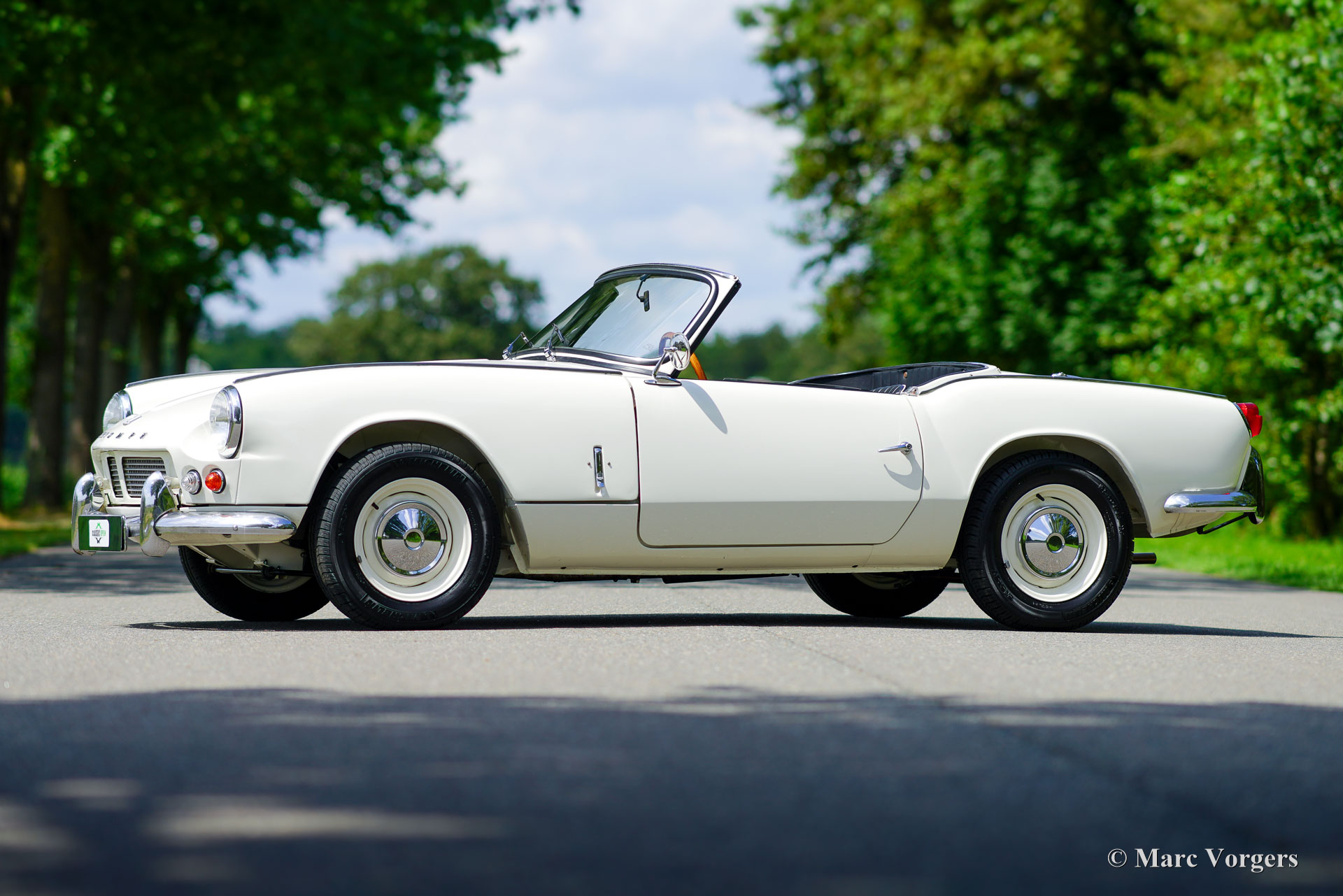 Triumph Spitfire 4, Jahr 1964. Farbe Old English White kombiniert mit schwarzem Kunstleder-Interieur und schwarzem Teppich. Schwarzes Vinyl-Verdeck und ein Hardtop in Wagenfarbe. Der Triumph Spitfire wurde vom berühmten italienischen Designer Michelotti entworfen. Der Spitfire 4 war das erste Modell, das zwischen 1962 und 1965 gebaut wurde und erhielt nachträglich den Namen Mk I. Dieses sehr schöne Exemplar wurde „Body-off“ restauriert und das Auto hat seit Abschluss der Restaurierung nur 3800 Kilometer zurückgelegt. Diese Spitfire ist in einem sehr guten bis hervorragenden Zustand, hier und da sind leichte Gebrauchsspuren zu erkennen. Der Spitfire fährt und handhabt sich sehr gut. Die Hohlräume und Nähte der Karosserie und der Motorhaube wurden mit braunem Wachs vom Typ Waxoyl/ML vor Korrosion geschützt. Der 1147-cm³-Vierzylindermotor hat zwei S.U. Vergaser und der Motor leistet satte 63 PS. Das Vierganggetriebe schaltet sehr gut und ist mit der begehrten Overdrive-Option ausgestattet! Dieser Spitfire 4 zeigt alle Originaldetails, einschließlich des Originallenkrads und der originalen Stahlscheibenräder mit verchromten Radkappen! Der Kilometerzähler zeigt km/h an statt mph. Dieser prächtige Triumph Spitfire ist ein begehrtes frühes Modell, komplett mit originalem Hardtop!