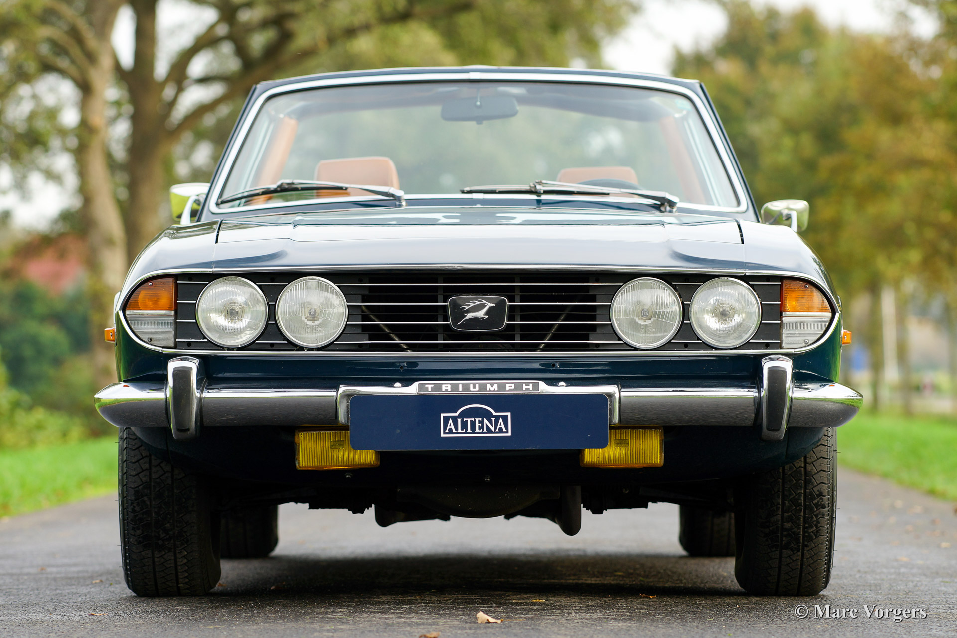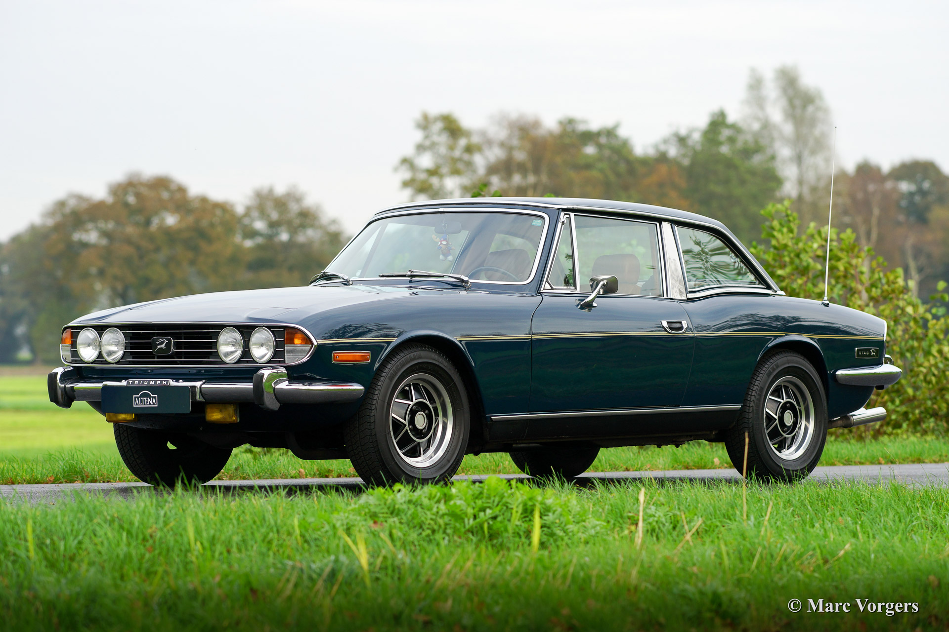 Triumph Stag, year 1974. Chassis number LD 3148X XX. Body colour blue with a cognac colour leatherette interior. This beautiful Triumph Stag was sold new in the Netherlands. The automobile is in excellent original condition! From new the car has known only three cautious owners who kept the car in fantastic shape. The body work, the interior, the engine room, the boot and the underside of the car look beautifully original with just slight traces of use. The Triumph V8 engine runs and sounds perfect and the car handles and drives superbly. This Stag features a manual gearbox (rare) and power steering. The cooling system has been up rated to improve the cooling capacity. The expansion tank was placed higher up, a high capacity radiator was fitted as was an electric Kenlow cooling fan. Furthermore the car sports electronic ignition (Lumenition) and a Smiths oil pressure meter (dashboard accessory). This fantastic Triumph Stag is complete with original hard top in body colour. The hard top sports a heated rear window! This is a wonderful and very original Triumph Stag, you will be hard pressed to find another specimen in this condition!