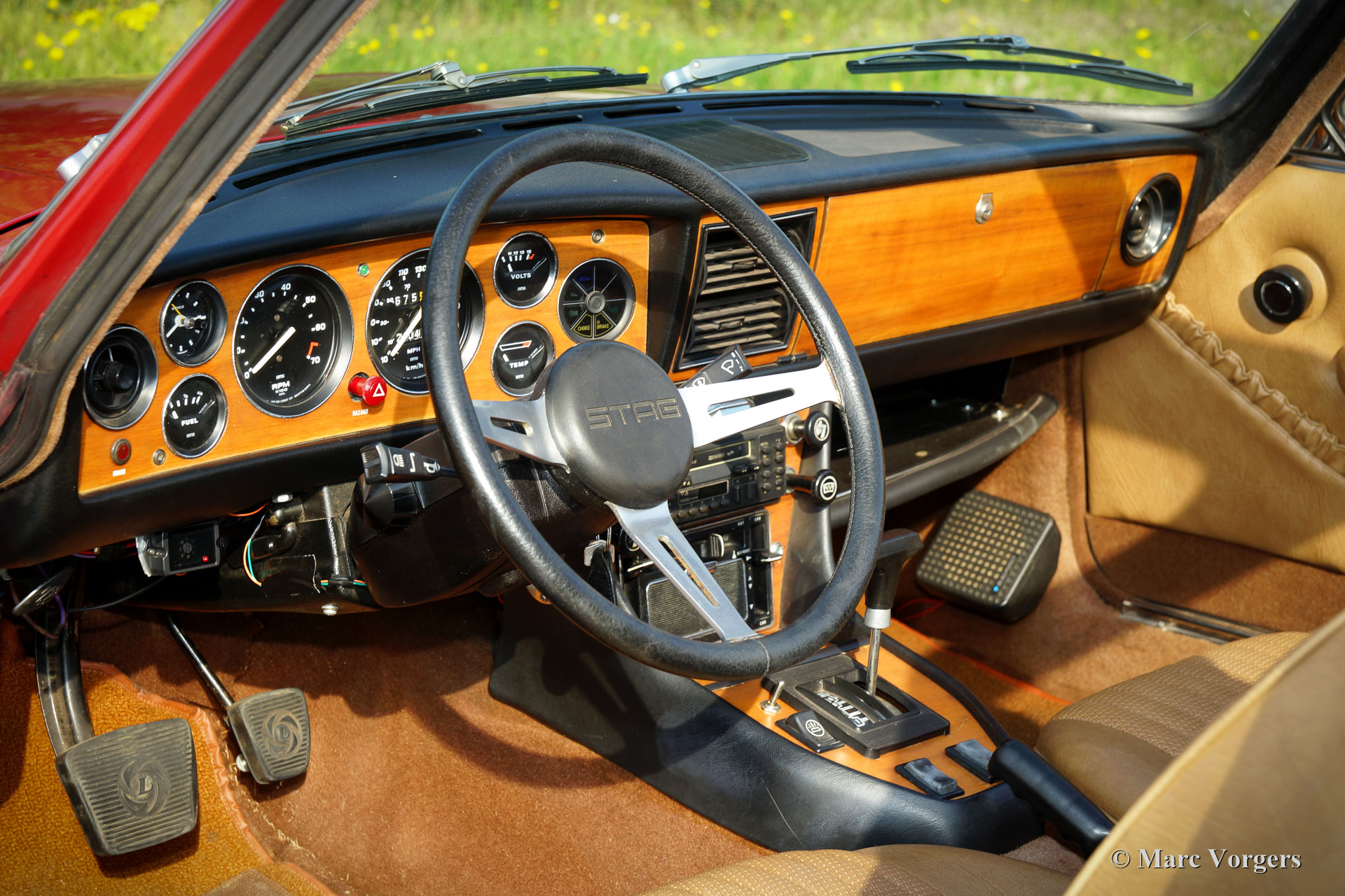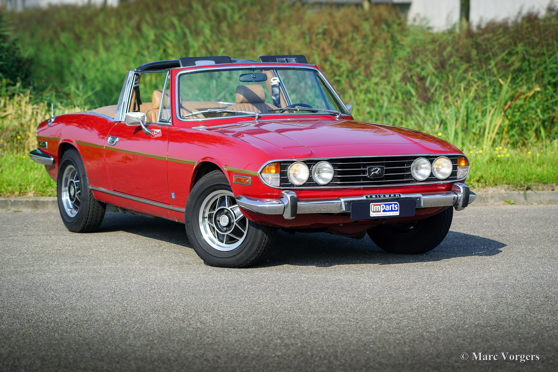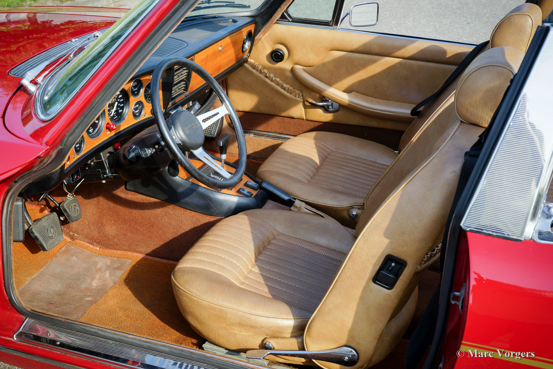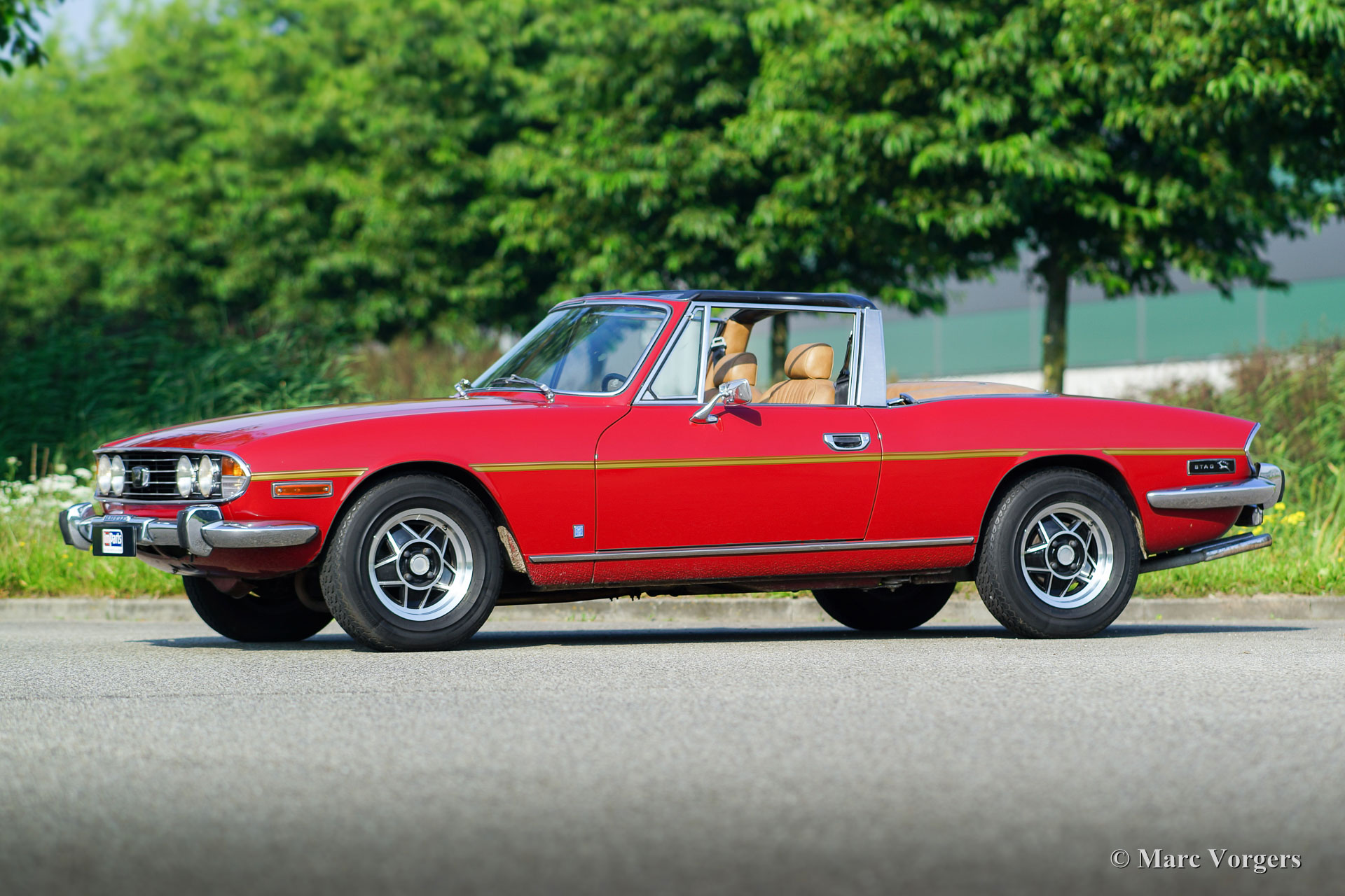 Triumph Stag, Jahr 1975. Farbe dunkelrot (Carmine Red) mit einem beigefarbenen Kunstleder-Interieur und einem schwarzen Verdeck. Dieser fantastische Triumph Stag ist in einem sehr guten und sehr originellen Zustand! Das Auto zeigt alle Originaldetails. Die Karosserie wurde vor einigen Jahren in der Originalfarbe neu lackiert und der Innenraum ist voll original und in einwandfreiem Zustand! Der ursprüngliche 3-Liter-Triumph V8-Motor wurde bessere Kühlung gegeben durch die Montage eines Sammeltanks am Kühlsystem, eines zusätzlichen elektrischen Kühlgebläses und eines Ölkühlers. Auch wurde einem Öldruckmesser montiert. Das Auto ist werksseitig versehen von Servolenkung, Servo-unterstützten Bremsen, elektrisch betriebenen Seiten-Fenstern und ein automatisches Getriebe. Zusätzlich sind ein Edelstahl-Auspuff und Antriebswellen mit homokinetischen Kupplungen (verbesserte Ausdauer) montiert. Das 2 + 2 Interieur ist recht geräumig und bietet ausreichend Platz für eine Familie mit zwei größeren Kindern oder jungen Erwachsenen. Vor kurzem wurden vier neue Räder montiert und mit Vredestein Reifen (185-14) ausgestattet. Dies ist ein geräumiges, praktisches und bequemes englisches Cabrio in einem sehr guten Zustand und mit einer ganz schönen Auspuffnote!