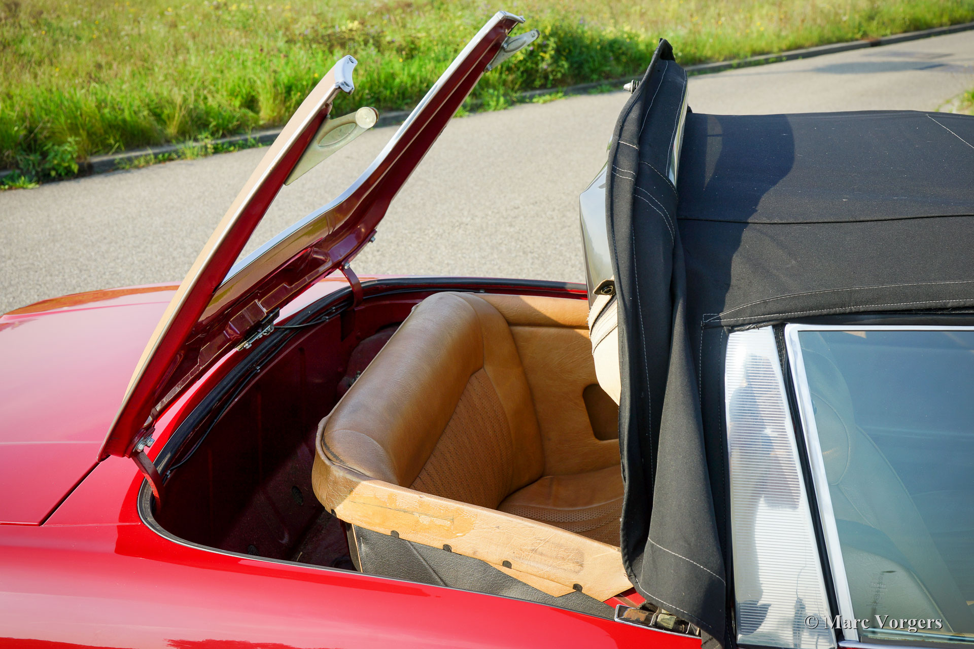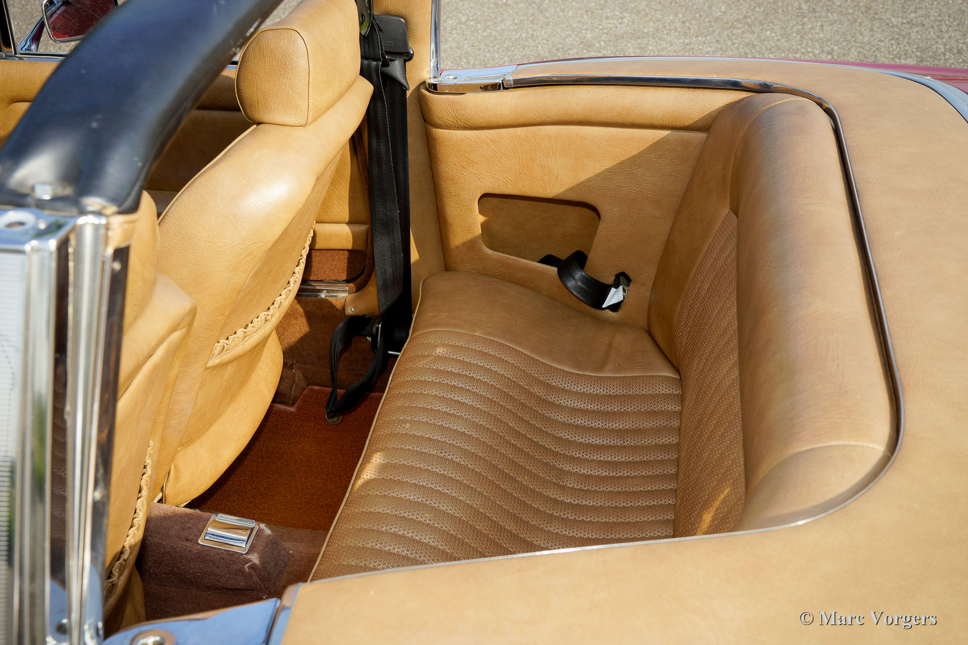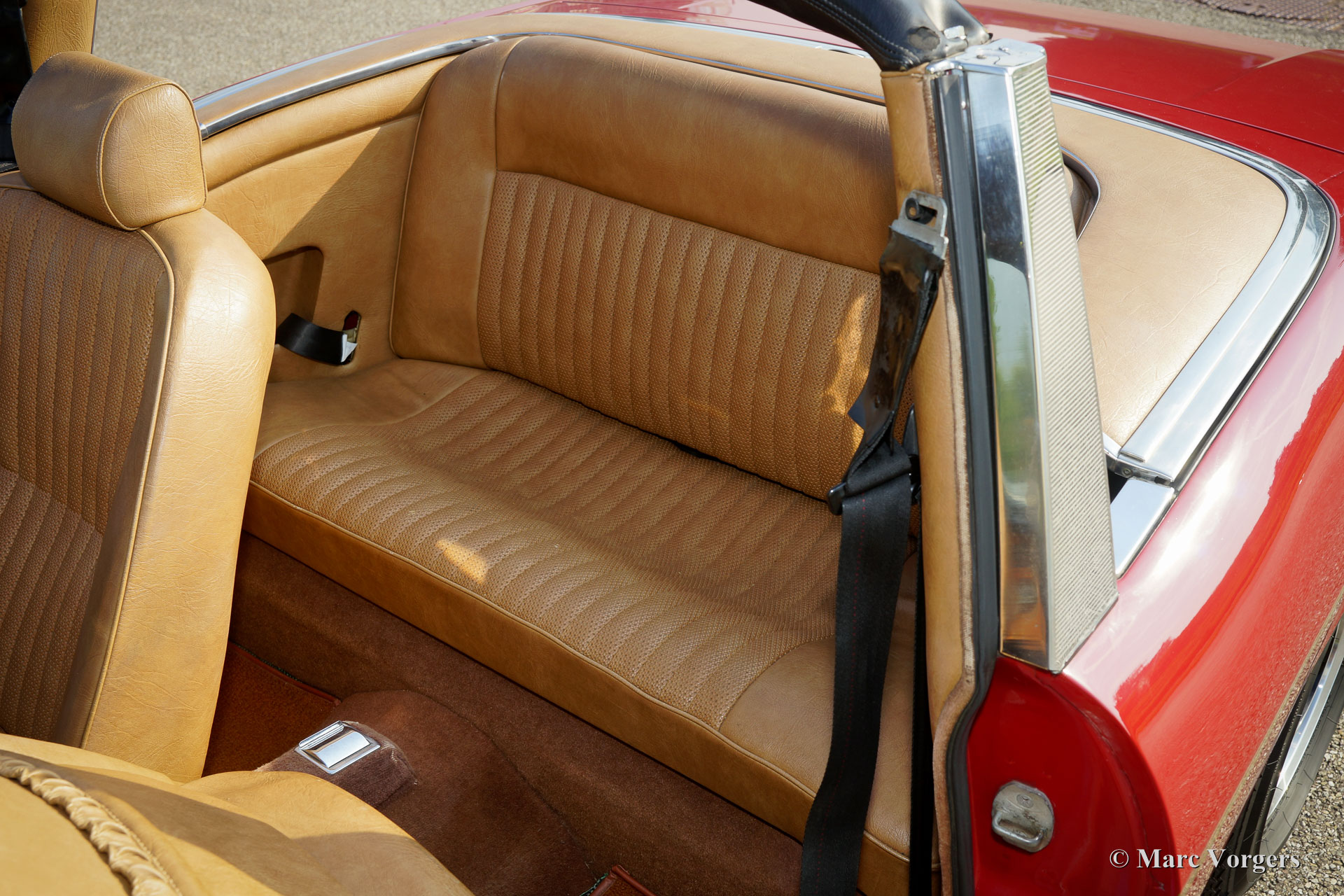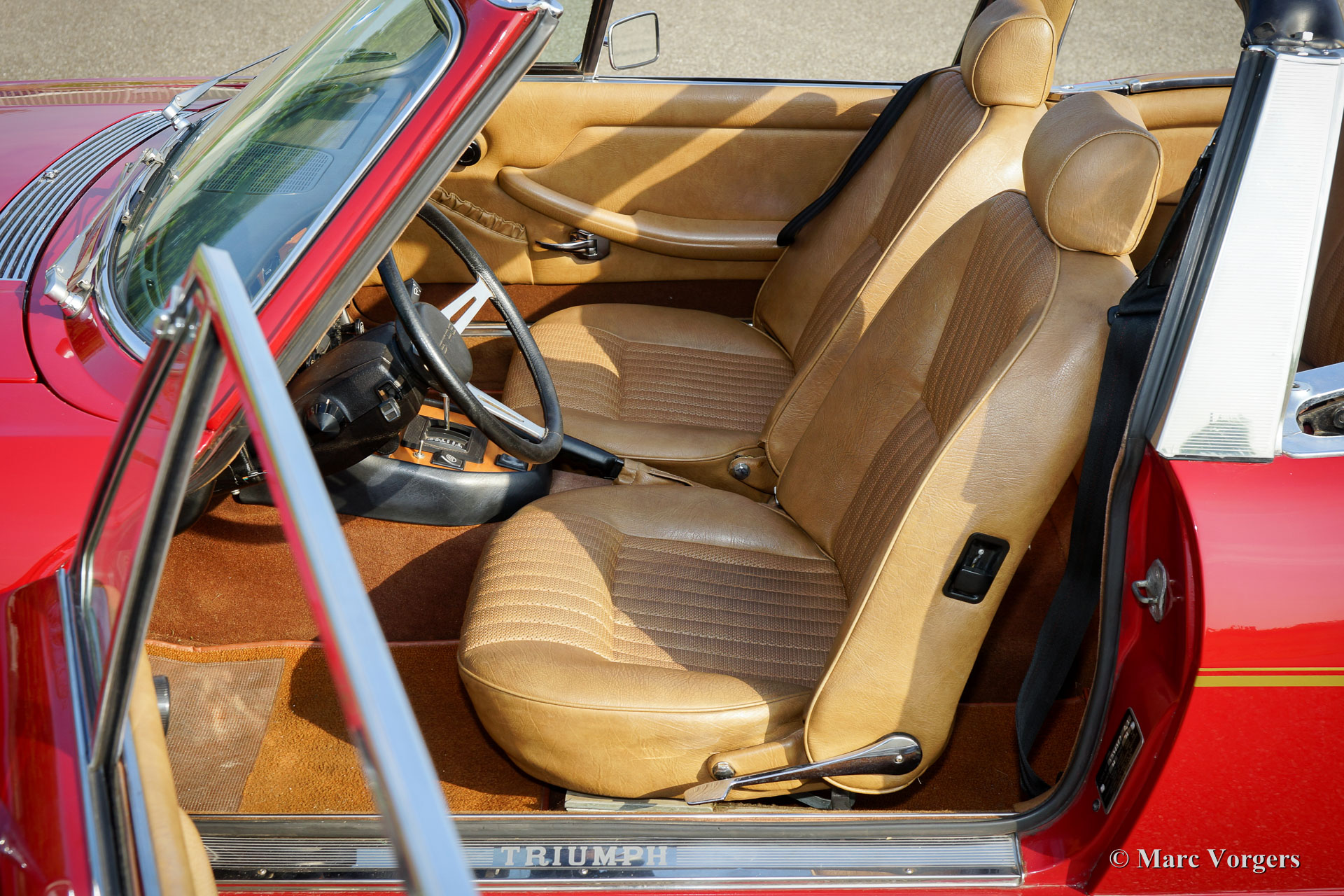 Triumph Stag, Jahr 1975. Farbe dunkelrot (Carmine Red) mit einem beigefarbenen Kunstleder-Interieur und einem schwarzen Verdeck. Dieser fantastische Triumph Stag ist in einem sehr guten und sehr originellen Zustand! Das Auto zeigt alle Originaldetails. Die Karosserie wurde vor einigen Jahren in der Originalfarbe neu lackiert und der Innenraum ist voll original und in einwandfreiem Zustand! Der ursprüngliche 3-Liter-Triumph V8-Motor wurde bessere Kühlung gegeben durch die Montage eines Sammeltanks am Kühlsystem, eines zusätzlichen elektrischen Kühlgebläses und eines Ölkühlers. Auch wurde einem Öldruckmesser montiert. Das Auto ist werksseitig versehen von Servolenkung, Servo-unterstützten Bremsen, elektrisch betriebenen Seiten-Fenstern und ein automatisches Getriebe. Zusätzlich sind ein Edelstahl-Auspuff und Antriebswellen mit homokinetischen Kupplungen (verbesserte Ausdauer) montiert. Das 2 + 2 Interieur ist recht geräumig und bietet ausreichend Platz für eine Familie mit zwei größeren Kindern oder jungen Erwachsenen. Vor kurzem wurden vier neue Räder montiert und mit Vredestein Reifen (185-14) ausgestattet. Dies ist ein geräumiges, praktisches und bequemes englisches Cabrio in einem sehr guten Zustand und mit einer ganz schönen Auspuffnote!
