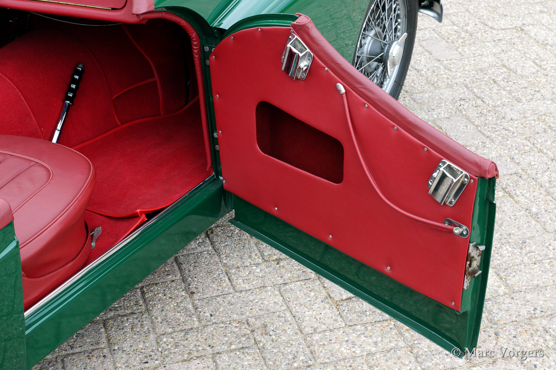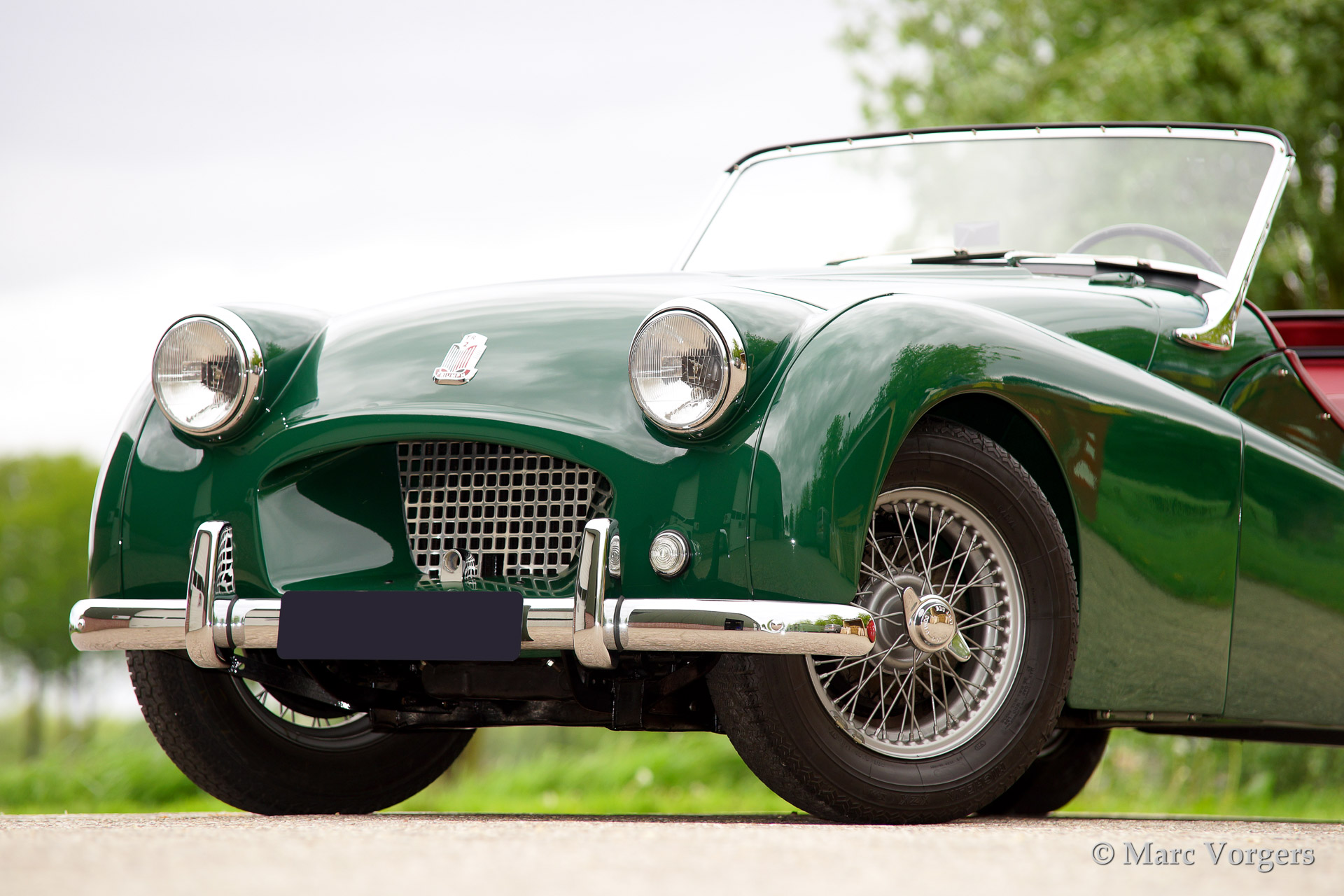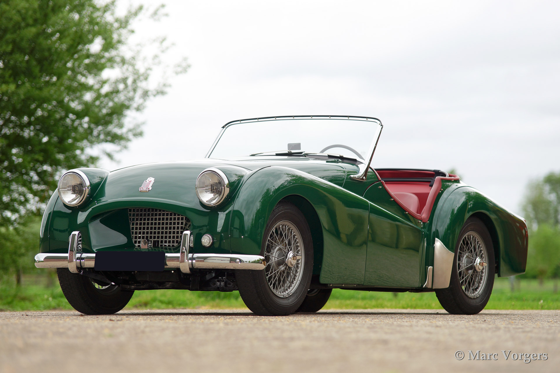 Triumph TR 2 'long door', year 1954. Colour green with a red leather interior. Black hood and side screens. This fantastic Triumph TR 2 was extensively and beautifully restored to original specifications, concours! This is an early and rare TR 2 'long door' model.