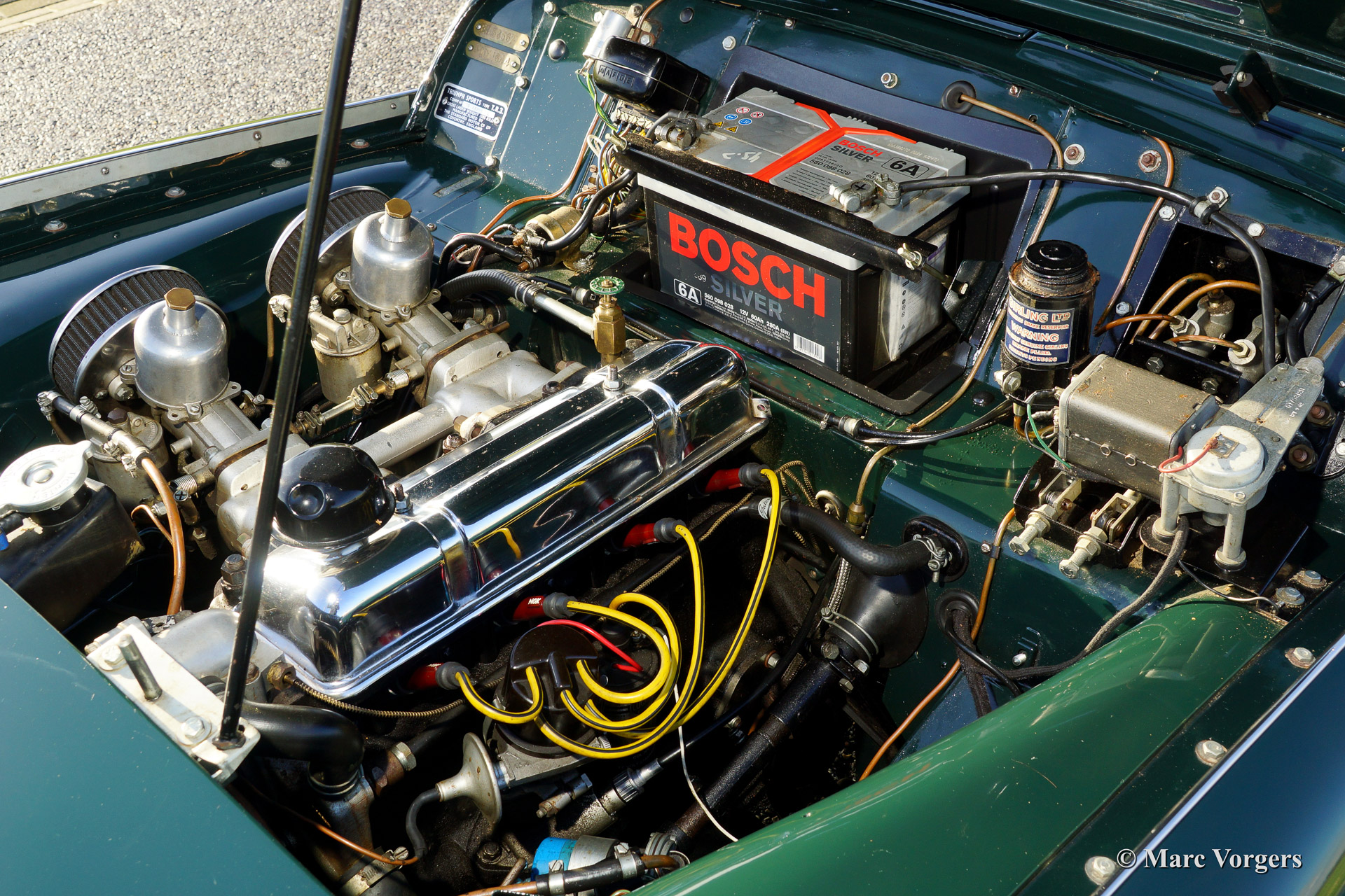 The Triumph TR 3 is a no nonsense sports car; very robust, simple and reliable, a true British sports car all over. The TR 3 was the first production car, off factory, equipped with disc brakes on the front-wheels. The engine was a Standard Vanguard based, cast-iron, long stroke, in-line four cylinder with a displacement of 1991cc. The TR 3 engine was equipped with two carburettors giving a power-output of almost 100 bhp.