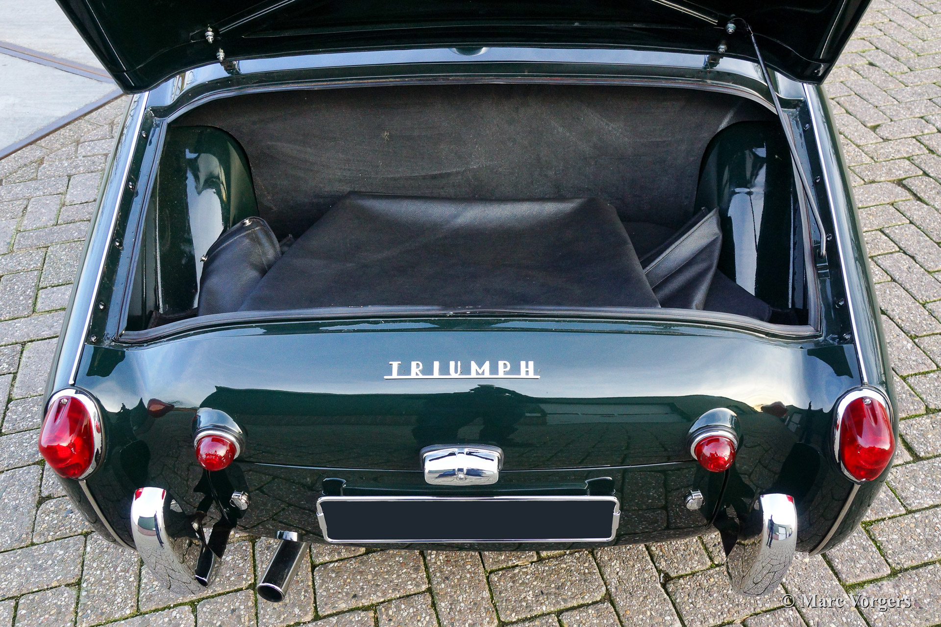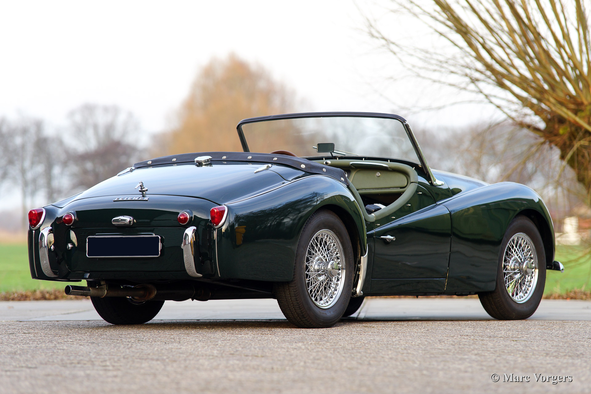 The Triumph TR 3 was uprated twice during the entire production period. In 1957 the car became a wider grille, door handles on the outside and slightly recessed headlamps and was named TR 3a then. In 1960-61 the cylinder capacity was enlarged to 2138 cc. giving a capacity of 104 bhp. and extra torque. Also the fully synchronized TR4 gearbox was incorporated. The car was then named TR 3b. The TR 3 is a pure two-person roadster, a classic generously giving you the fifties British sports car feeling, rough but honest. It comes with a simple soft-top for weather protection. Separate clip-on side screens can additionally be attached to the doors.