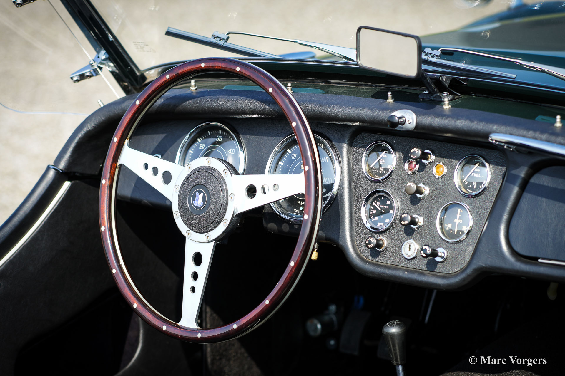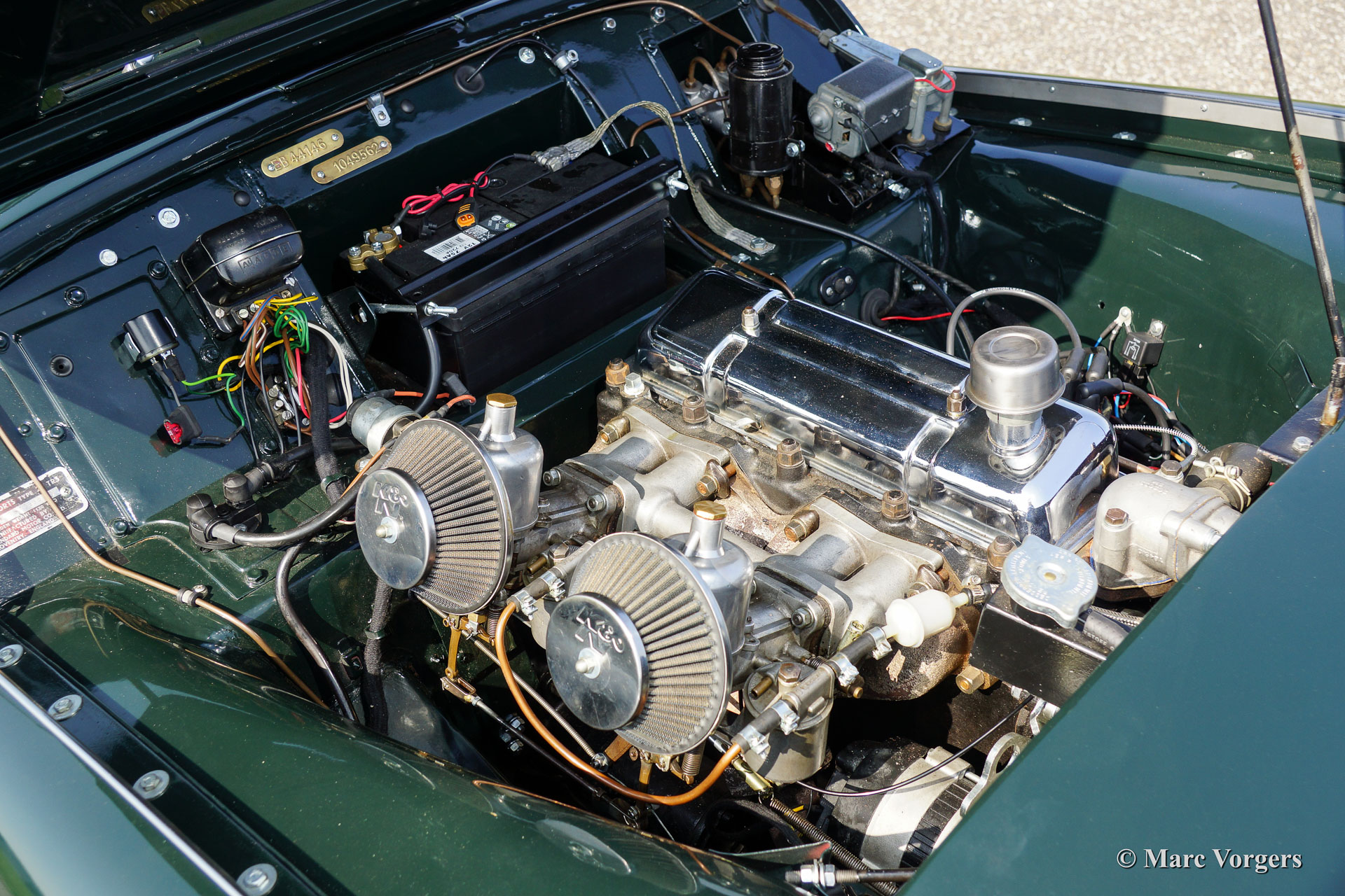 The Triumph TR 3 is a no nonsense sports car; very robust, simple and reliable, a true British sports car all over. The TR 3 was the first production car, off factory, equipped with disc brakes on the front-wheels. The engine was a Standard Vanguard based, cast-iron, long stroke, in-line four cylinder with a displacement of 1991cc. The TR 3 engine was equipped with two carburettors giving a power-output of almost 100 bhp.