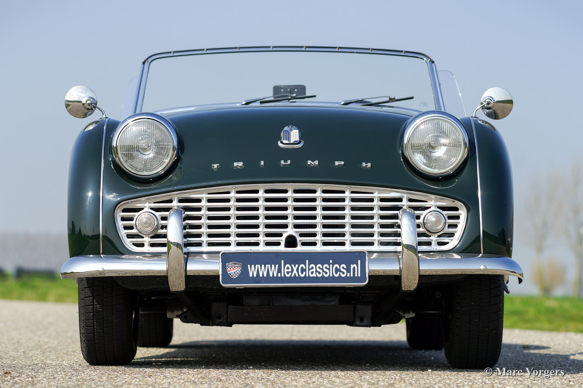 The Triumph TR 3 was uprated twice during the entire production period. In 1957 the car became a wider grille, door handles on the outside and slightly recessed headlamps and was named TR 3a then. In 1960-61 the cylinder capacity was enlarged to 2138 cc. giving a capacity of 104 bhp. and extra torque. Also the fully synchronized TR4 gearbox was incorporated. The car was then named TR 3b. The TR 3 is a pure two-person roadster, a classic generously giving you the fifties British sports car feeling, rough but honest. It comes with a simple soft-top for weather protection. Separate clip-on side screens can additionally be attached to the doors.