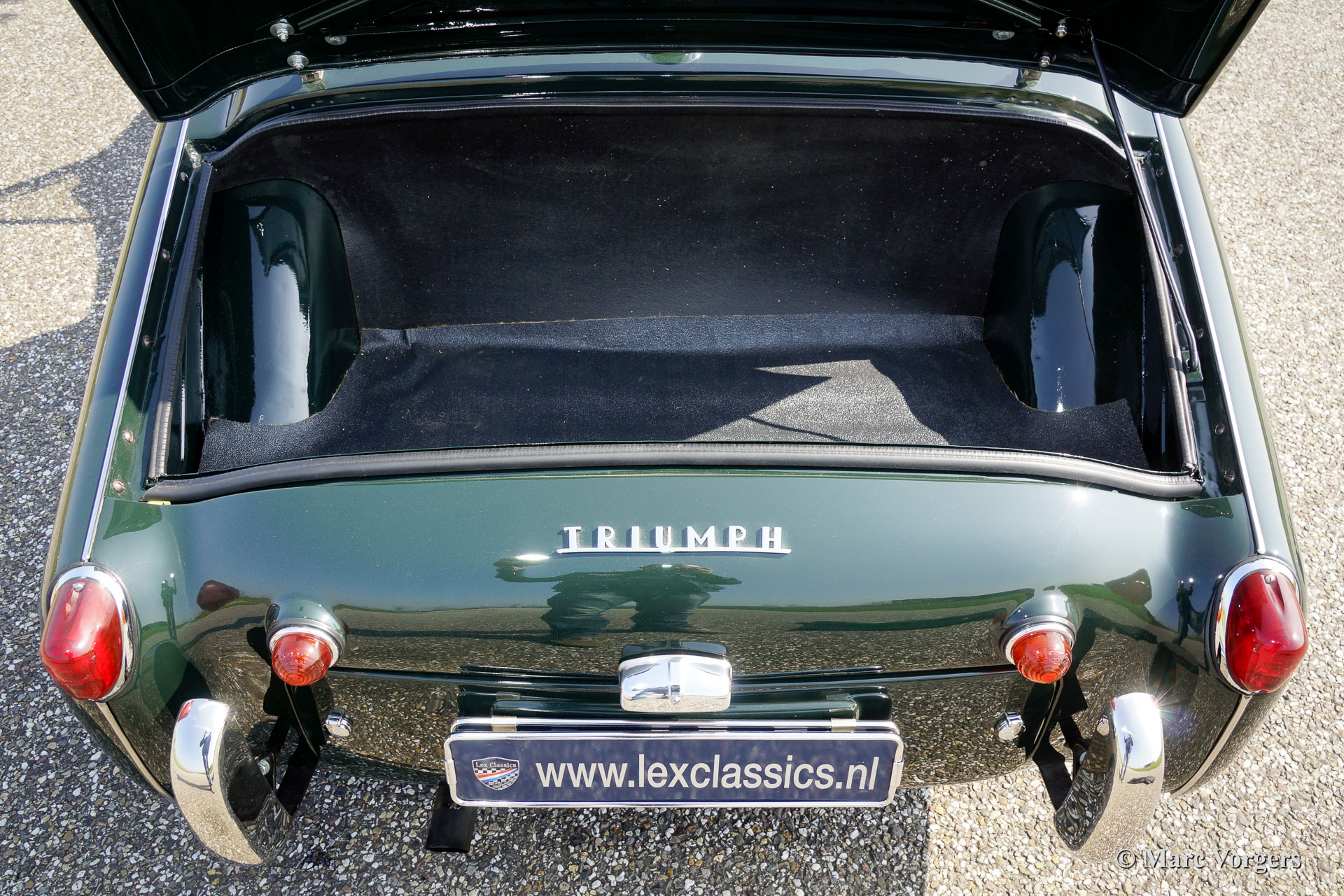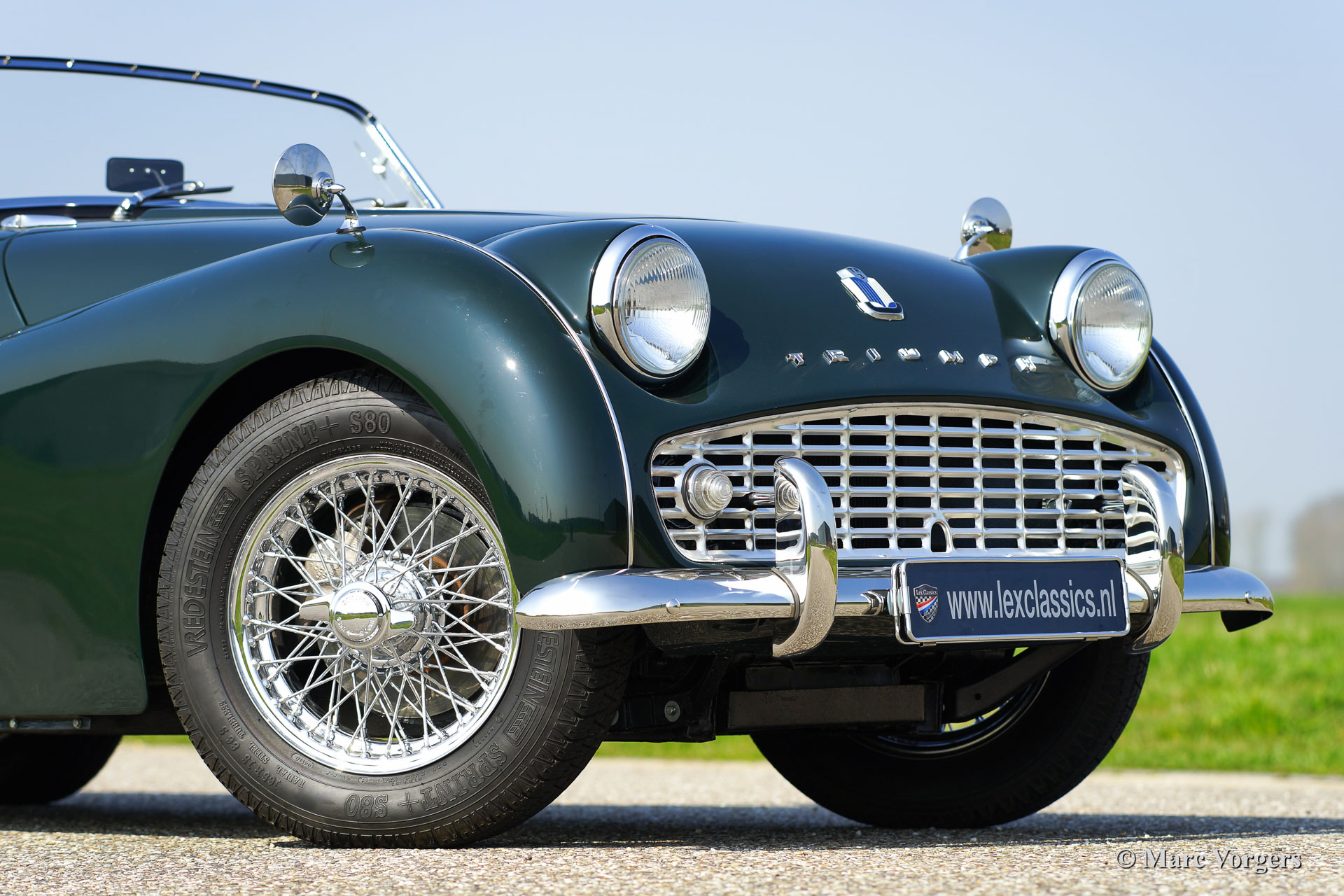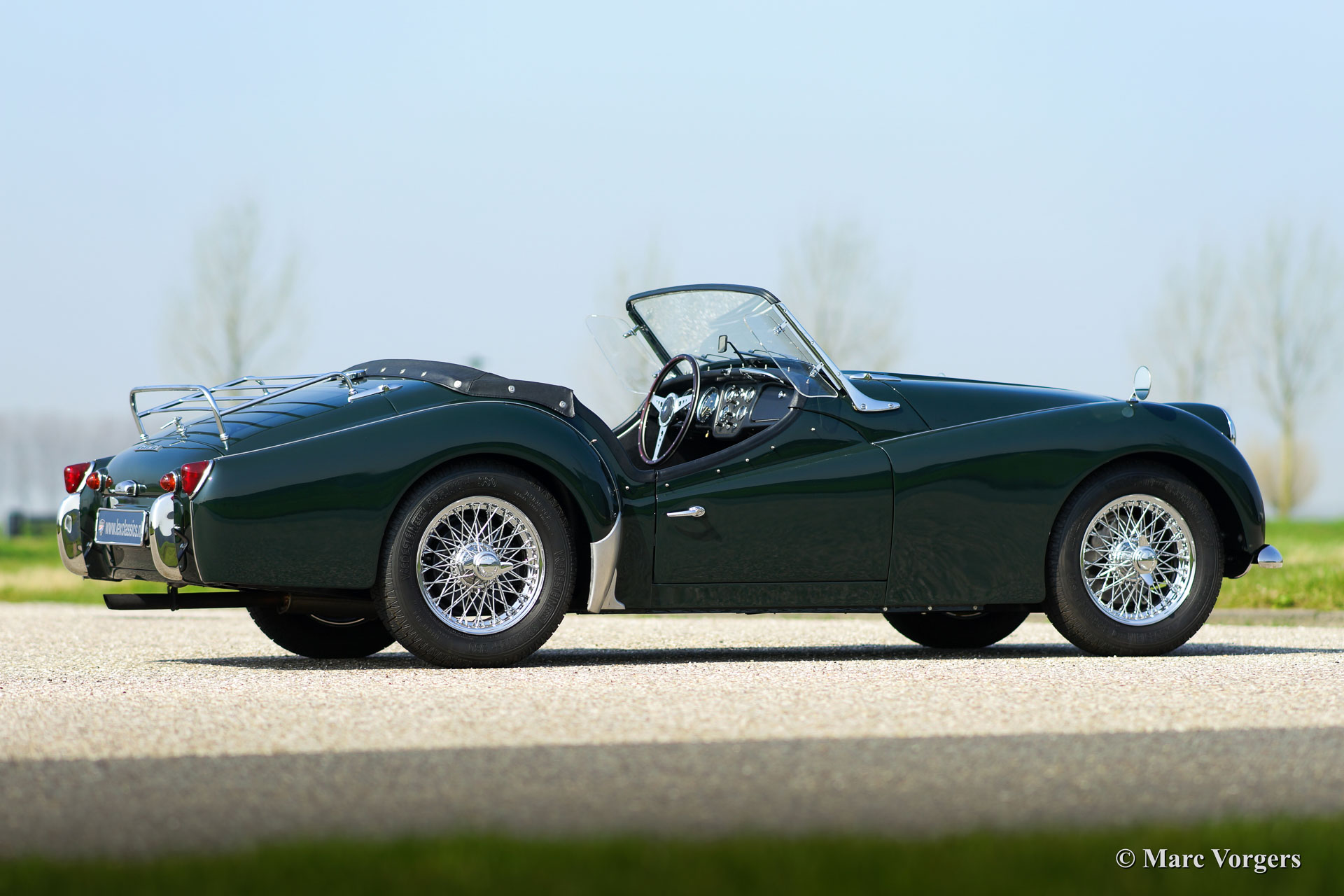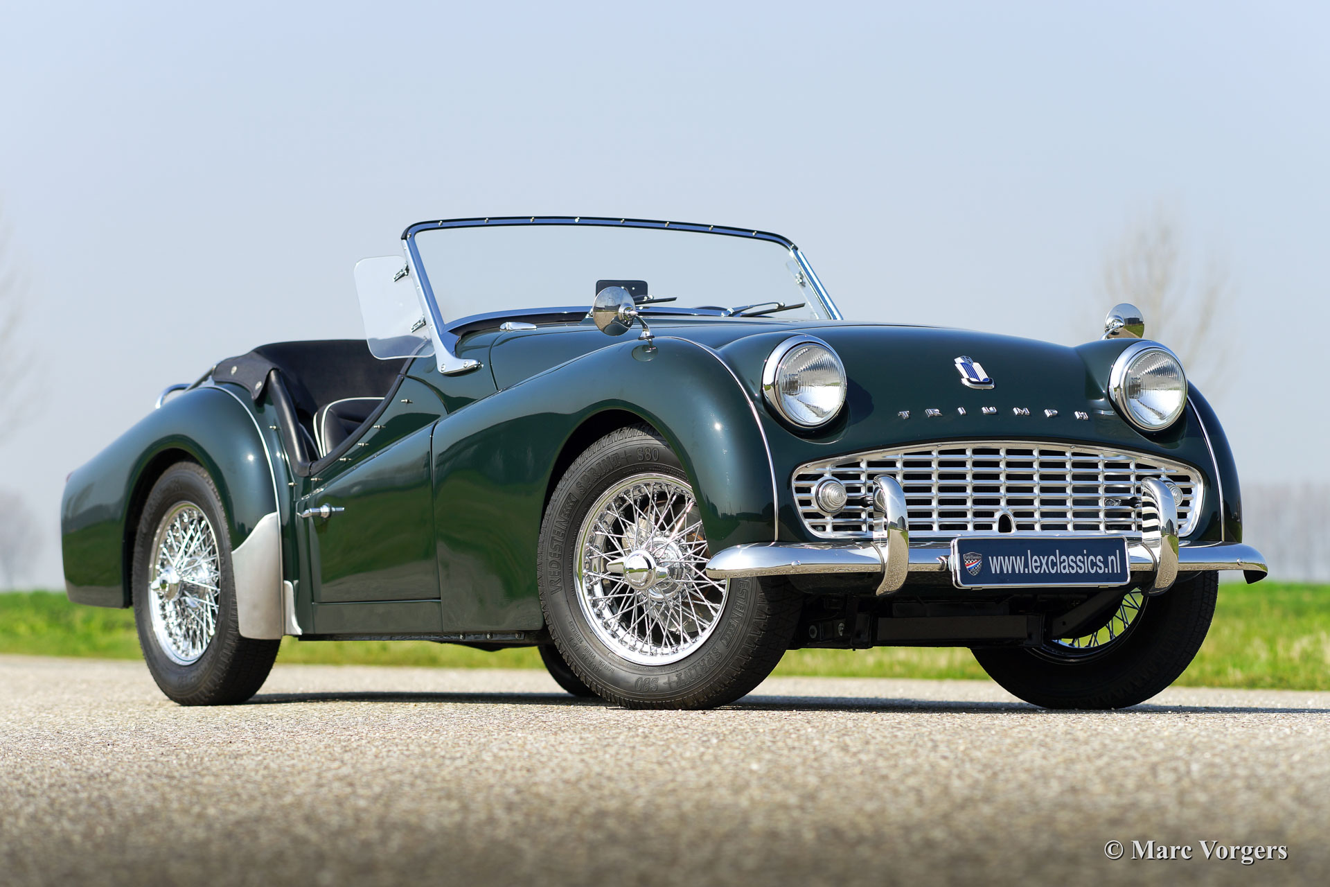 Triumph TR 3a, Jahr 1959 Farbe dunkel British Racing Green, schwarze Lederausstattung getrimmt mit weißem Keder. Schwarzes Verdeck, schwarzen Vinyl-Verdeckabdeckung, schwarz Mohair Persenning (tonneau cover). Dieses schöne Triumph Tr 3A wurde vor einigen Jahern weitgehend restauriert. Das Auto ist in einem hervorragenden Zustand! Das Auto ist ausgestattet met Chrom Speichenräder, Chrom 'knock-off' Rad-Muttern, Vredestein (Classic Sprint) Reifen, 2 Aussen-Rückspiegel, elektrische Kenlowe Lüfter, schwarzen Seitenfenster, eine Holz umrandeten Lenkrad, Wechselstrom Dynamo, 123 elektronische Zündung, ein Edelstahl-Gepäckträger und ein leichtgangiges modernes Lenkgetriebe.