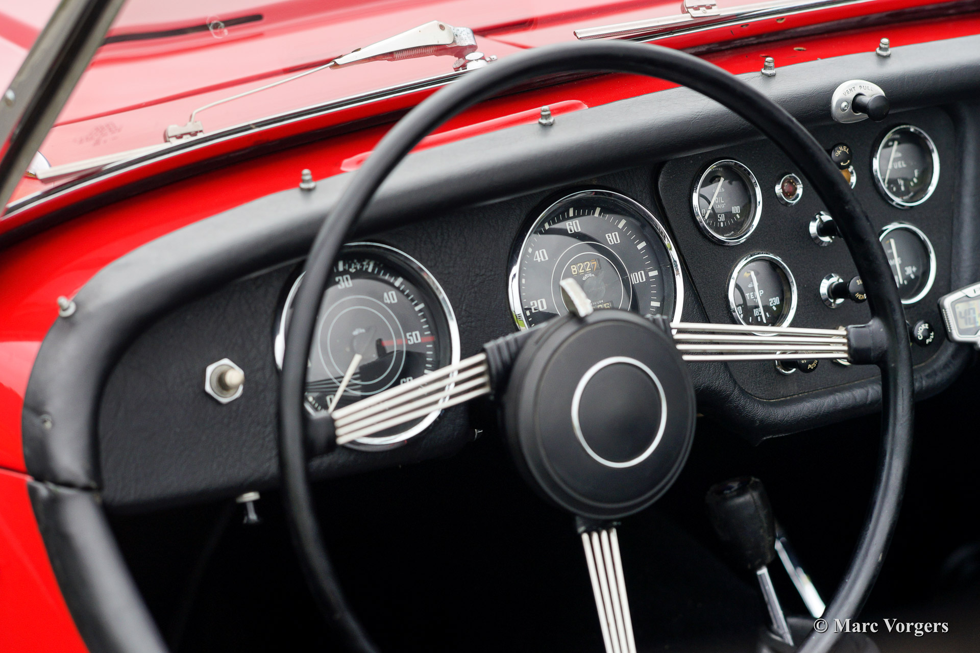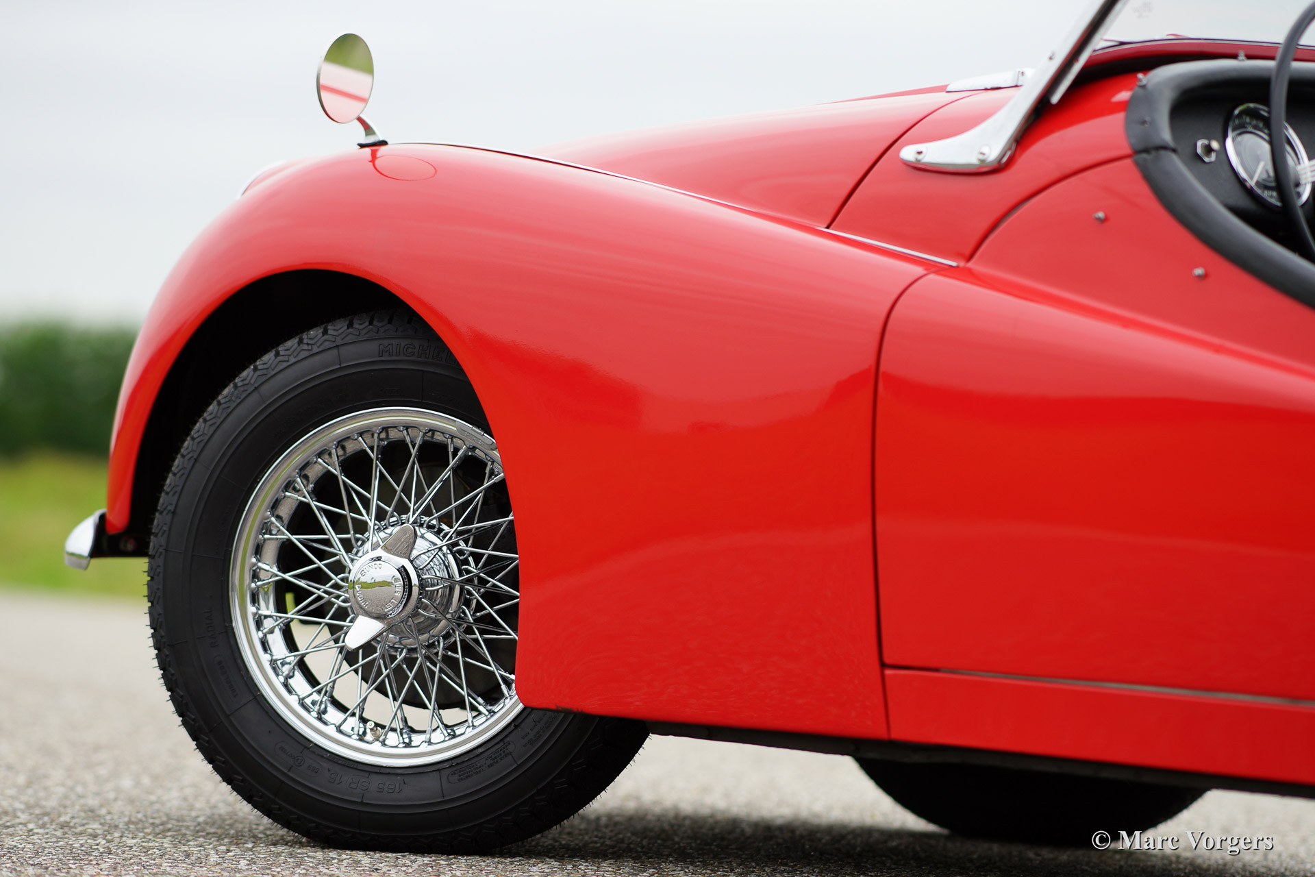 The Triumph TR 3 is a no nonsense sports car; very robust, simple and reliable, a true British sports car all over. The TR 3 was the first production car, off factory, equipped with disc brakes on the front-wheels. The engine was a Standard Vanguard based, cast-iron, long stroke, in-line four cylinder with a displacement of 1991cc. The TR 3 engine was equipped with two carburettors giving a power-output of almost 100 bhp.