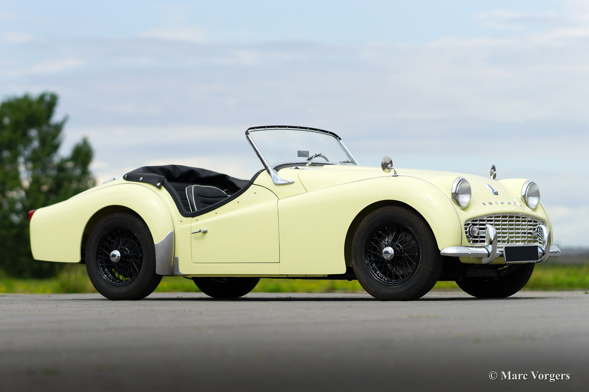 Triumph TR 3a, Jahr 1959. Fahrgestellnummer TS514XXX, Motornummer TS5153XX, ‚matching numbers‘. Farbe 'Primrose' gelb mit einer schwarzen Lederausstattung getrimmt mit weißen Keder. Schwarzes Verdeck, Persenning (tonneau cover) und Seitenteilen. Dieser fantastische Triumph TR 3a wurde umfangreich "body off" restauriert in den Jahren 2011 und 2012. Das Auto top-Zustand, concours! Seit der Restaurierung hat das Auto nur 1000 km gefahren. Diese Schönheit ist ausgestattet mit schwarze Speichen Räder, Overdrive, elektronische Zündung, Elektrolüfter und ein AC-Dynamo.