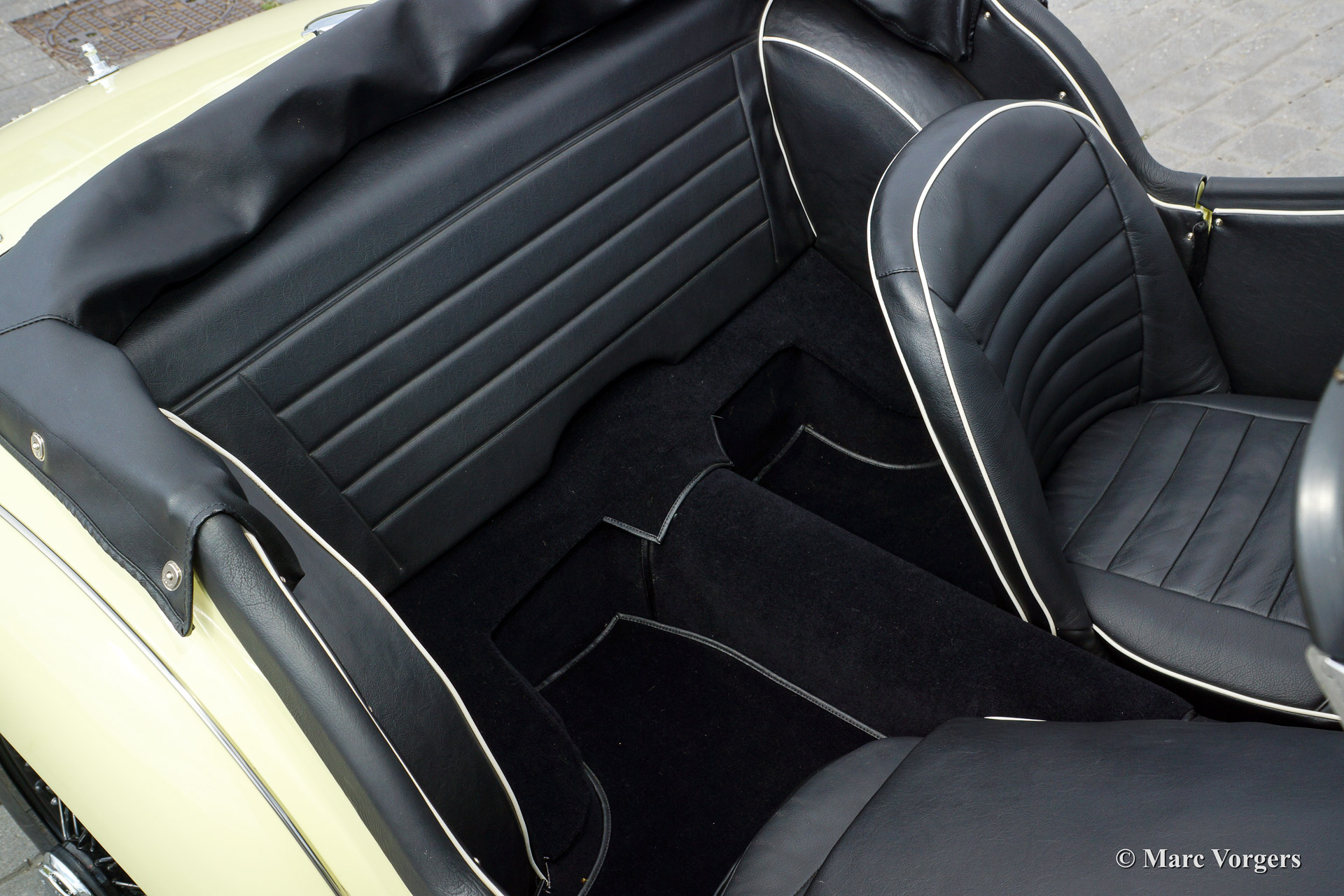 The Triumph TR 3 was uprated twice during the entire production period. In 1957 the car became a wider grille, door handles on the outside and slightly recessed headlamps and was named TR 3a then. In 1960-61 the cylinder capacity was enlarged to 2138 cc. giving a capacity of 104 bhp. and extra torque. Also the fully synchronized TR4 gearbox was incorporated. The car was then named TR 3b. The TR 3 is a pure two-person roadster, a classic generously giving you the fifties British sports car feeling, rough but honest. It comes with a simple soft-top for weather protection. Separate clip-on side screens can additionally be attached to the doors.