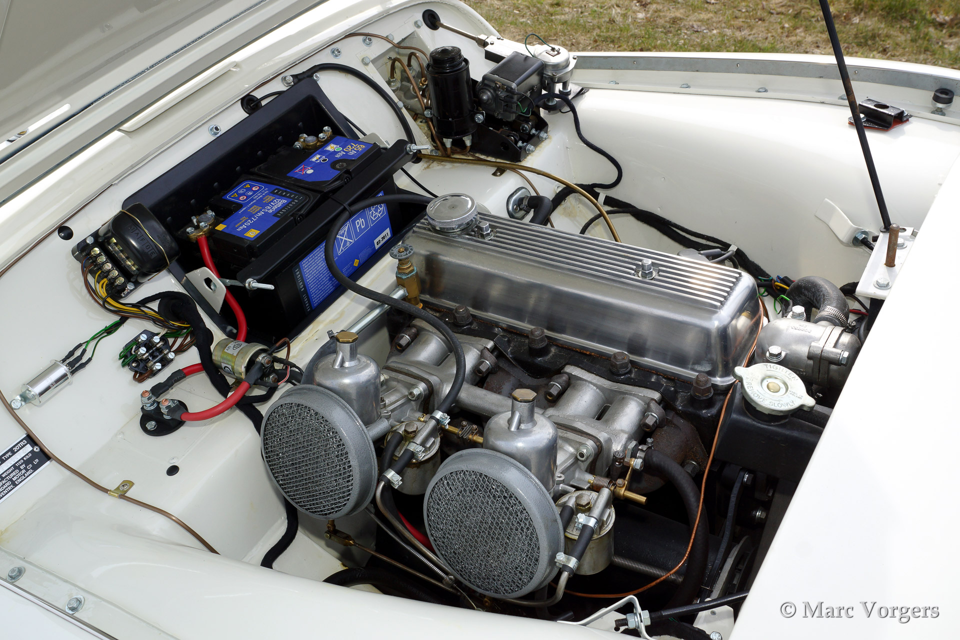 The Triumph TR 3 is a no nonsense sports car; very robust, simple and reliable, a true British sports car all over. The TR 3 was the first production car, off factory, equipped with disc brakes on the front-wheels. The engine was a Standard Vanguard based, cast-iron, long stroke, in-line four cylinder with a displacement of 1991cc. The TR 3 engine was equipped with two carburettors giving a power-output of almost 100 bhp.