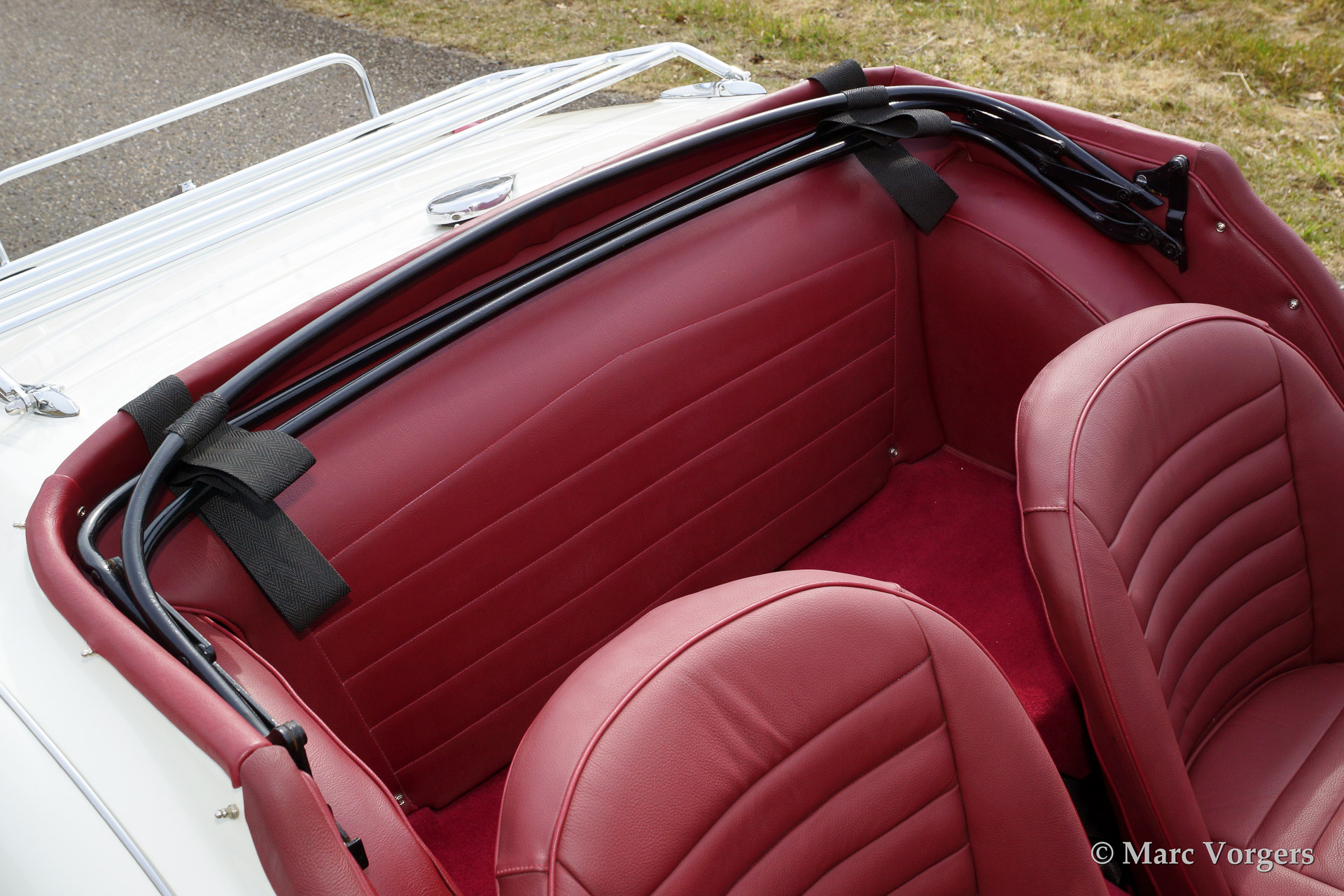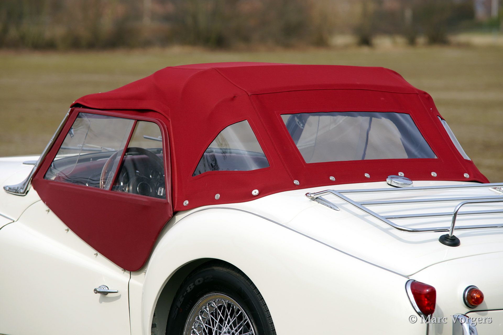 The Triumph TR 3 was uprated twice during the entire production period. In 1957 the car became a wider grille, door handles on the outside and slightly recessed headlamps and was named TR 3a then. In 1960-61 the cylinder capacity was enlarged to 2138 cc. giving a capacity of 104 bhp. and extra torque. Also the fully synchronized TR4 gearbox was incorporated. The car was then named TR 3b. The TR 3 is a pure two-person roadster, a classic generously giving you the fifties British sports car feeling, rough but honest. It comes with a simple soft-top for weather protection. Separate clip-on side screens can additionally be attached to the doors.