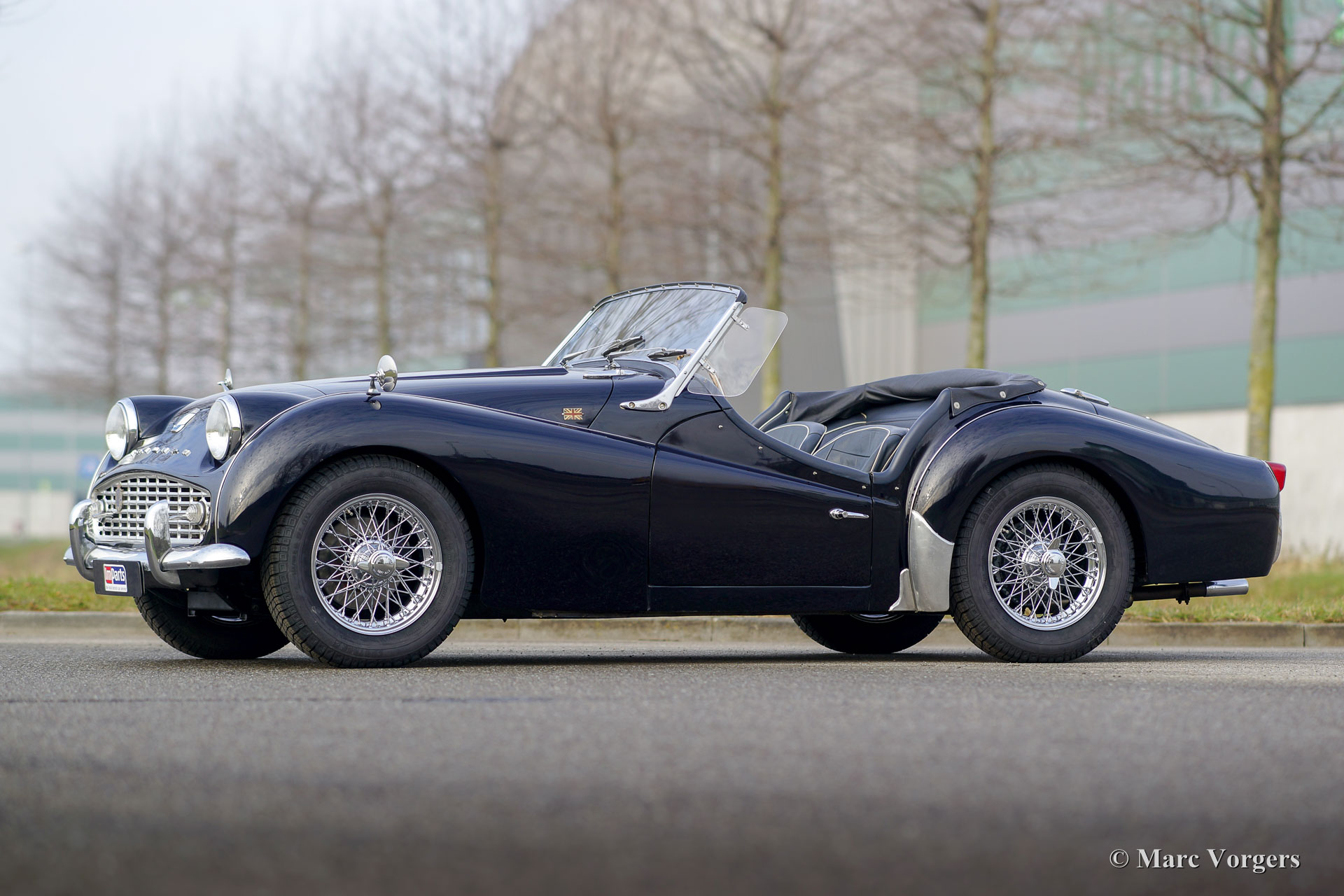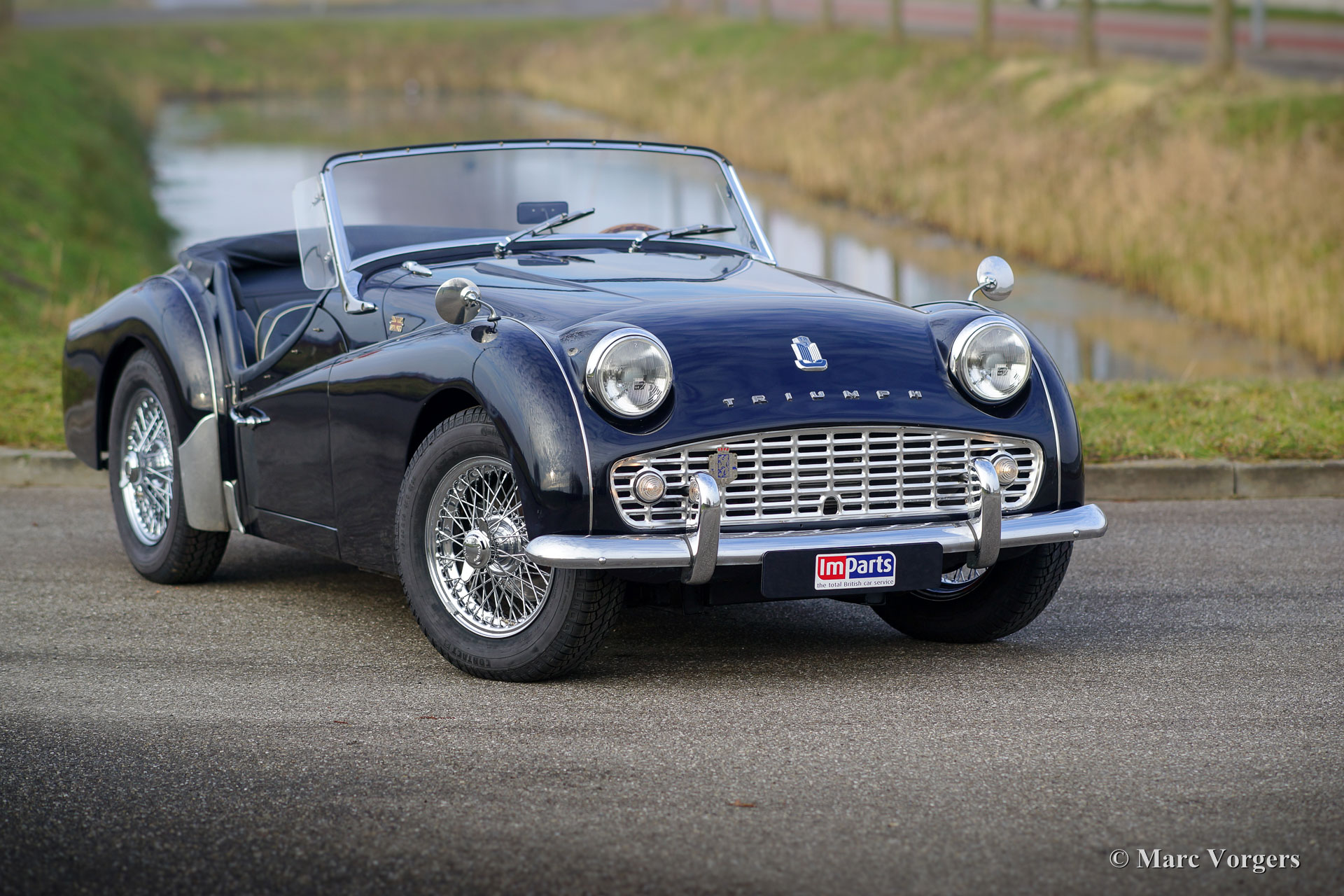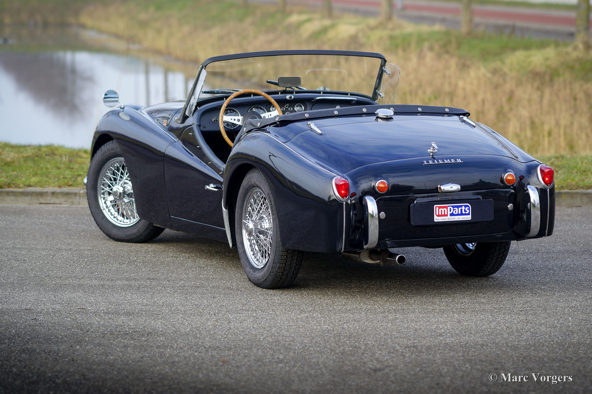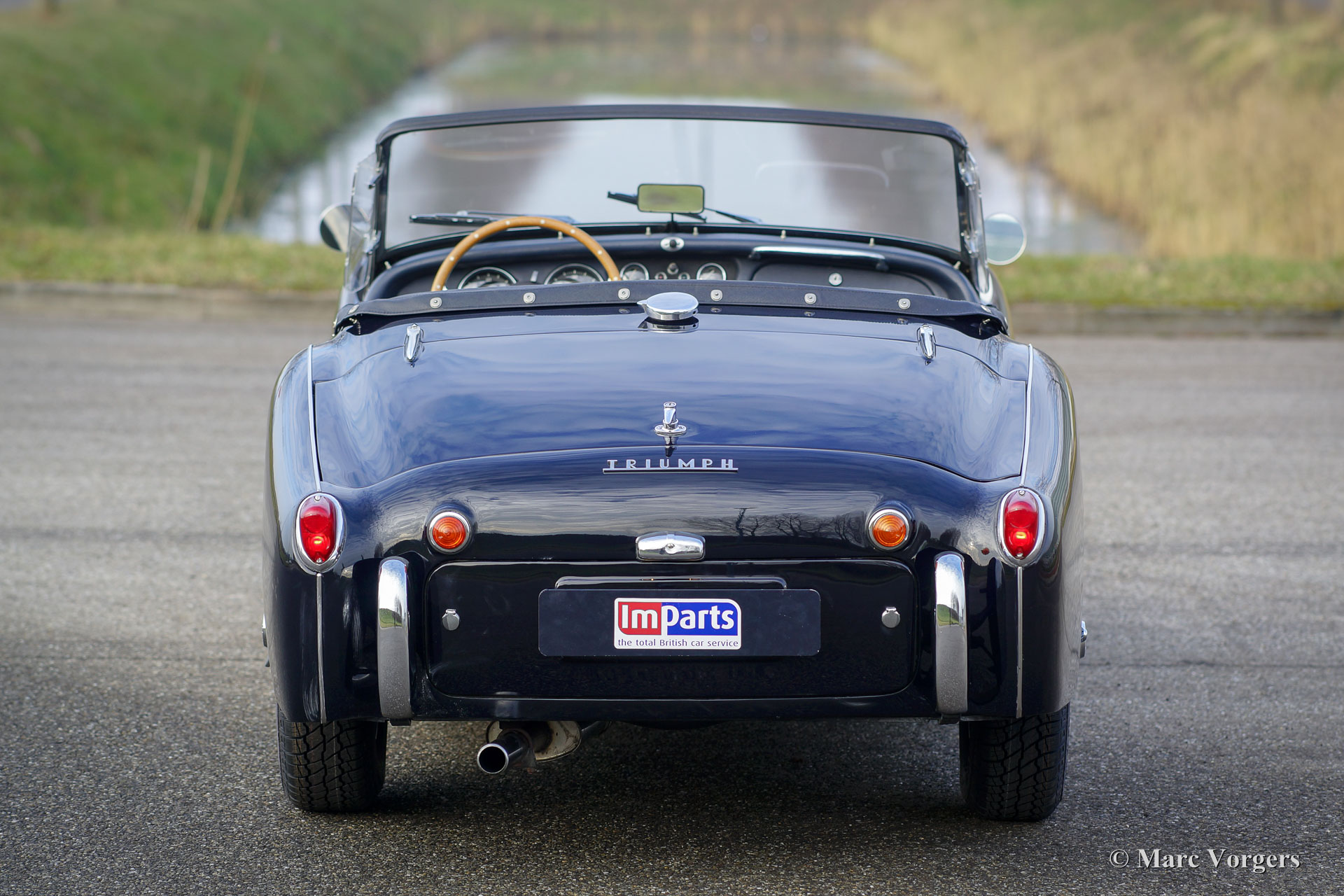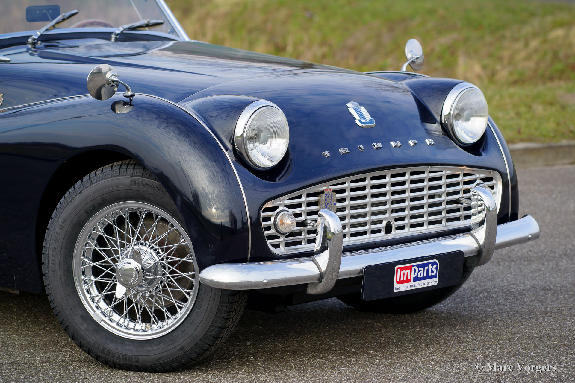 Triumph TR 3B, Jahr 1962. Farbe dunkelblau mit einem blauen Lederinterieur und dunkelblauem Teppich. Schwarzes Verdeck, Kapuze und Seitenfenster. Dieser fantastische Triumph TR 3B wurde neu in den USA verkauft. Der TR 3B ist ein seltenes Modell, das nur für den amerikanischen Markt produziert wurde. Der TR 3B wurde für Kunden entwickelt, die den Triumph TR 4 für zu modern hielten. Der TR 3B wurde mit dem 2138 ccm TR 4 Motor ausgestattet und nur etwa 3300 Exemplare wurden gebaut. Diese schöne Triumph TR 3B wurde in der Vergangenheit aufwändig restauriert, das Auto ist in einem sehr guten Zustand und das Auto fährt perfekt. Dieser TR 3B verfügt über ein schönes Sportlenkrad mit einem Holzkranz, neuen Chrom-Speichenräder und neuen Reifen. Dies ist eine seltene Triumph TR 3B in einem wunderschönen Zustand.