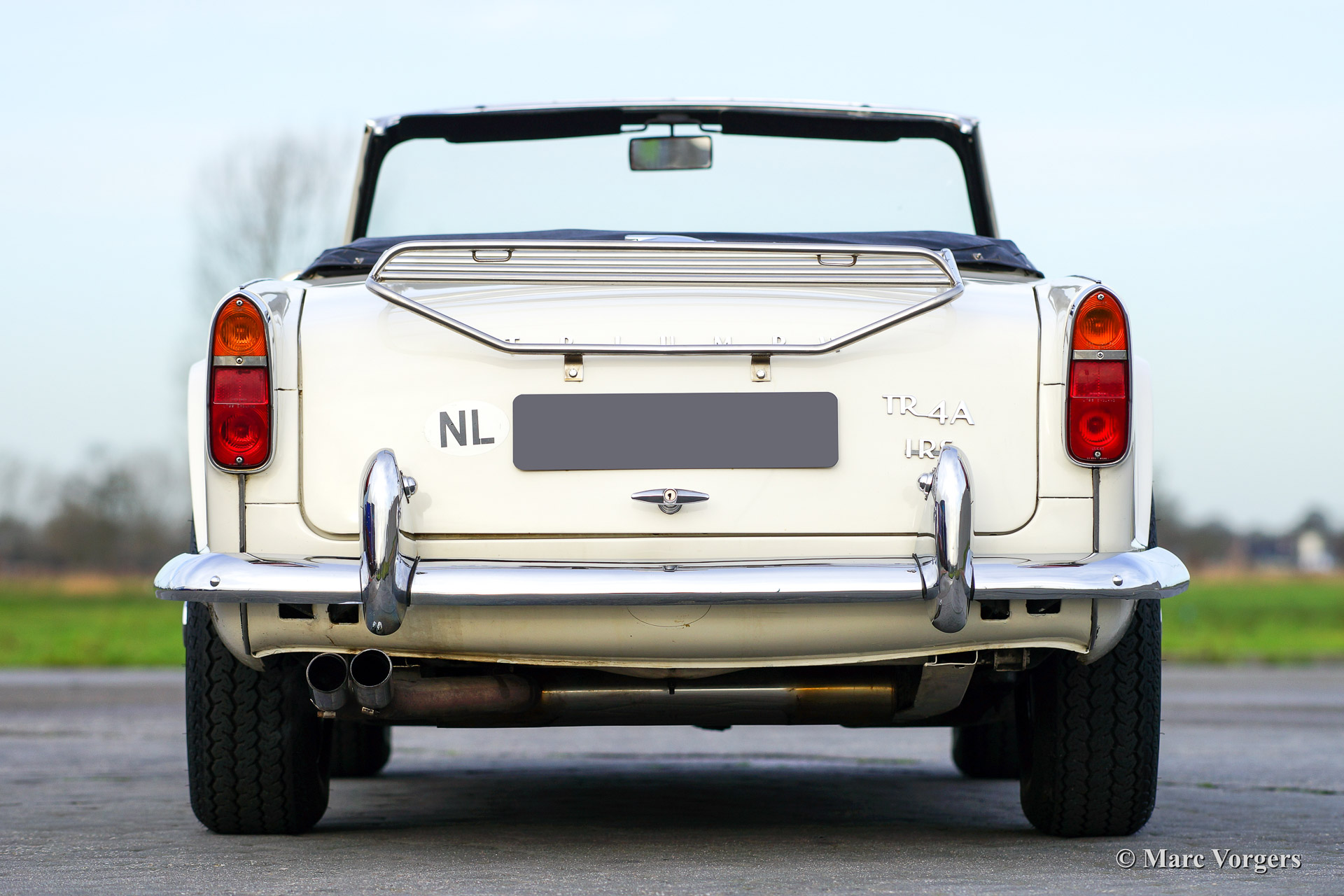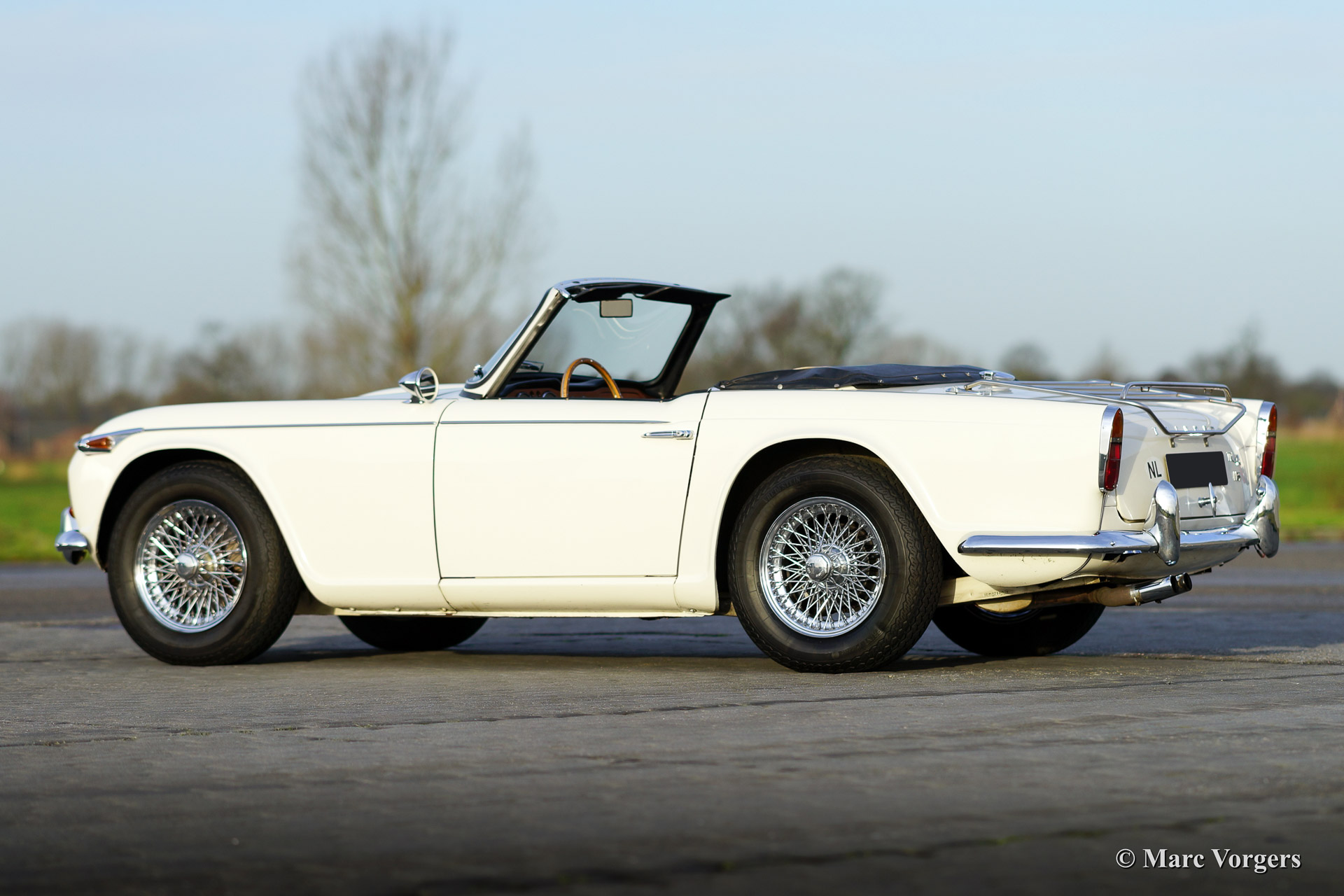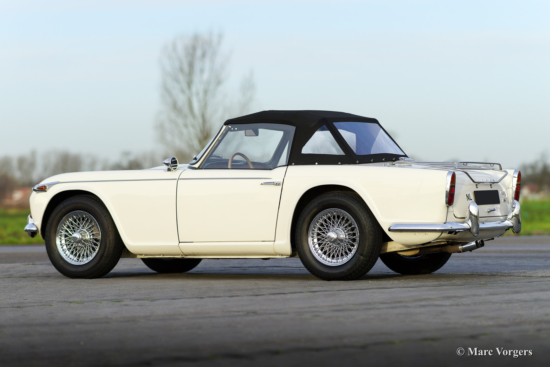 Triumph TR 4a IRS, Jahr 1967. Farbe weiß mit einem schwarzen Leder-Interieur getrimmt mit weißem Keder. Schwarzer Teppich und ein schwarzes Verdeck. Diese schöne Triumph TR 4a IRS (IRS meint Einzelradaufhängung hinten) wurde in 1991 von Frankreich in die Niederlanden importiert. Anschließend wurde das Auto umfangreich "body off" wieder hergestellt. Das Auto kannte nur ein Besitzer seit 1991. Der Eigner hat seit der Restaurierung 25.000 Kilometer mit das Auto gefahren. Dieser TR 4a IRS ist in einen sehr guten Zustand! Der Motor wurde ‚fast road‘ präpariert und versehen von zwei Weber doppel-Vergasern. Weiter ist das Auto ausgestattet mit ein neues Mohair-Verdeck, Overdrive, Chrom Speichen Räder, Chrom-Gepäckträger, ein Motolita Lenkrad mit Holzkranz, einen Klassischen Radio und ein Bremskraftverstärker. Ein herrlicher Klassiker!