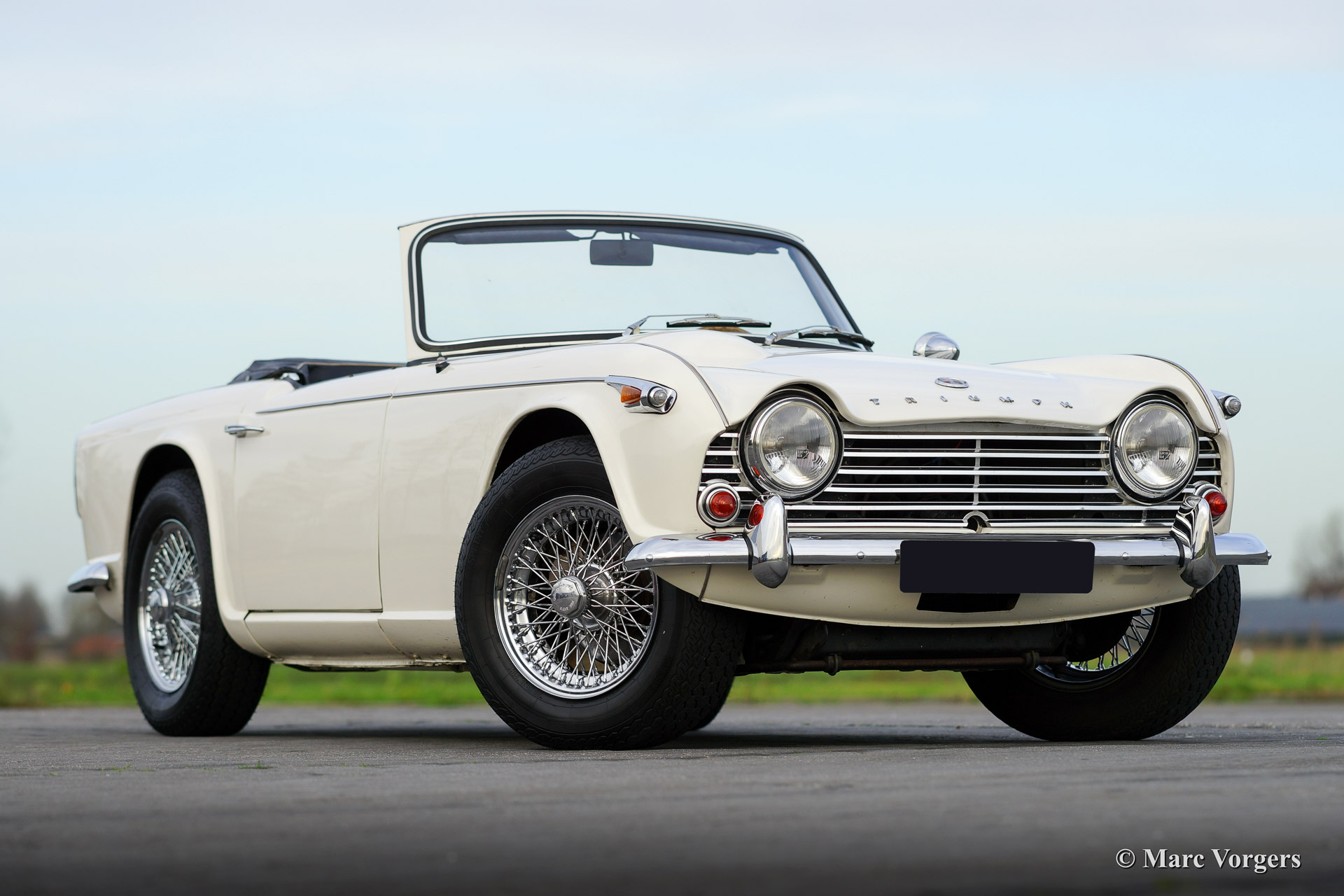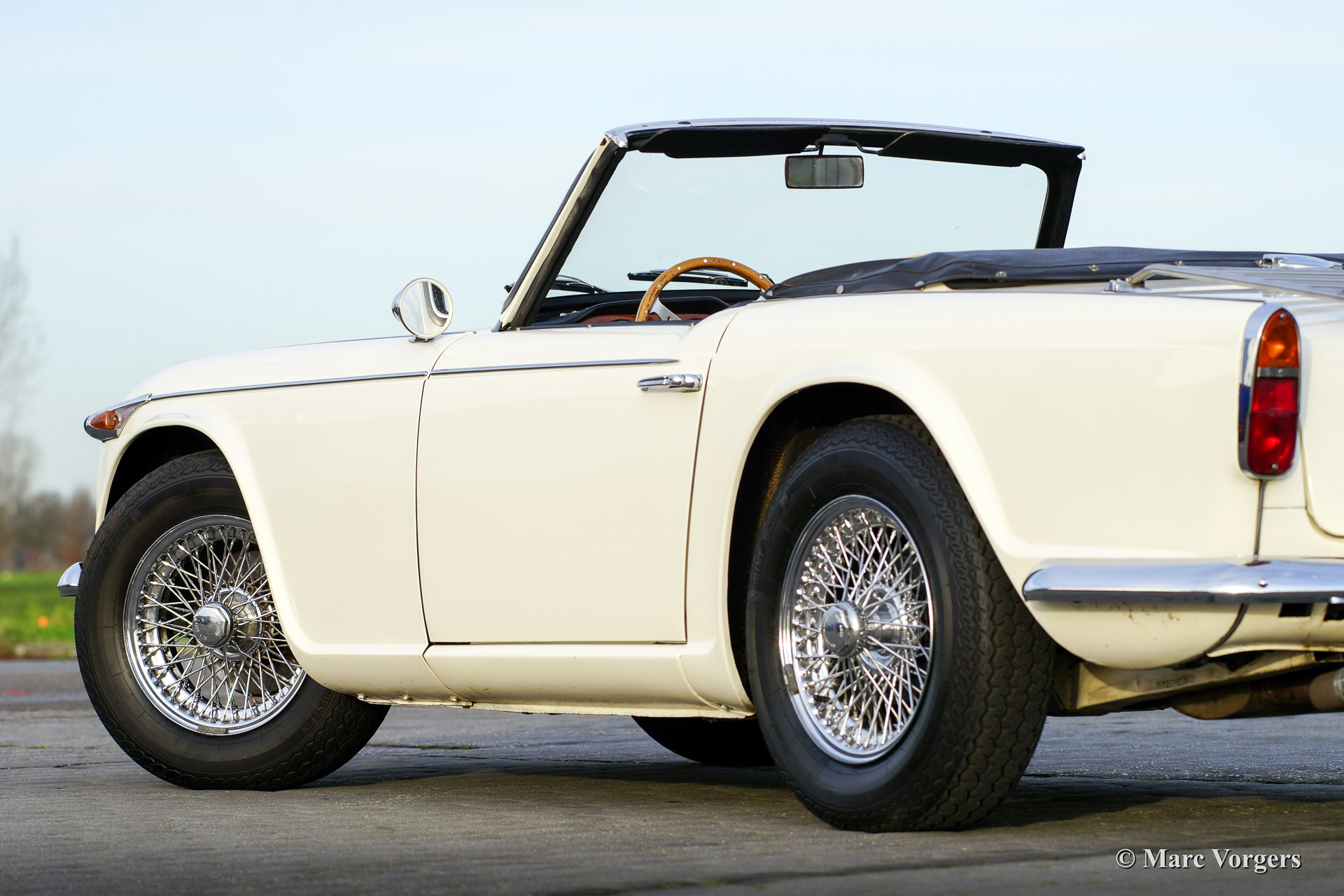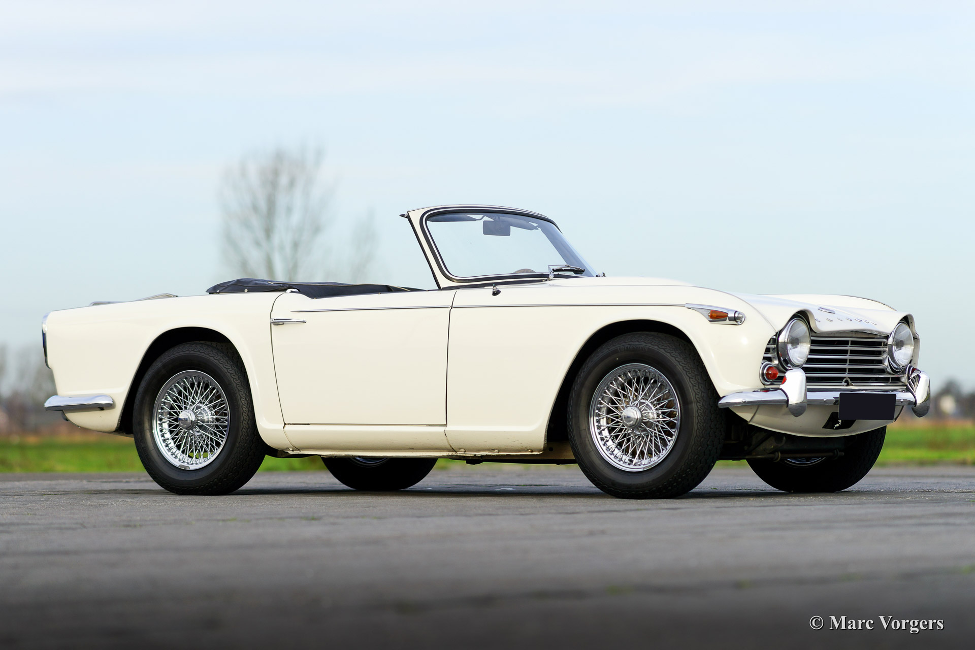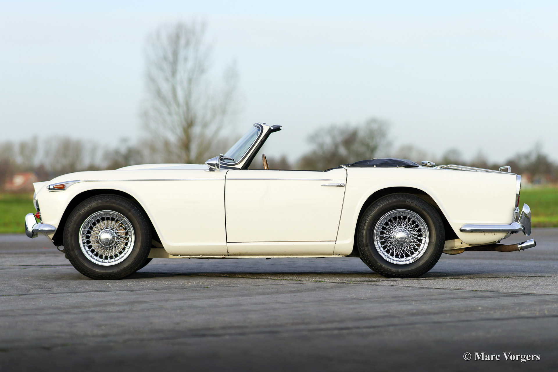 Triumph TR 4a IRS, Jahr 1967. Farbe weiß mit einem schwarzen Leder-Interieur getrimmt mit weißem Keder. Schwarzer Teppich und ein schwarzes Verdeck. Diese schöne Triumph TR 4a IRS (IRS meint Einzelradaufhängung hinten) wurde in 1991 von Frankreich in die Niederlanden importiert. Anschließend wurde das Auto umfangreich "body off" wieder hergestellt. Das Auto kannte nur ein Besitzer seit 1991. Der Eigner hat seit der Restaurierung 25.000 Kilometer mit das Auto gefahren. Dieser TR 4a IRS ist in einen sehr guten Zustand! Der Motor wurde ‚fast road‘ präpariert und versehen von zwei Weber doppel-Vergasern. Weiter ist das Auto ausgestattet mit ein neues Mohair-Verdeck, Overdrive, Chrom Speichen Räder, Chrom-Gepäckträger, ein Motolita Lenkrad mit Holzkranz, einen Klassischen Radio und ein Bremskraftverstärker. Ein herrlicher Klassiker!