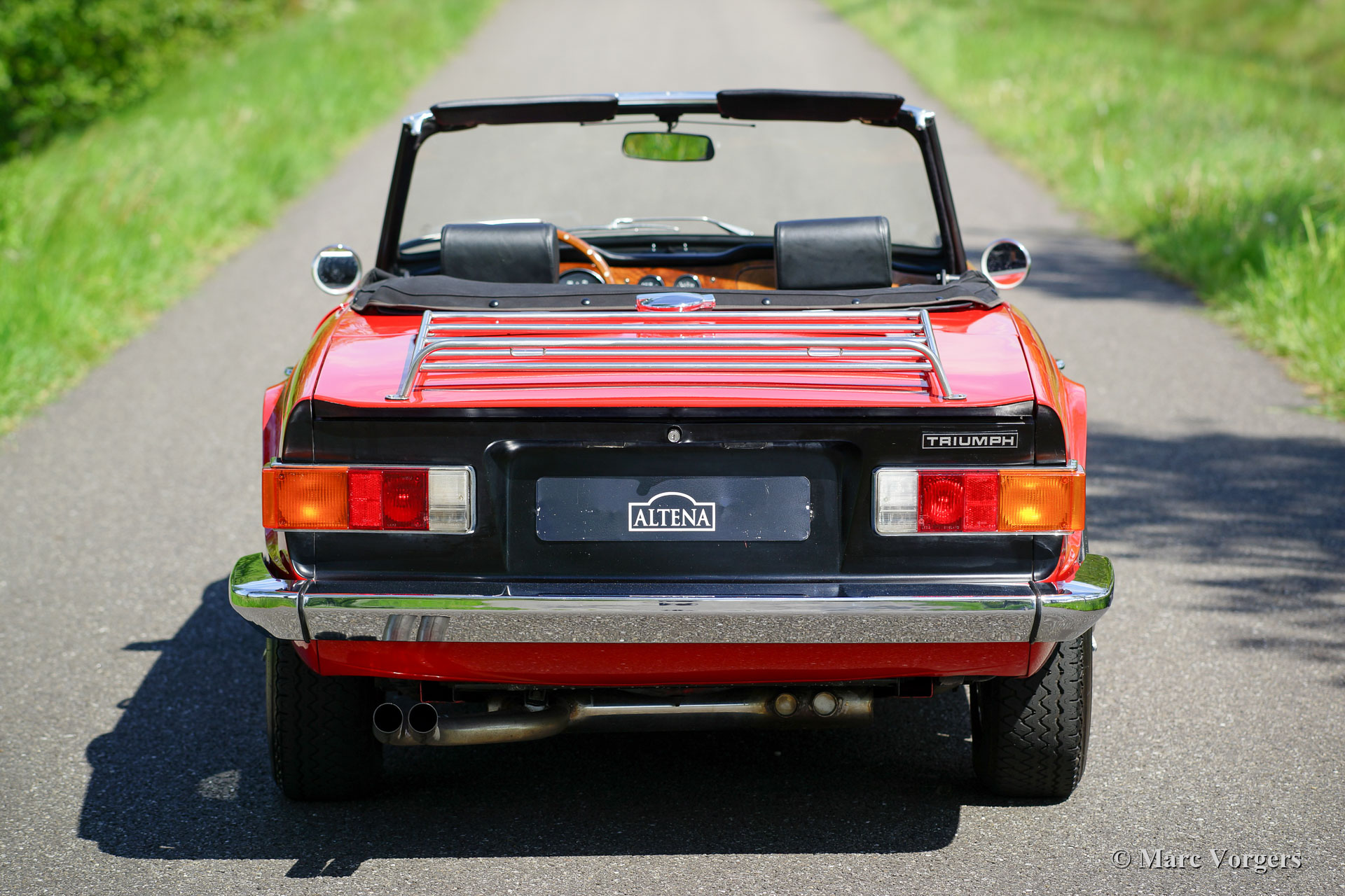 Triumph TR 6, Jahr 1973. Farbe rot mit einer schwarzen Lederausstattung und schwarzen Teppich. Schwarzes Mohair-Verdeck und Verdeck-Abdeckung. Dieser fantastische Triumph TR 6 wurde Ende der 1990er Jahre in den Niederlanden umfassend restauriert zu Perfektion. Das Auto wurde anschließend perfekt gewartet und gepflegt; Dieser TR 6 ist in einem hervorragenden Zustand und das Auto fährt super! Der Sechszylinder-Reihenmotor läuft und klingt großartig! Die Karosserie hat eine schöne Passform der Blechpaneele, eine hervorragende Lackierung und brillante Chromteilen. Der Innenraum weist nur leichte Gebrauchsspuren auf. Das Auto ist ausgestattet mit Chrom-Speichenrädern, 185/15 Michelin-Reifen, Chrom ‘knock-off‘ Radmuttern, einem Nussbaum-Armaturenbrett, einem MotoLita-Lenkrad mit Holzkranz, ein Ventildeckel aus Aluminium, einer Gepäckablage aus Edelstahl und einer Edelstahl- Auspuff.