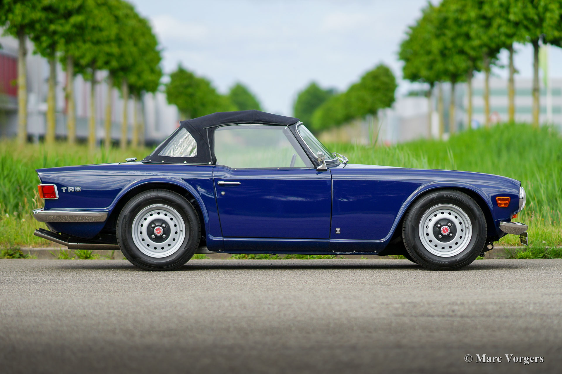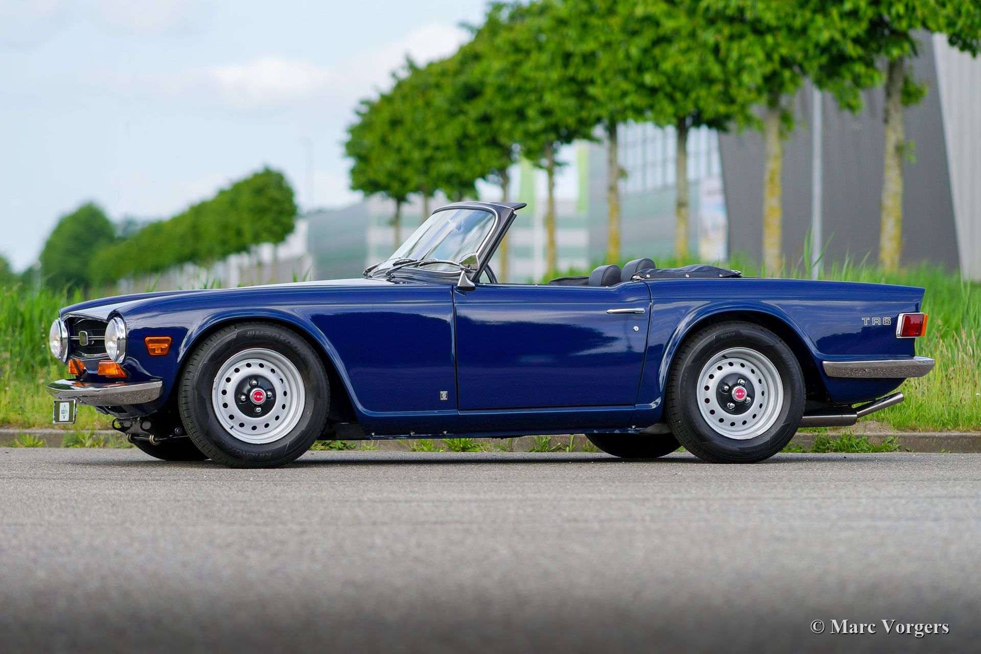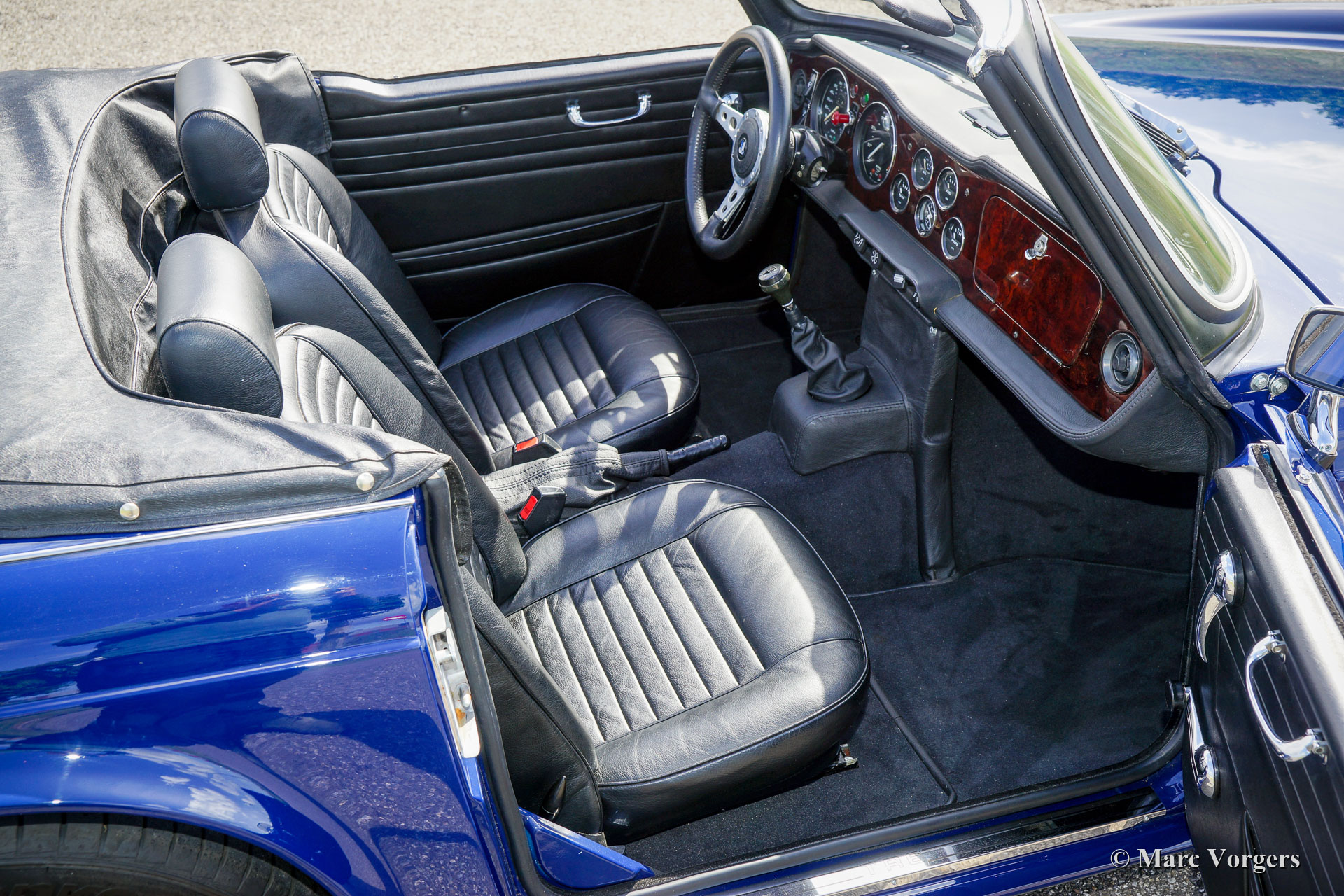 Triumph TR 6, Jahr 1973. Farbe Blau kombiniert mit einer schwarzen Lederausstattung mit anthrazitschwarzem Teppich. Schwarzes Mohair-Verdeck und ein schwarzer Vinyl-Verdeckbezug. Dieser fantastische Triumph TR 6 wurde kürzlich „body off“ restauriert und befindet sich in einem hervorragenden Top-Zustand! Ein vollständiger Fotobericht der Restaurierung ist vorhanden. Der Motor wurde für den Betrieb mit bleifreiem Benzin verbessert. Dieser feine TR 6 verfügt über Overdrive mit dem Aktivierungsschalter am Schaltknüppel. Außerdem ist das Auto mit zwei S.U. Vergaser, elektronische Zündung, ein stärkeres Bremsservo, ein Aluminiumkühler, Ölkühler mit Thermostat und ein Edelstahlauspuff versehen. Der Innenraum ist mit luxuriösen Materialien ausgestattet; Die Sitze und das Armaturenbrett sind mit schwarzem Leder bezogen. Das Armaturenbrett verfügt über eine Walnussholzplatte, eine zusätzliche Uhr und ein schönes MotoLita-Lenkrad mit Lederkranz. Dieser TR 6 ist außerdem mit zwei an der Tür montierten Edelstahl-Rückspiegeln, neuen Stoßfängern und robust-sportliche Stahlrädern mit schwarzen Radkappen ausgestattet. Dieser TR 6 ist in einem besseren Zustand als neu, ein fantastisches Fahrerauto für den Liebhaber von klassischer britischer Sportwagen!