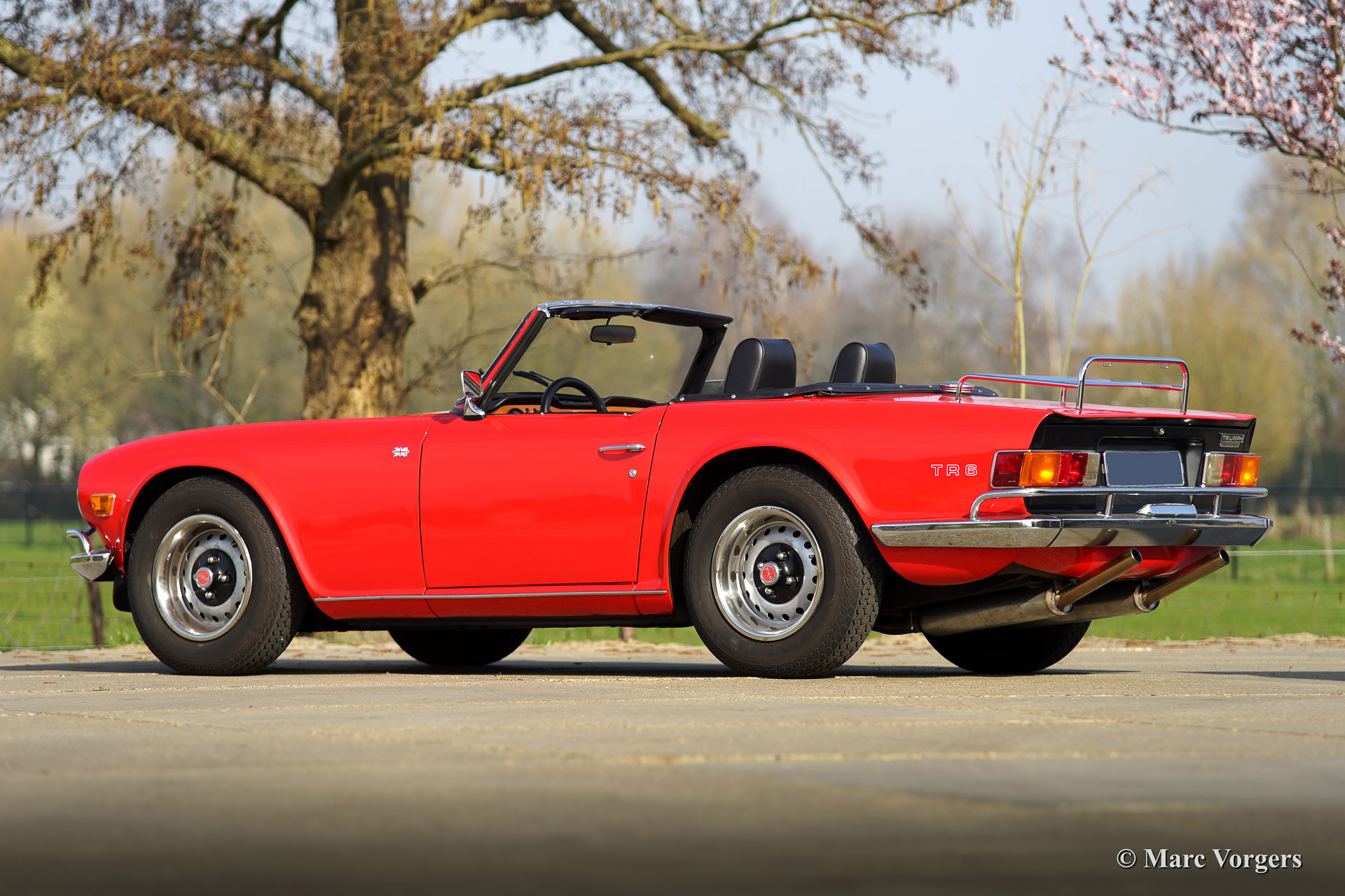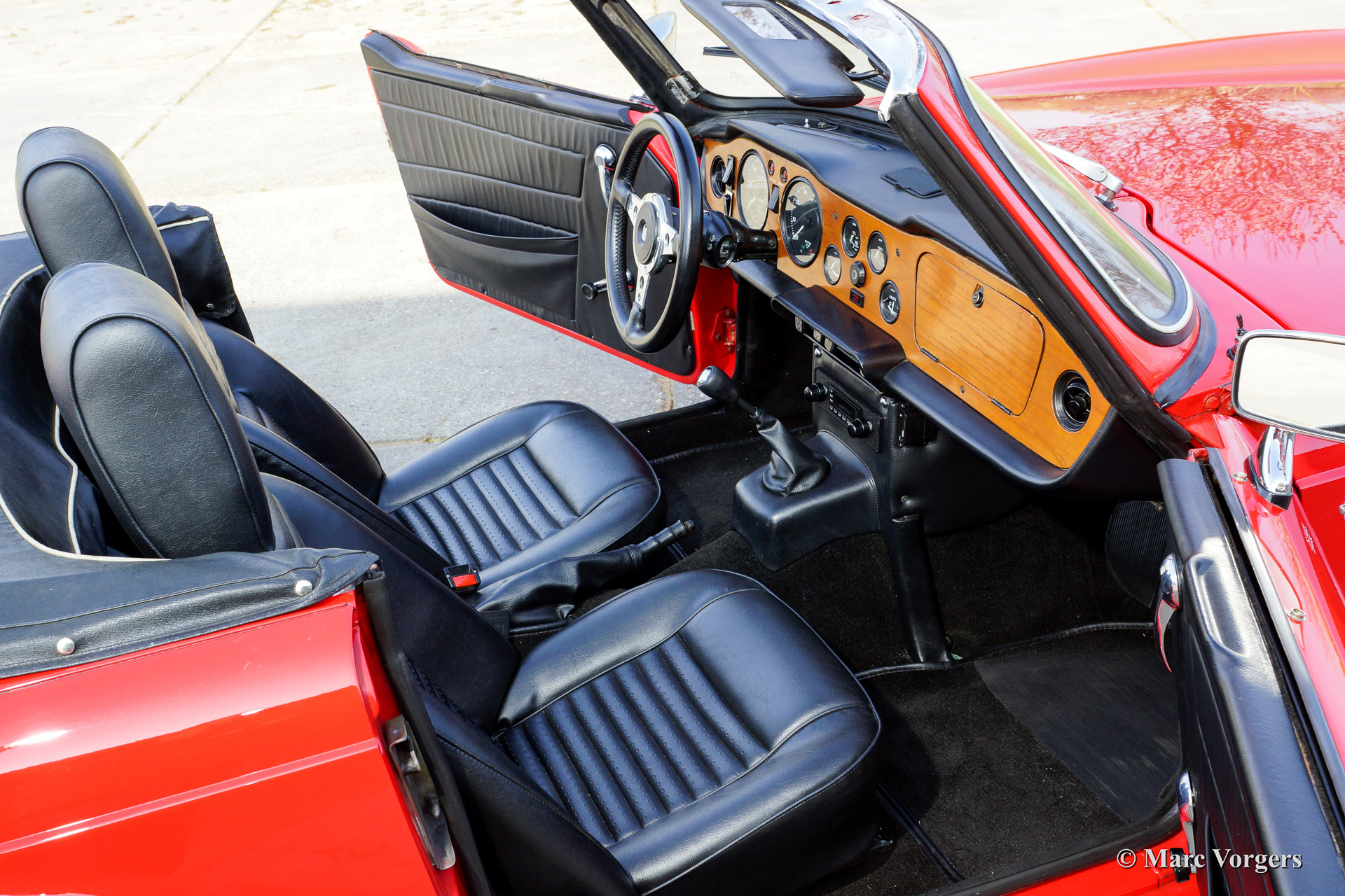 Triumph TR 6, model 1969, first registration 1974. Colour red with a black leather interior and a black soft top. This masculine Triumph TR 6 is in superb (excellent+) condition and the car drives fantastic! The automobile features a fast road tuned engine, new SU carburettors, sports air-filtres, overdrive, a Stainless Steel sports exhaust, and a chrome luggage rack.