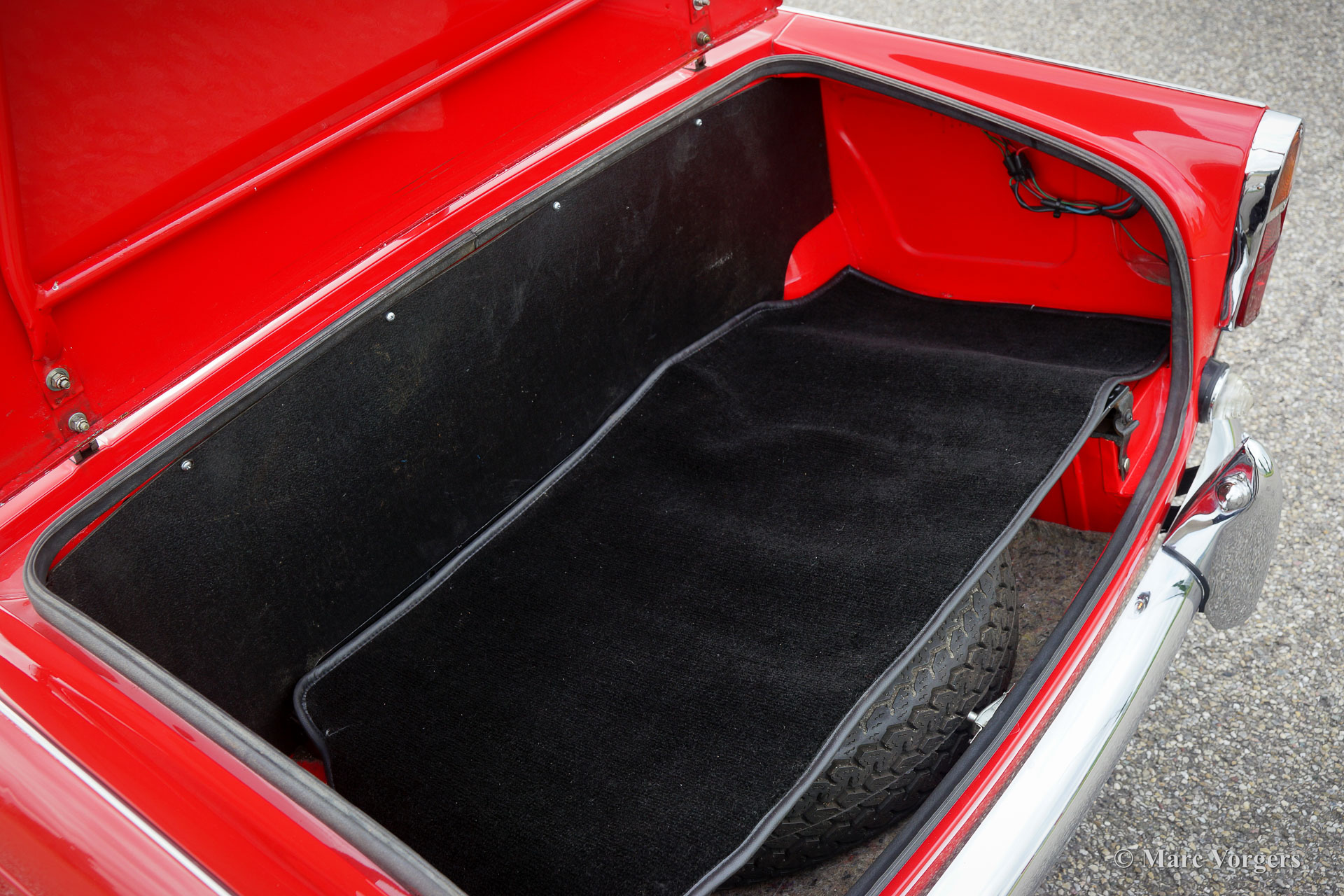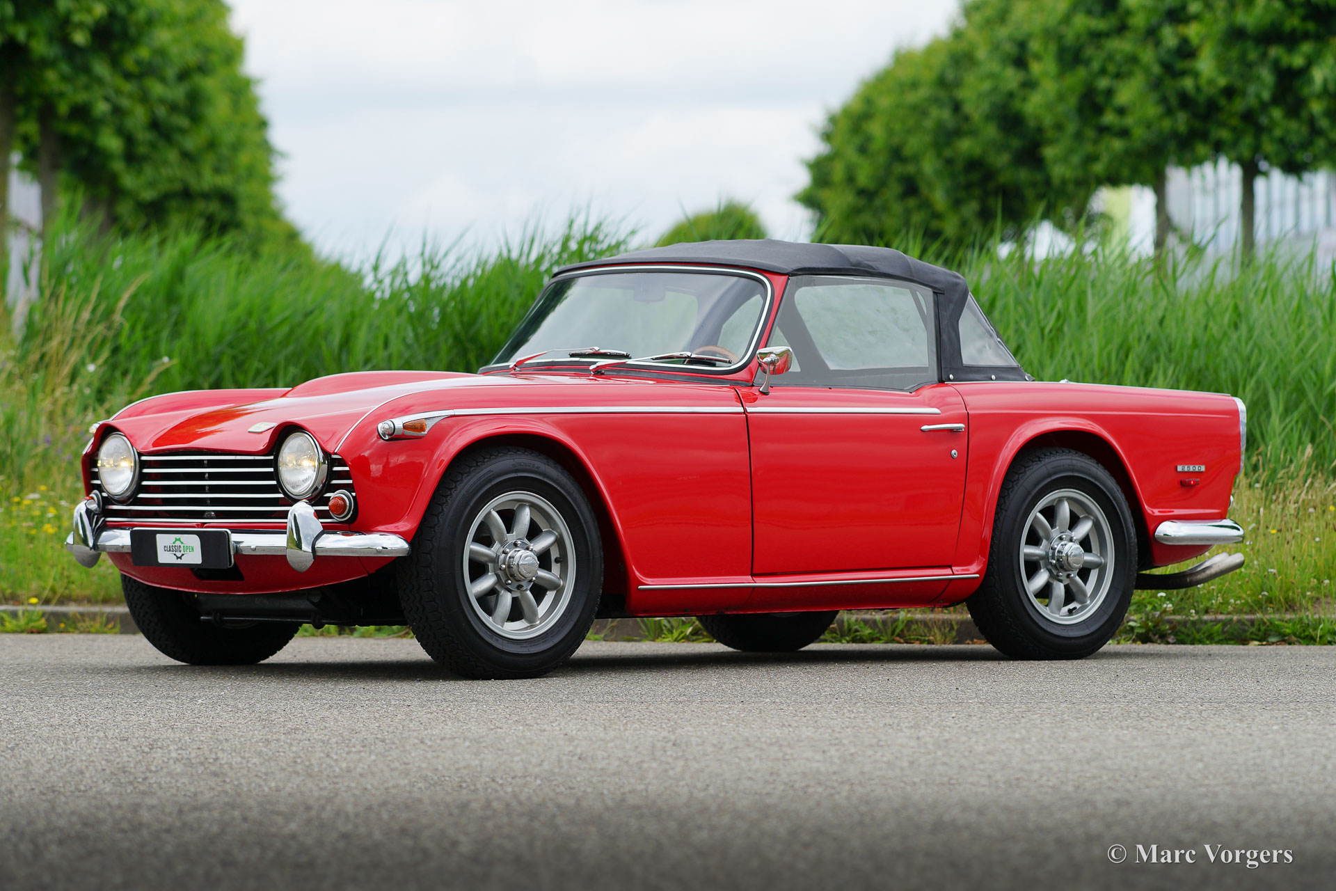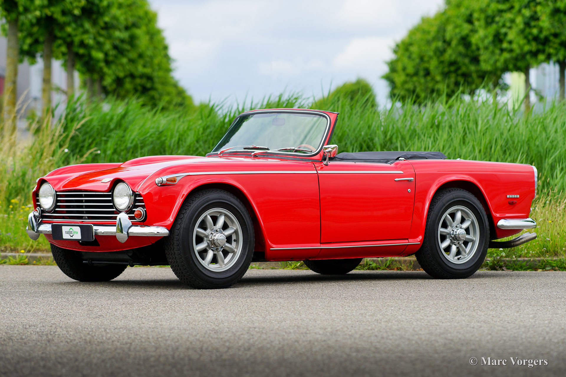 Triumph TR 5, Jahr 1968. Farbe Signalrot kombiniert mit einem schwarzen Innenraum getrimmt mit weißen Paspeln und schwarzem Teppich. Verdeck und Verdeck Abdeckung aus schwarzem Vinyl. Dieser seltene und wunderschöne Triumph TR 5 mit der Fahrgestellnummer 1CP166LP wurde 1967 in Belgien gebaut. Dies ist der erste TR 5, der in den Niederlanden verkauft wurde! Das Auto wird mit einer vollständigen Historiendatei geliefert. Dieser prächtige Triumph TR 5 wurde umfassend und „body-off“ restauriert und überholt, die Arbeiten wurden gemäß den ursprünglichen Werksspezifikationen durchgeführt. Ein Fotobericht und Rechnungen der Restaurierung sind vorhanden. Das Auto verfügt über den leistungsstarken (150 SAE PS) CP-Motor und Overdrive. Das umgebaute mechanische Lucas-Einspritzsystem ist jetzt mit einer Bosch-Kraftstoffpumpe und einem Kraftstofffilter ausgestattet. Das Auto ist ausgestattet mit wunderschönen Leichtmetallrädern im Minilite-Stil mit „Knock-On“-Radmuttern, Michelin 185-15-Reifen, einem Edelstahlauspuff und einem wunderschönen Sportlenkrad mit Holzkranz. Dies ist ein wunderbarer und sehr schwer zu findender originaler Triumph TR 5 in einem hervorragenden Zustand!
