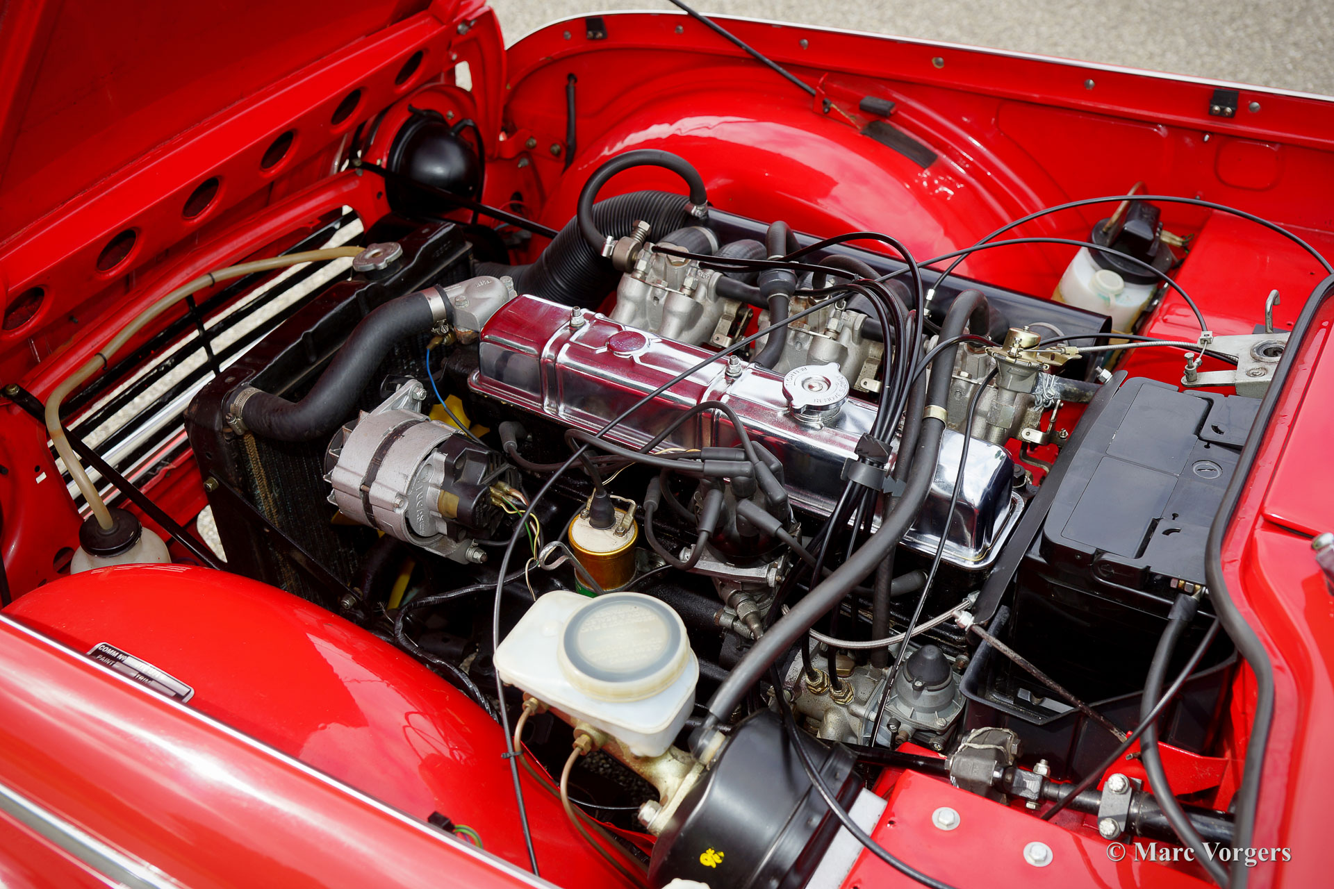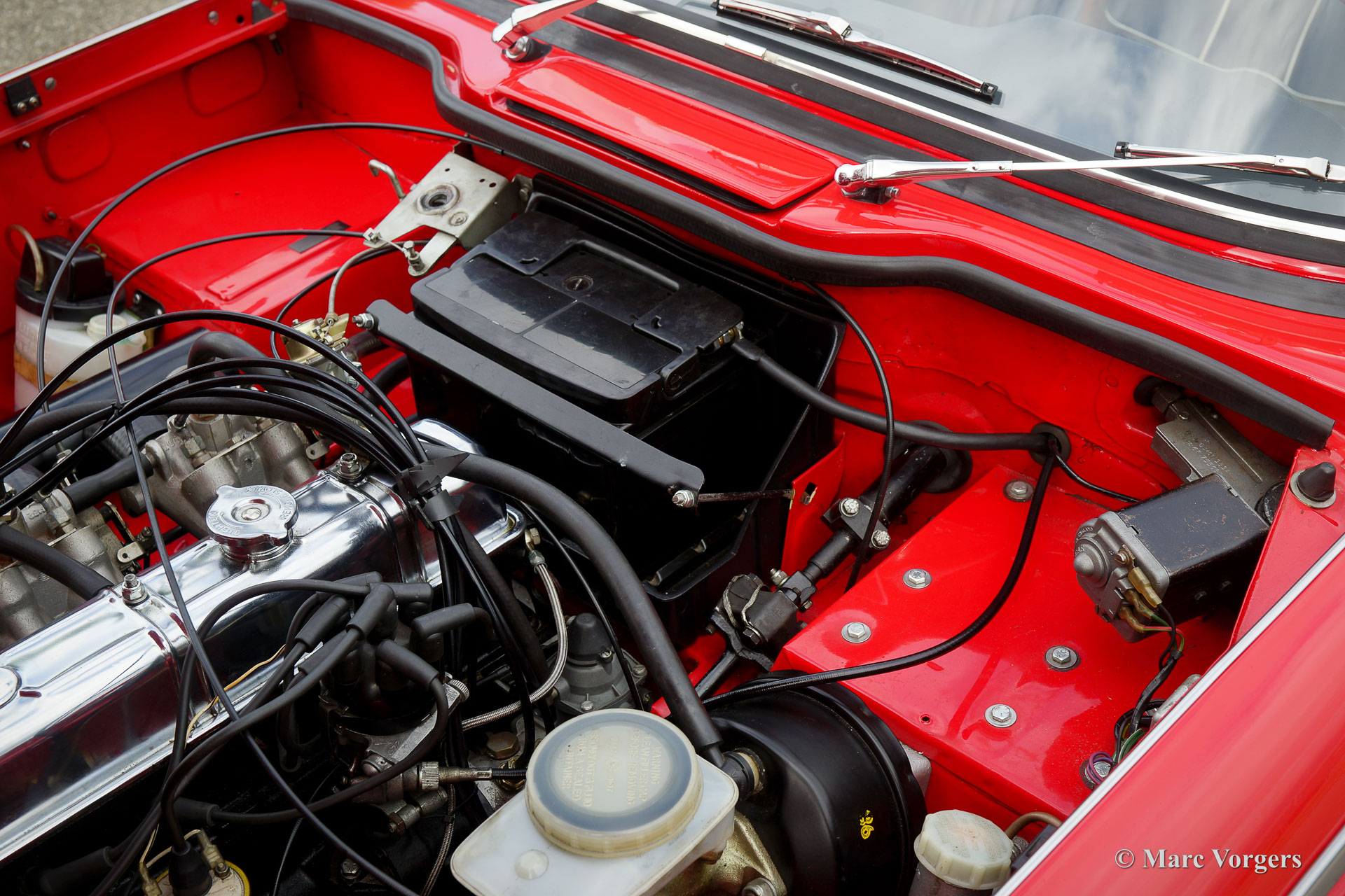 The six cylinder engine originally came from the Triumph 2000 saloon. For use in the TR 5 Triumph enlarged the cylinder capacity up to 2498 cc., fitted a more racy camshaft and petrol injection. Result was that they gained 60 bhp. to the standard engine, enough for the engine to be used in a sports car like the TR 5.